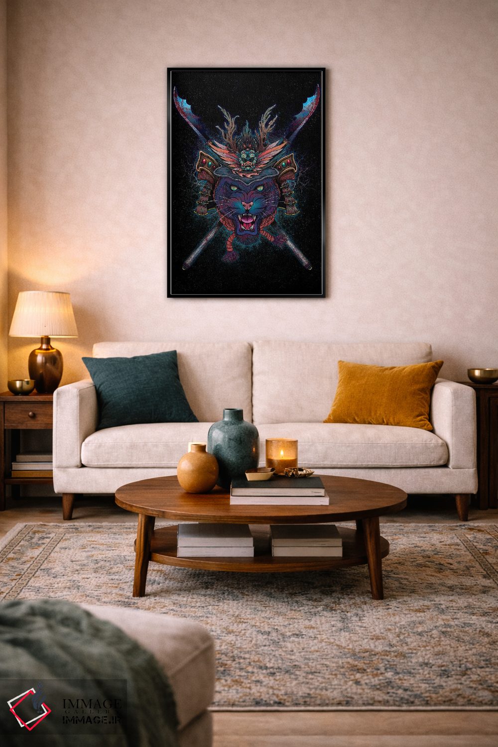براساس پالت ترکیبی اثر، قاب تیک گرم (چوبی) پیشنهاد اول است و مشکی مات (فریم متوسط) مکمل. برای سفارشهای پروژهای با ابعاد و قابهای اختصاصی با ایماژ در تماس باشید.