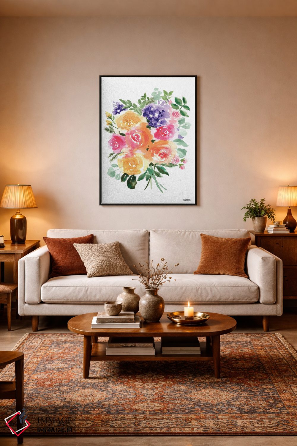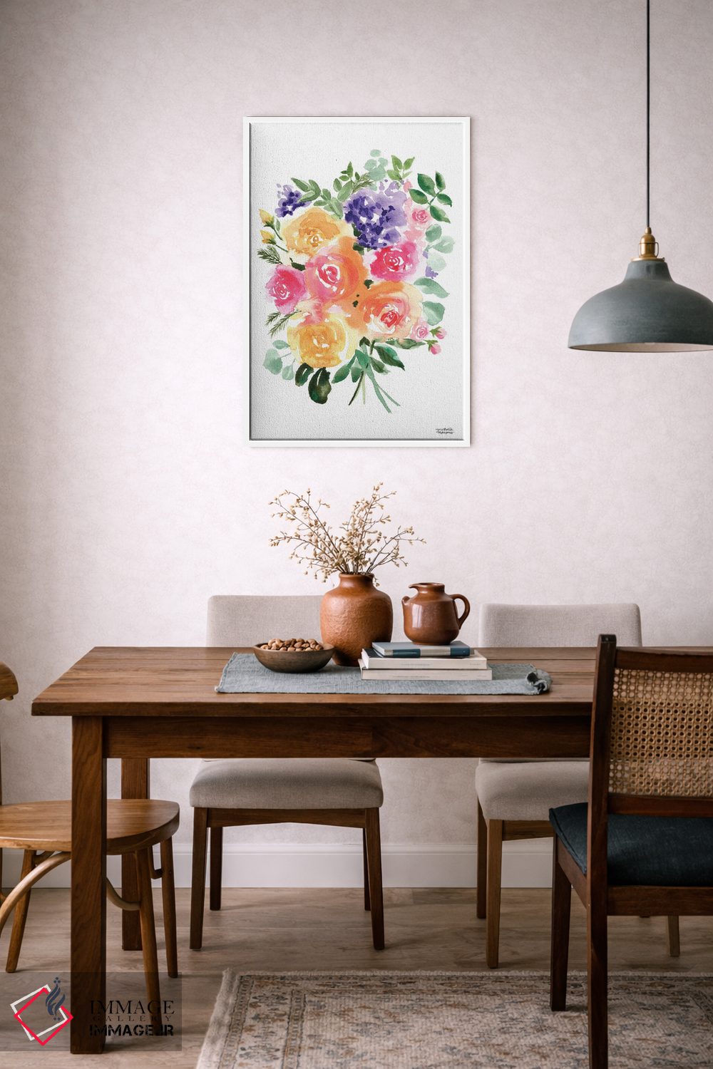برای اتاق خواب و نشیمنهای آرام، «دسته گل تابستانی آبرنگ» اثرِ «میشل موسپنس» به دیوار، روشناییِ ملایم و دلنشین میدهد؛ برای اتاق خواب انتخابی خوشسلیقه است. اگر دنبال «زیباییِ بیصدا» هستید، این اثر همان حس را دارد.