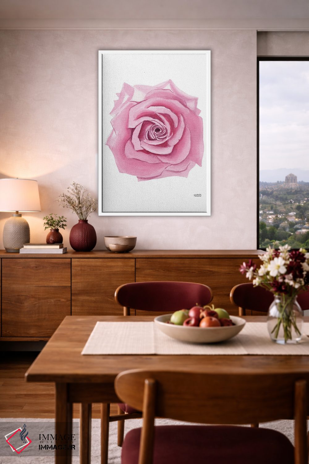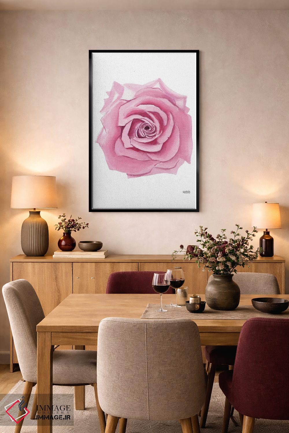 اگر محیط کمینهگرا است، صورتی را در گلدان یا آباژور کم و دقیق اضافه کنید تا فضا حرفهایتر به نظر برسد. انتخاب قاب هم میتواند این اکسنت را تقویت کند.