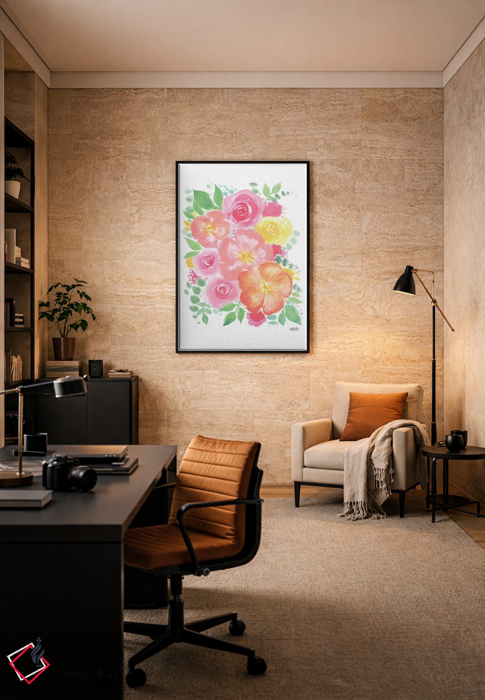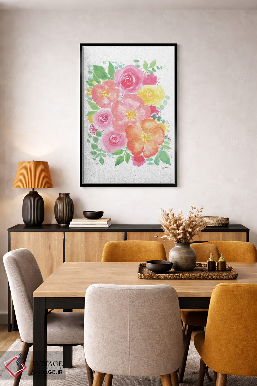 این اثر با عنوان «گلهای نارنجی آبرنگ (بازی با کلمات)» اثرِ «میشل موسپنس» حس فصل را آرام وارد فضا میکند؛ برای هدیه دادن انتخابی خوشسلیقه است. برای دیوار گالری هم ترکیبپذیر و خوشنشین است.