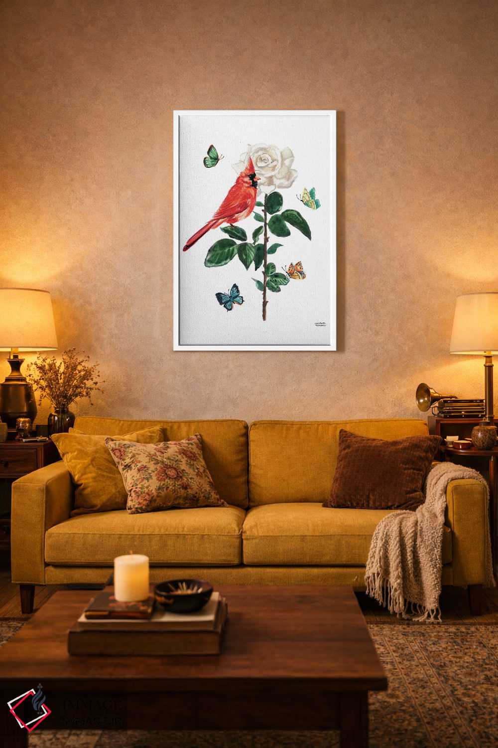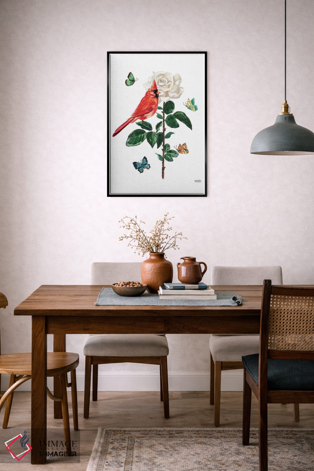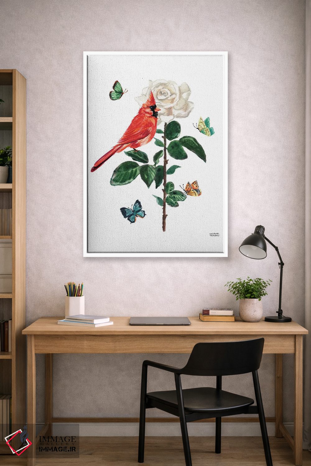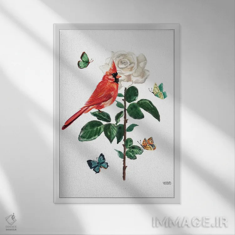 تابلو دکوراتیو پرنده کارباورال و گل رز آبرنگ اثر میشل موسپنس