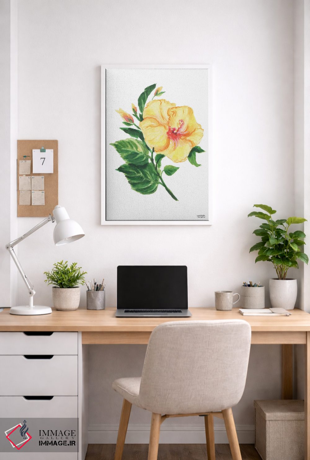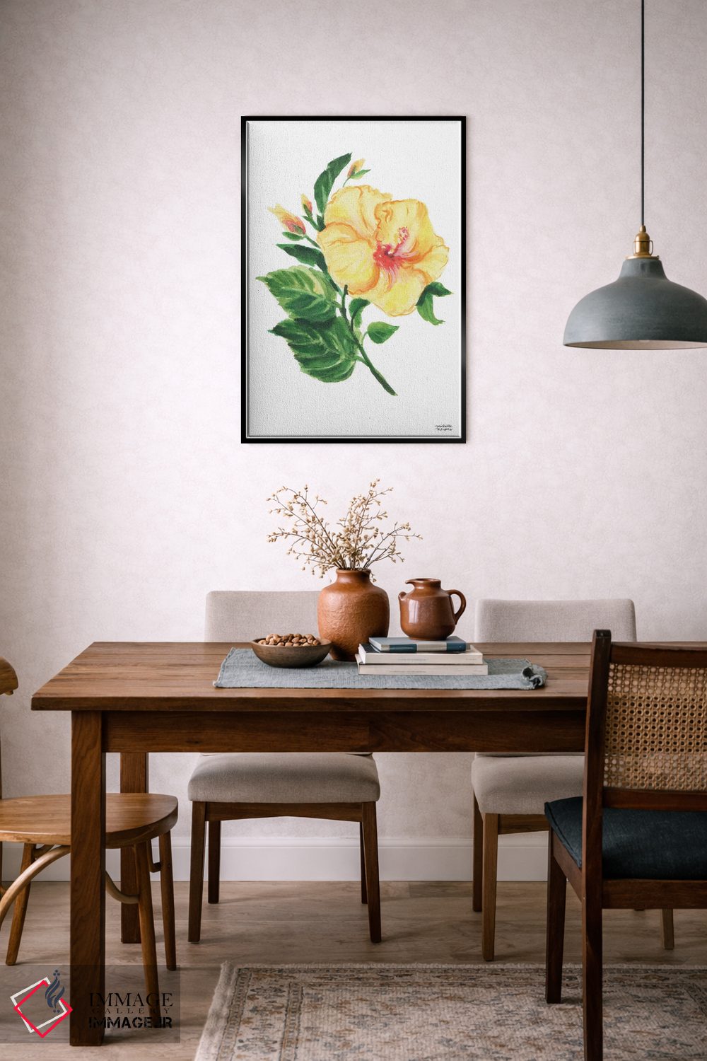 اگر دوست دارید دیوار روشنتر و آرامتر دیده شود، «هیبیسکوس گیاهی آبرنگ» اثرِ «میشل موسپنس» حس طراوت را بدون شلوغی وارد اتاق میکند، برای دکورهای اسکانباوراوی گزینهٔ مناسبیست. در کنار گیاهان آپارتمانی، هماهنگتر هم میشود.