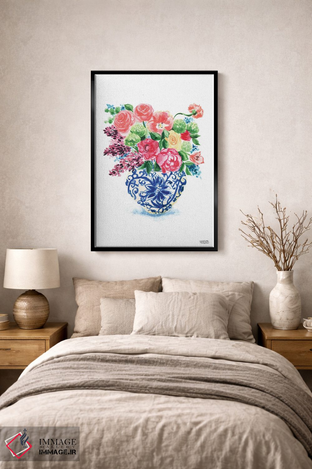 وقتی چیدمان را با دقت میچینید، «دسته گل کوزه زنجبیلی پانزدهم آبرنگ» اثرِ «میشل موسپنس» در دکور، مثل یک امضای ظریف عمل میکند؛ برای اتاق خوابهای آرام و روشن پیشنهاد میشود. به فضا حس «گالری خانگی» میدهد، بدون اینکه اغراق کند.