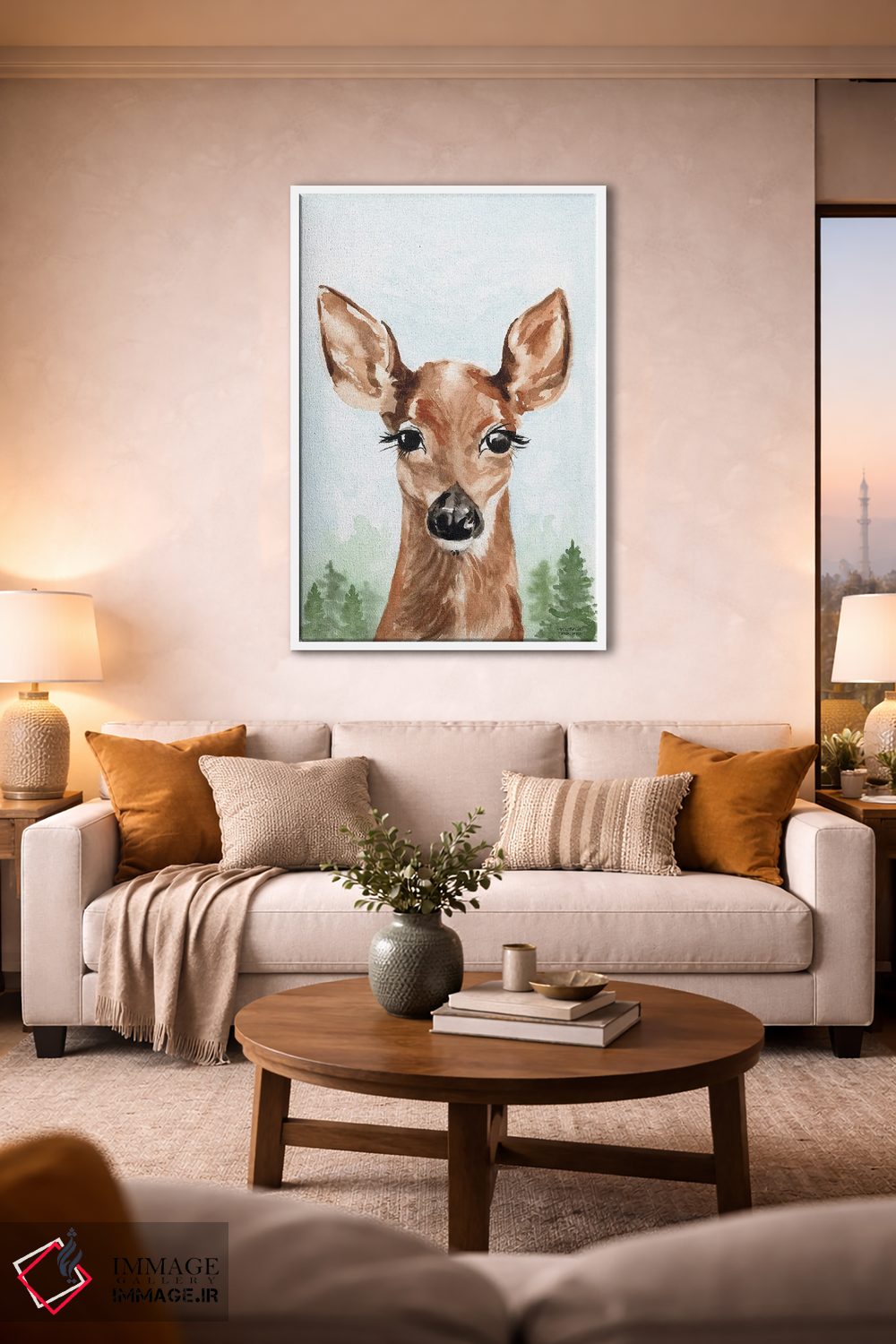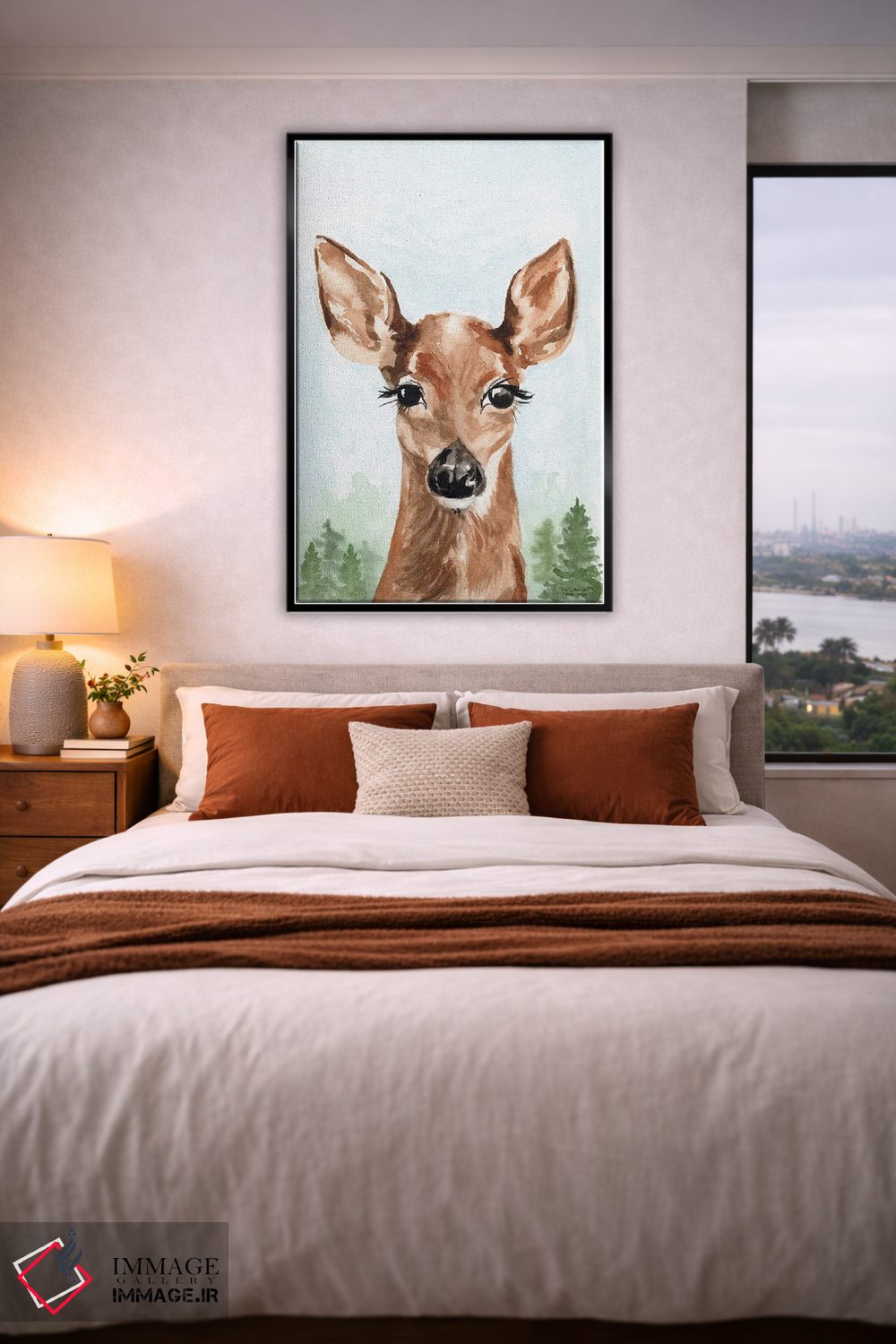 این اثر با عنوان «بچه آهو آبرنگ» اثرِ «میشل موسپنس» به فضا، گرمیِ ملایم اضافه میکند؛ برای اتاق کودک (بدون لحن کودکانه) انتخابی خوشسلیقه است. با قاب چوبی یا مشکی، حس مرتبتری پیدا میکند.