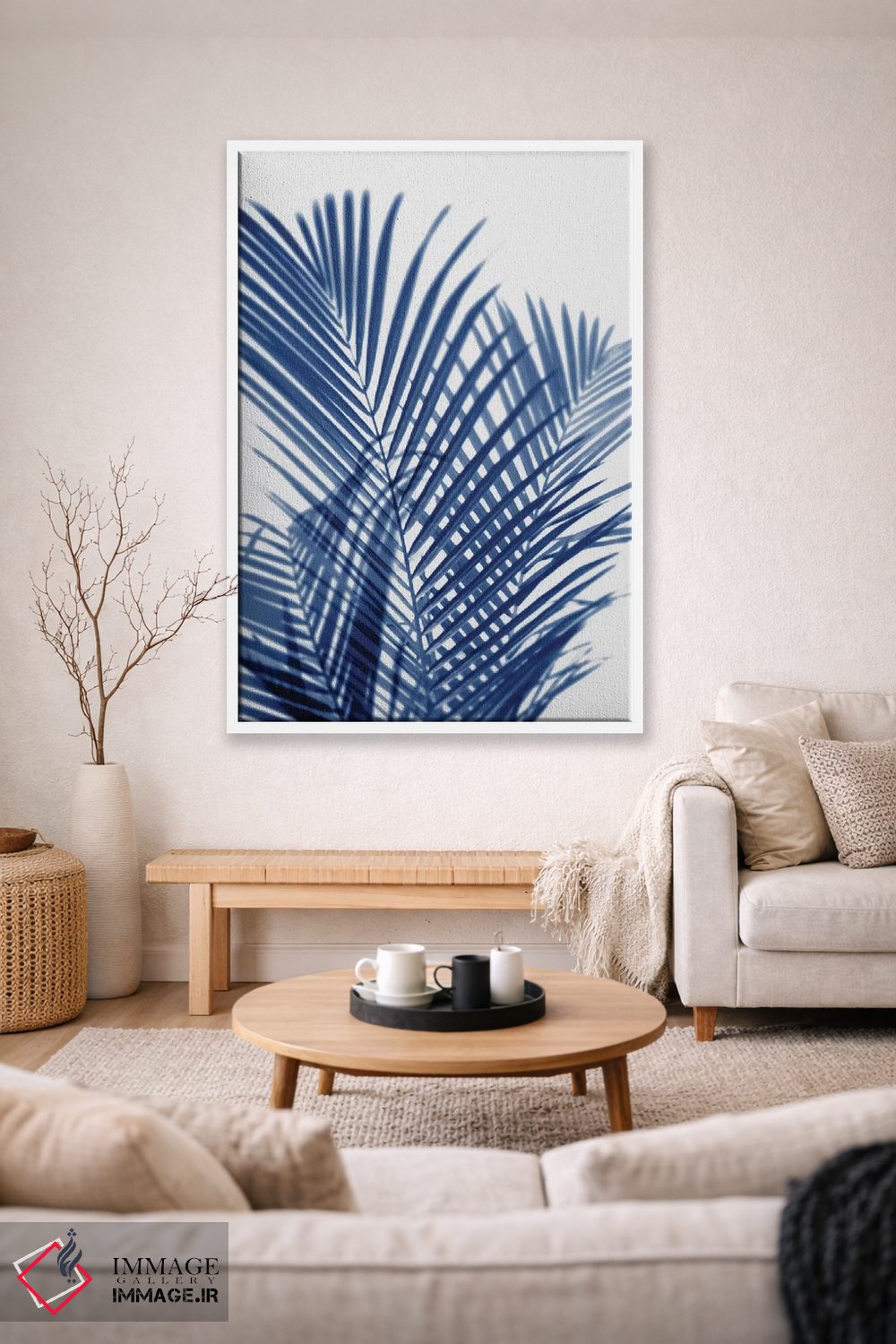 اگر دوست دارید هماهنگی کاملتر شود، رنگِ آبی را در یک گلدان مینیمال کم و دقیق اضافه کنید تا نگاه به سمت اثر هدایت شود.