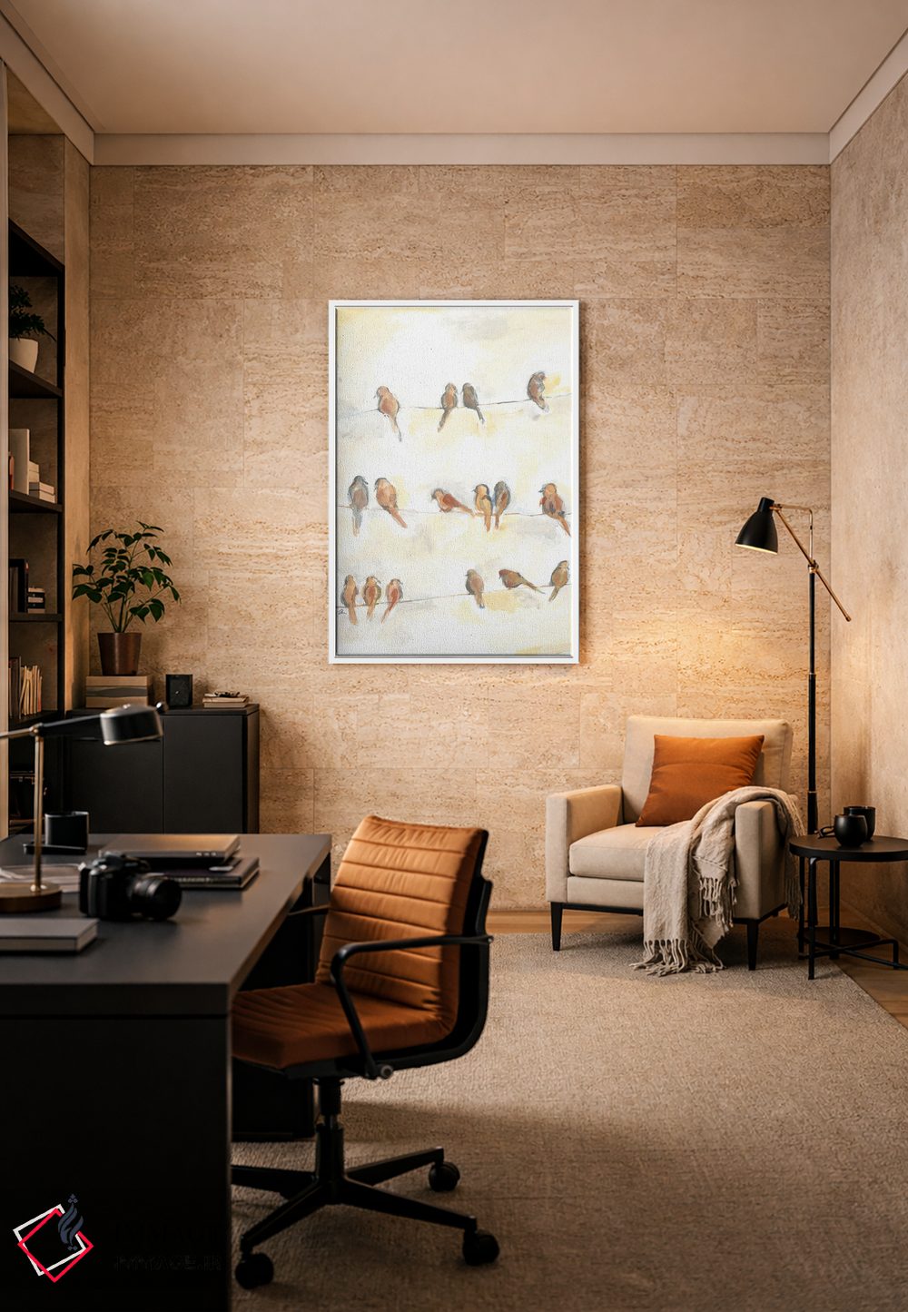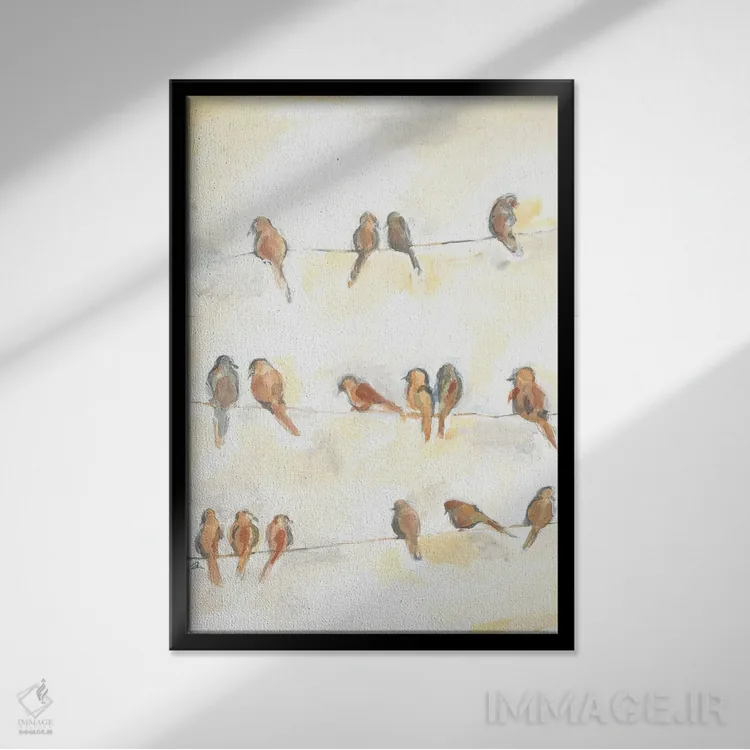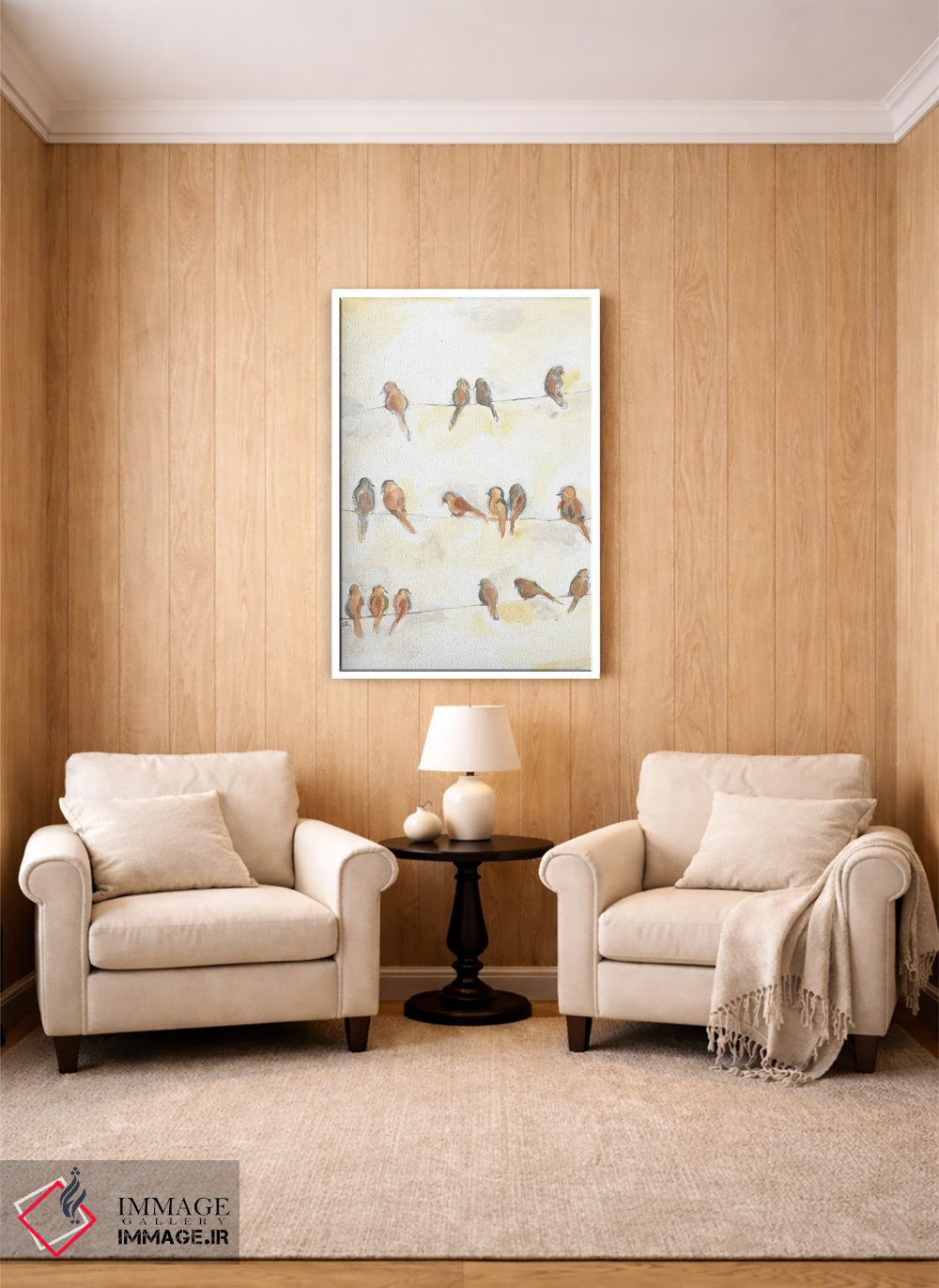 براساس پالت گرم اثر، قاب بلوط روشن (چوبی) پیشنهاد اول است و استخوانی ملایم مکمل. برای سفارشهای پروژهای با ابعاد و قابهای اختصاصی با ایماژ در تماس باشید.