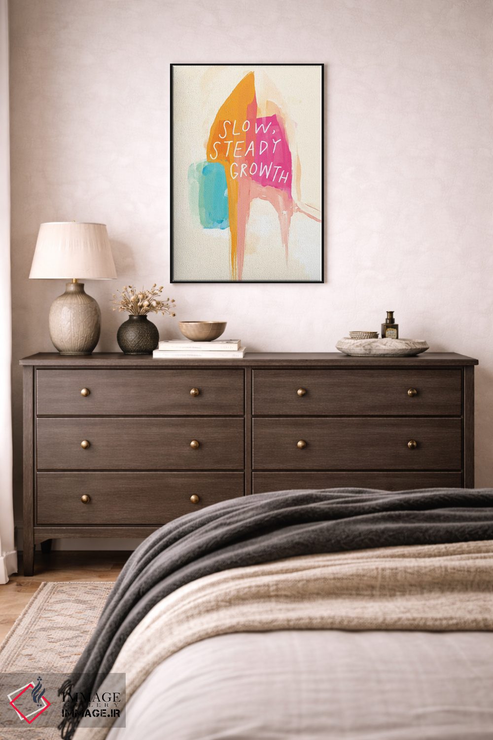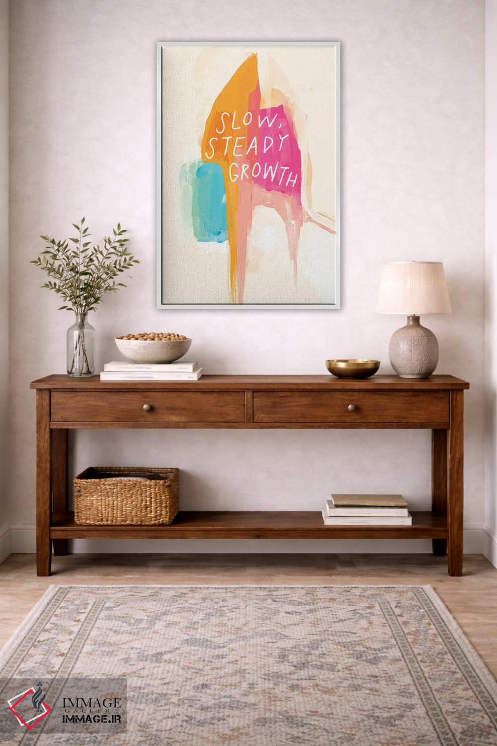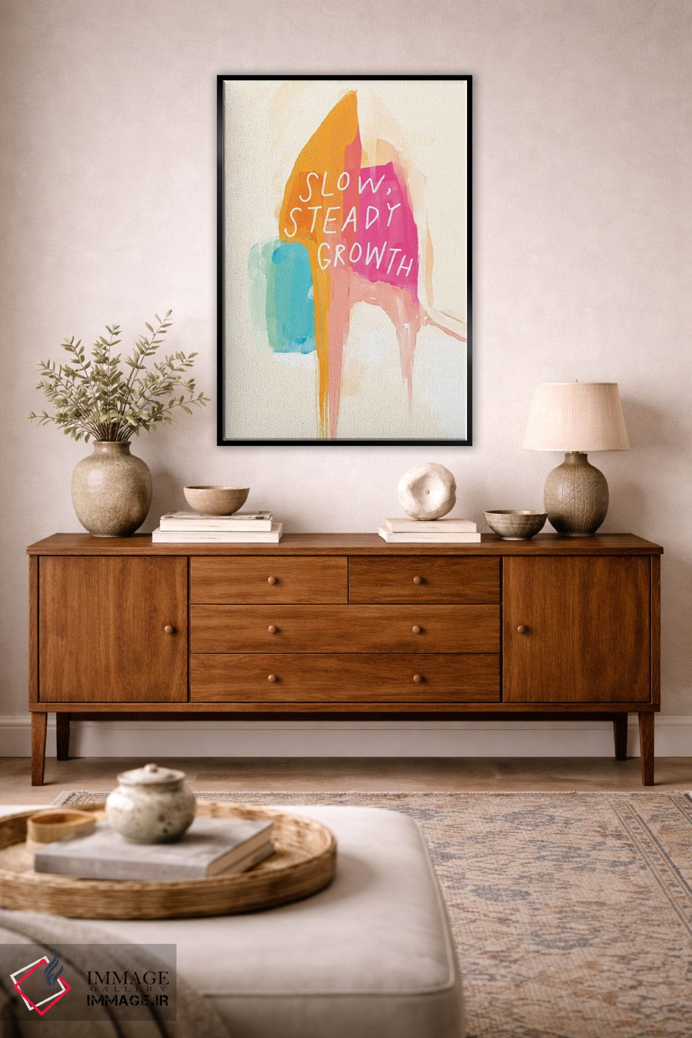 «رشد آرام و پیوسته» اثرِ «مورگان هارپر نیکولز» با حالوهوای تزئینیِ این اثر، فضا را روشن و مرتب میکند؛ مناسب نشیمنهای روشن و چیدمانهای مدرن.