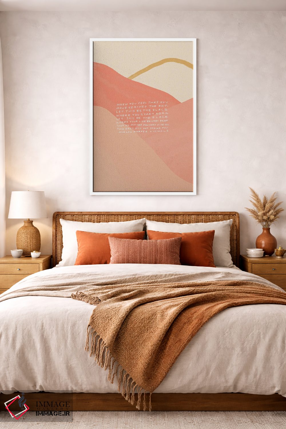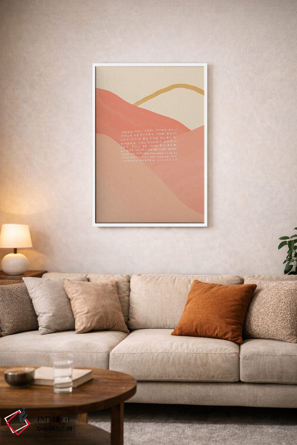 براساس پالت گرم اثر، قاب بلوط روشن (چوبی) پیشنهاد اول است و استخوانی ملایم مکمل. برای سفارشهای پروژهای با ابعاد و قابهای اختصاصی با ایماژ در تماس باشید.