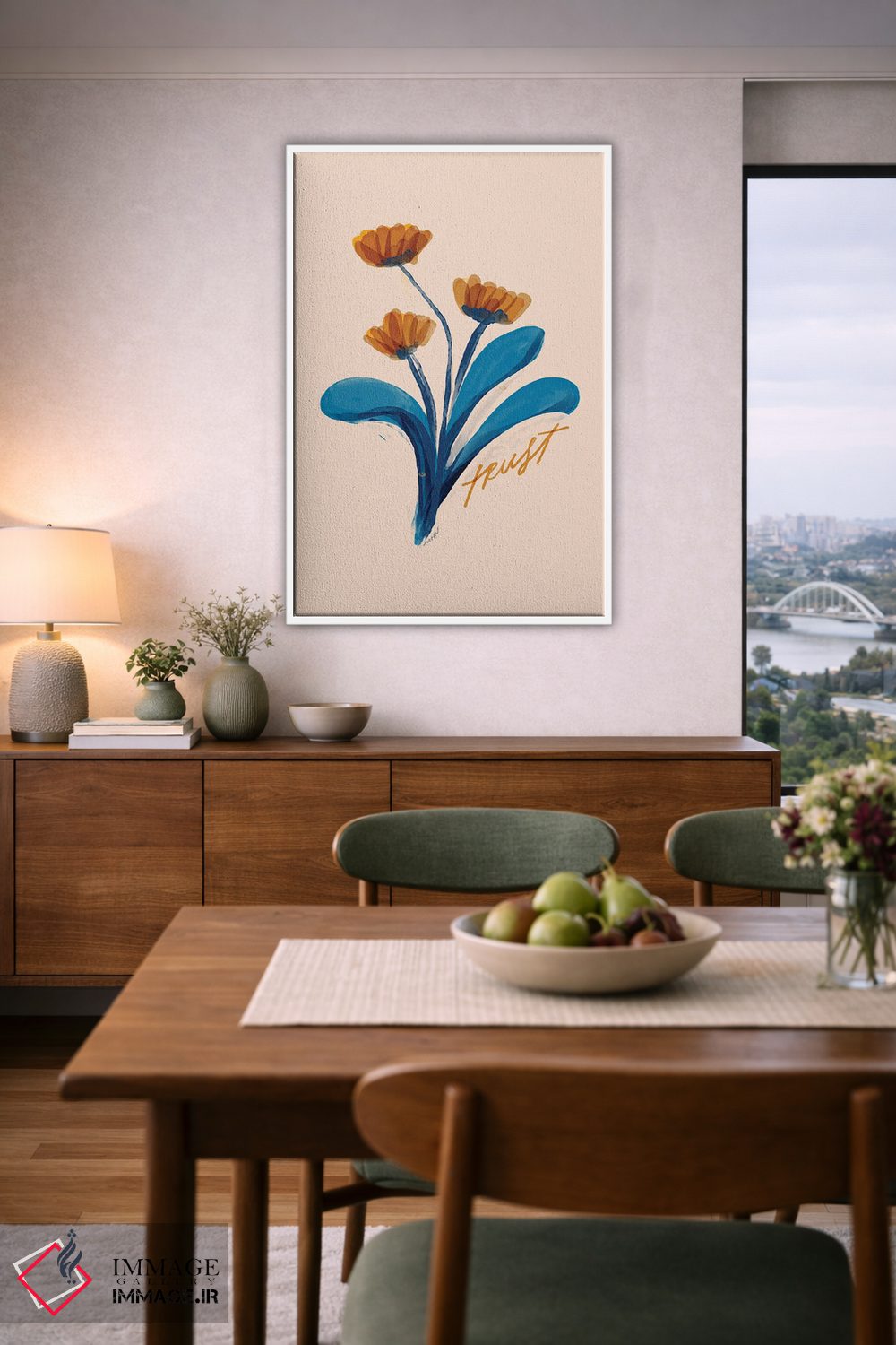 براساس پالت ترکیبی اثر، قاب بلوط روشن (چوبی) پیشنهاد اول است و استخوانی ملایم مکمل. برای سفارشهای پروژهای با ابعاد و قابهای اختصاصی با ایماژ در تماس باشید.
