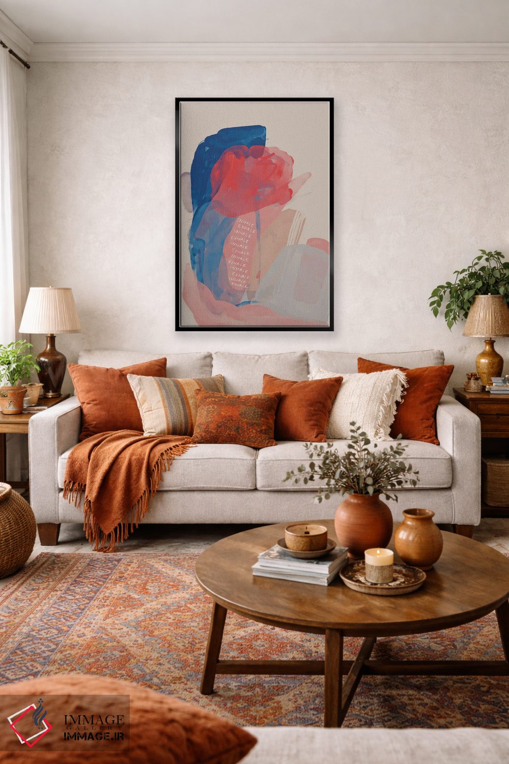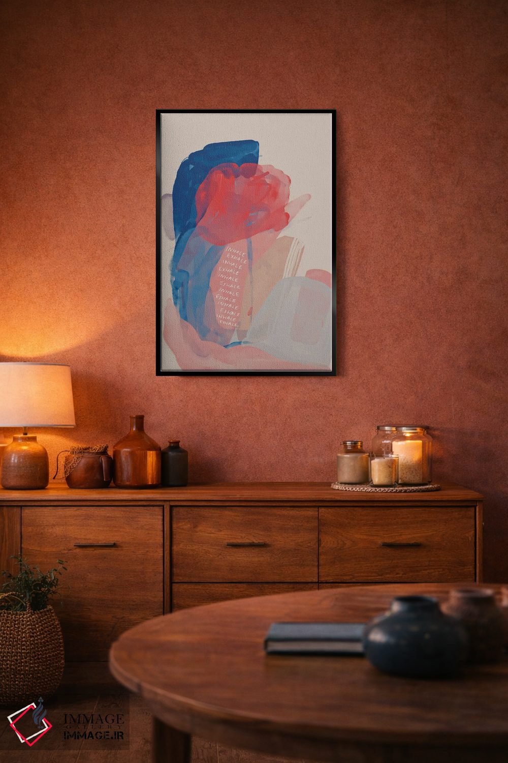 براساس پالت ترکیبی اثر، قاب تیک گرم (چوبی) پیشنهاد اول است و مشکی مات (فریم متوسط) مکمل. برای سفارشهای پروژهای با ابعاد و قابهای اختصاصی با ایماژ در تماس باشید.