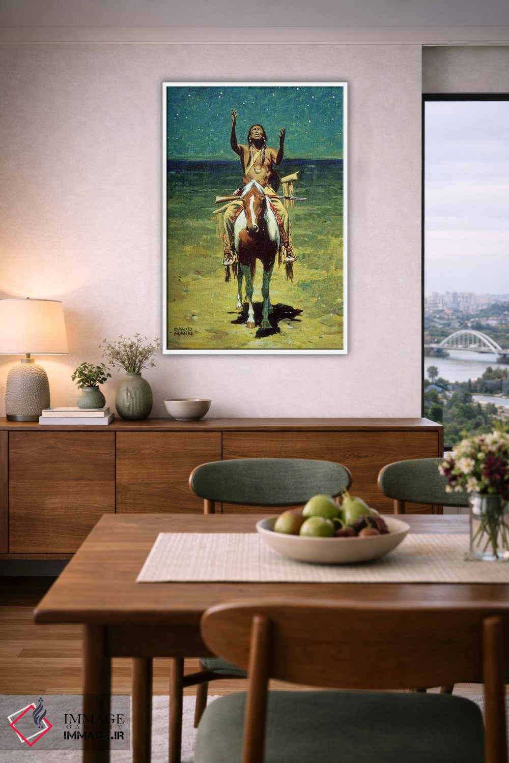 براساس پالت ترکیبی اثر، قاب تیک گرم (چوبی) پیشنهاد اول است و مشکی مات (فریم متوسط) مکمل. برای سفارشهای پروژهای با ابعاد و قابهای اختصاصی با ایماژ در تماس باشید.