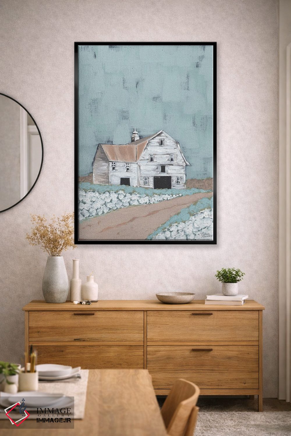 براساس پالت خنثی اثر، قاب بلوط روشن (چوبی) پیشنهاد اول است و استخوانی ملایم مکمل. برای سفارشهای پروژهای با ابعاد و قابهای اختصاصی با ایماژ در تماس باشید.