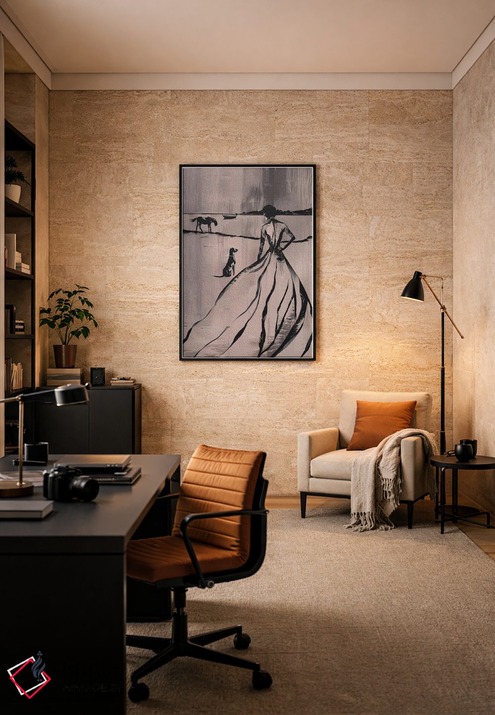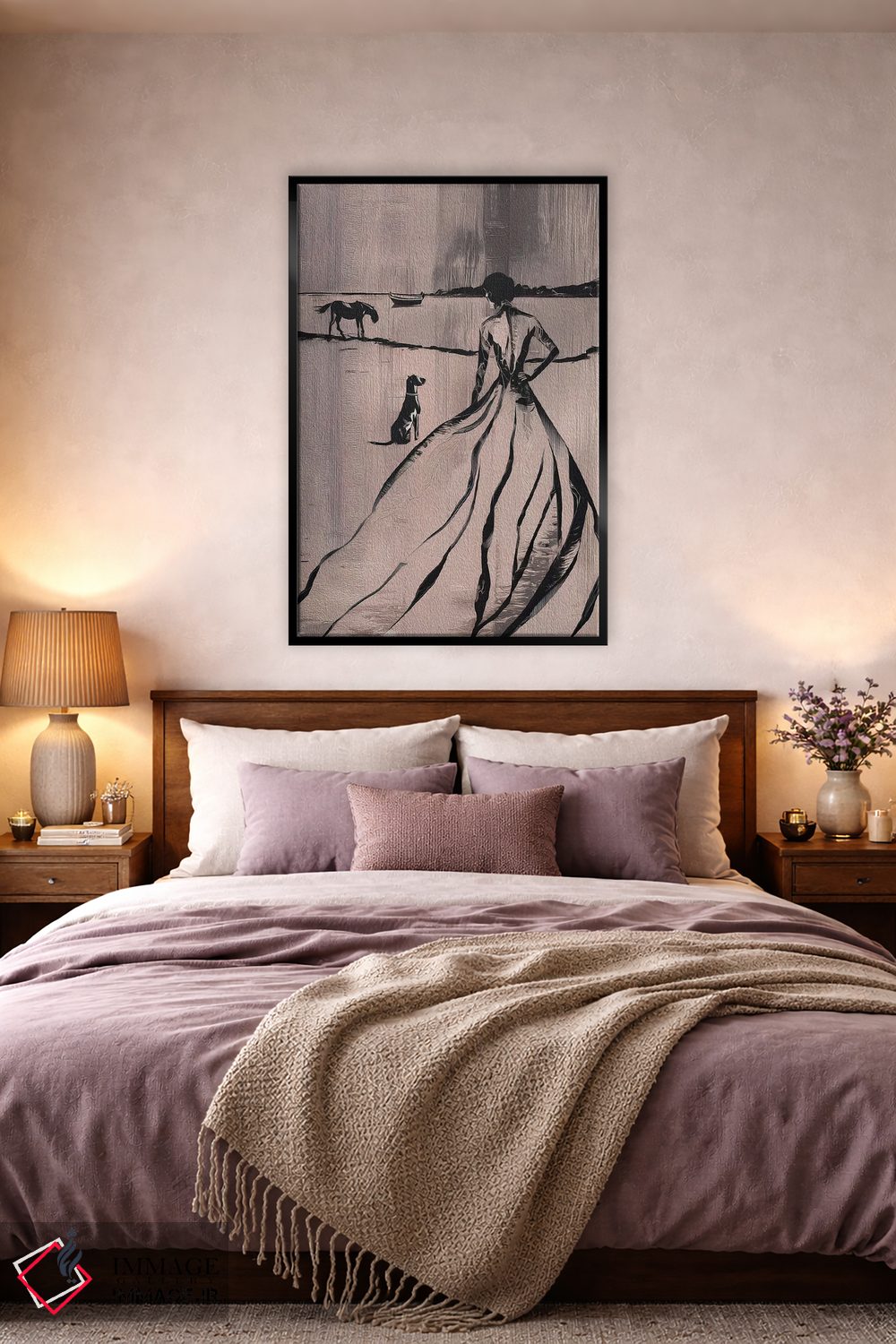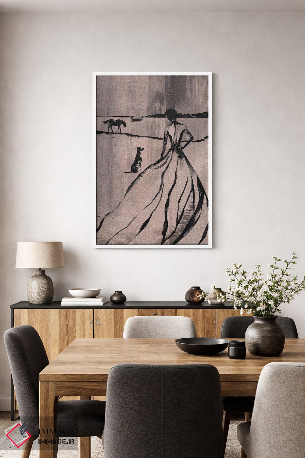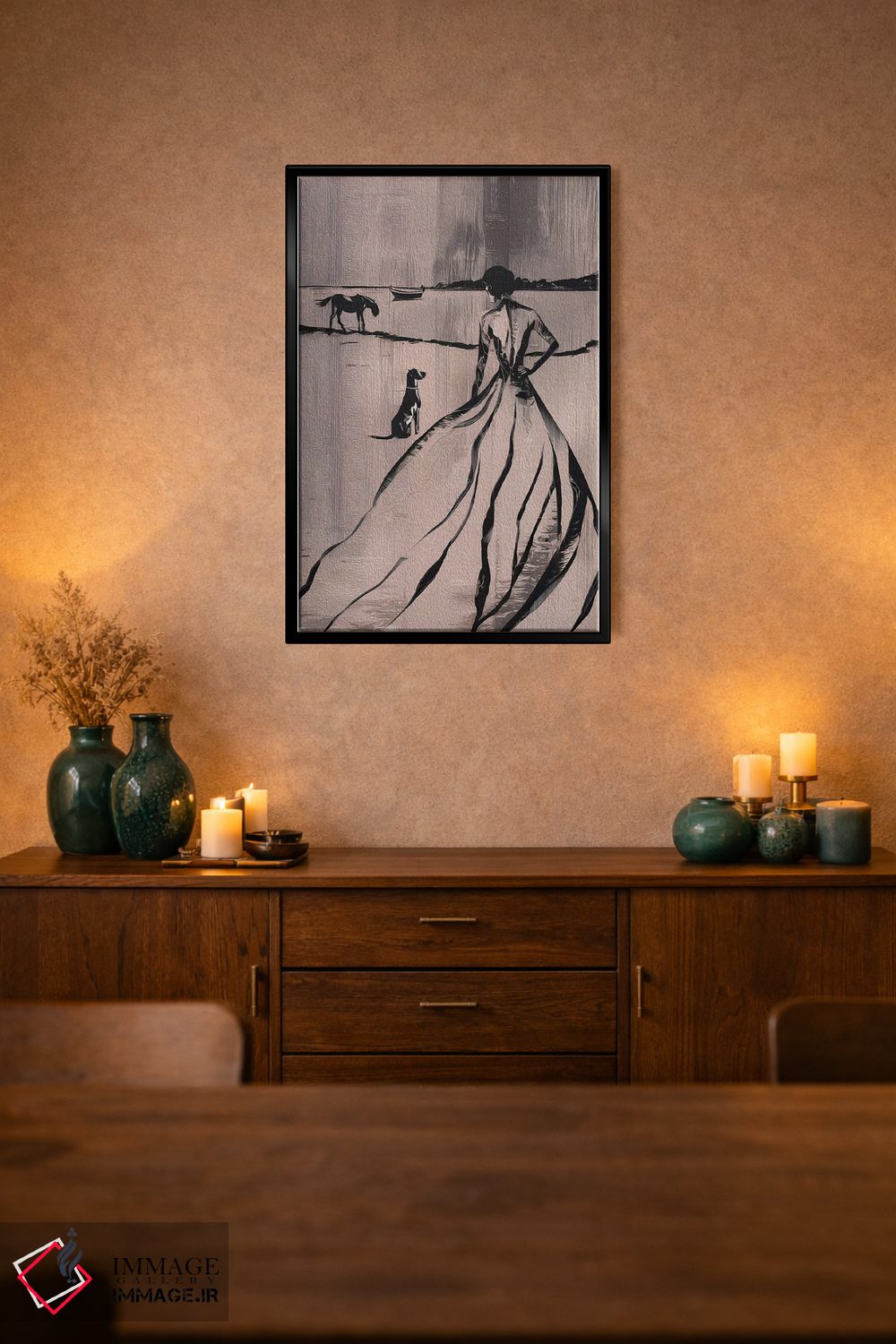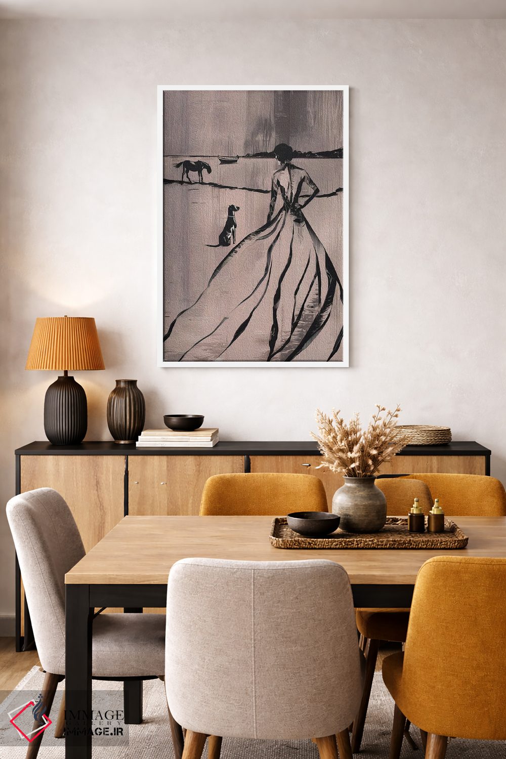 براساس پالت گرم اثر، قاب بلوط روشن (چوبی) پیشنهاد اول است و استخوانی ملایم مکمل. برای سفارشهای پروژهای با ابعاد و قابهای اختصاصی با ایماژ در تماس باشید.