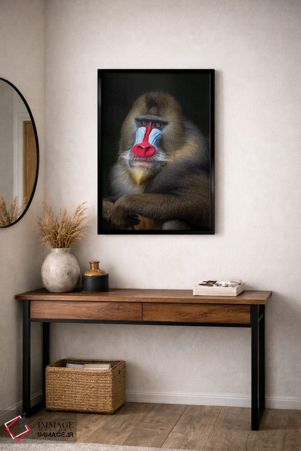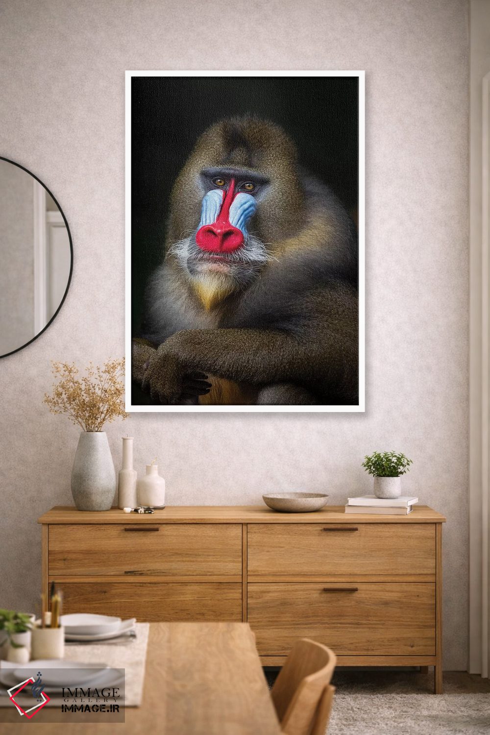 براساس پالت گرم اثر، قاب بلوط روشن (چوبی) پیشنهاد اول است و استخوانی ملایم مکمل. برای سفارشهای پروژهای با ابعاد و قابهای اختصاصی با ایماژ در تماس باشید.