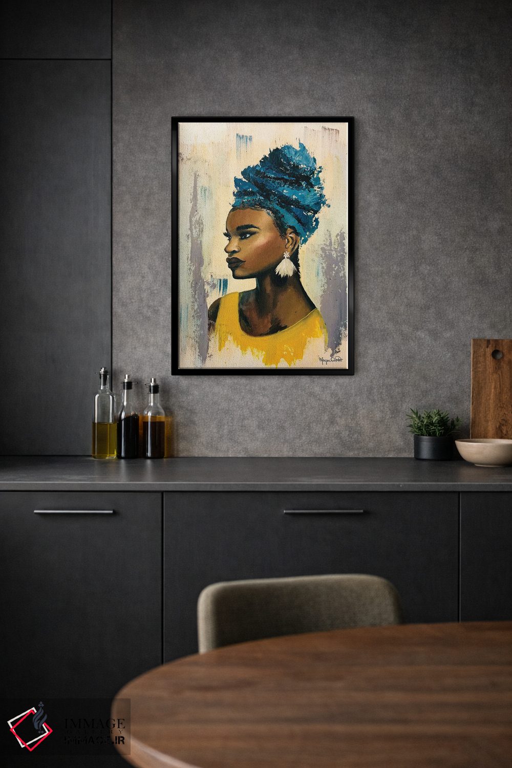 براساس پالت ترکیبی اثر، قاب بلوط روشن (چوبی) پیشنهاد اول است و استخوانی ملایم مکمل. برای سفارشهای پروژهای با ابعاد و قابهای اختصاصی با ایماژ در تماس باشید.