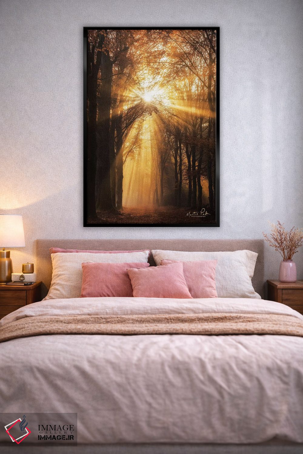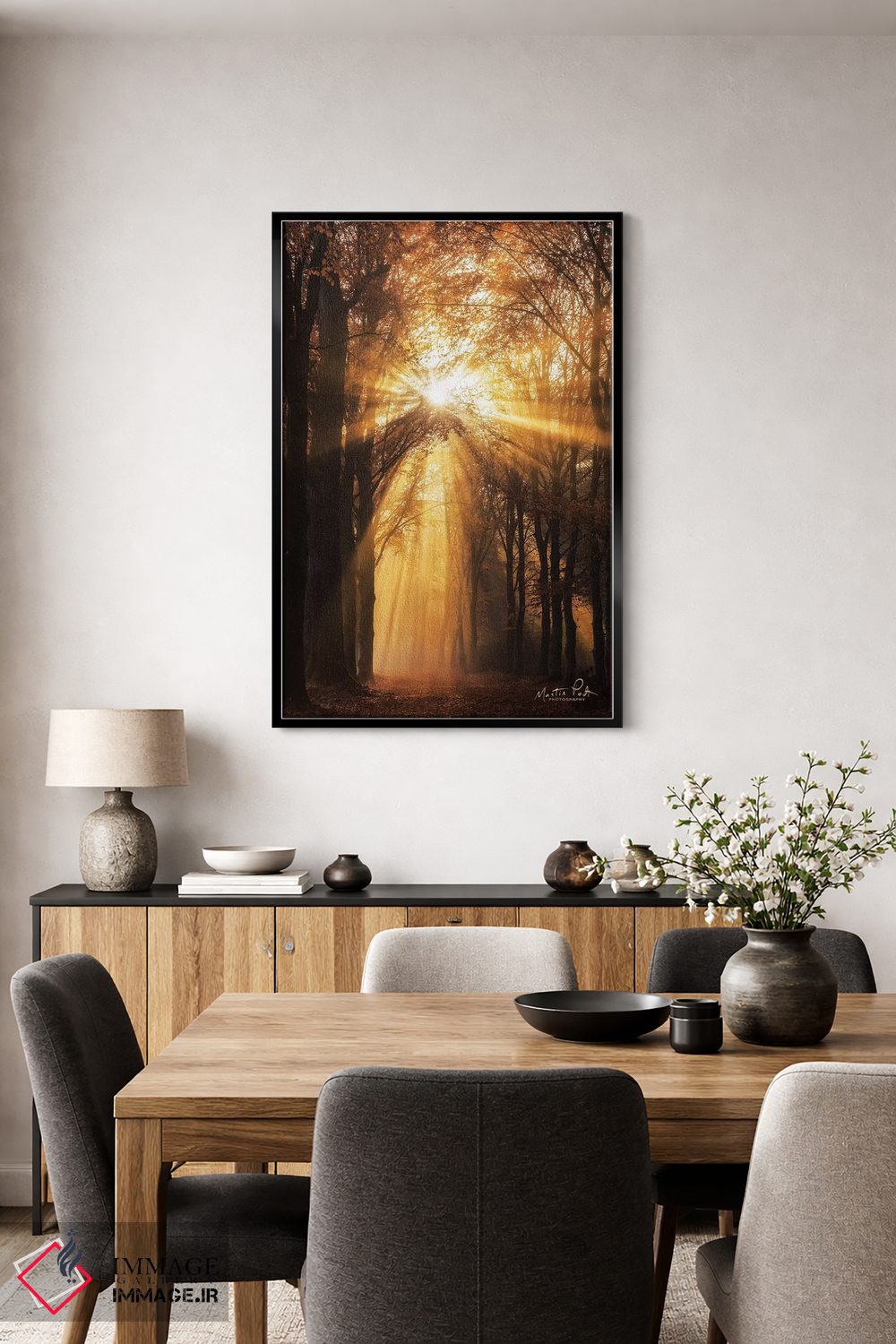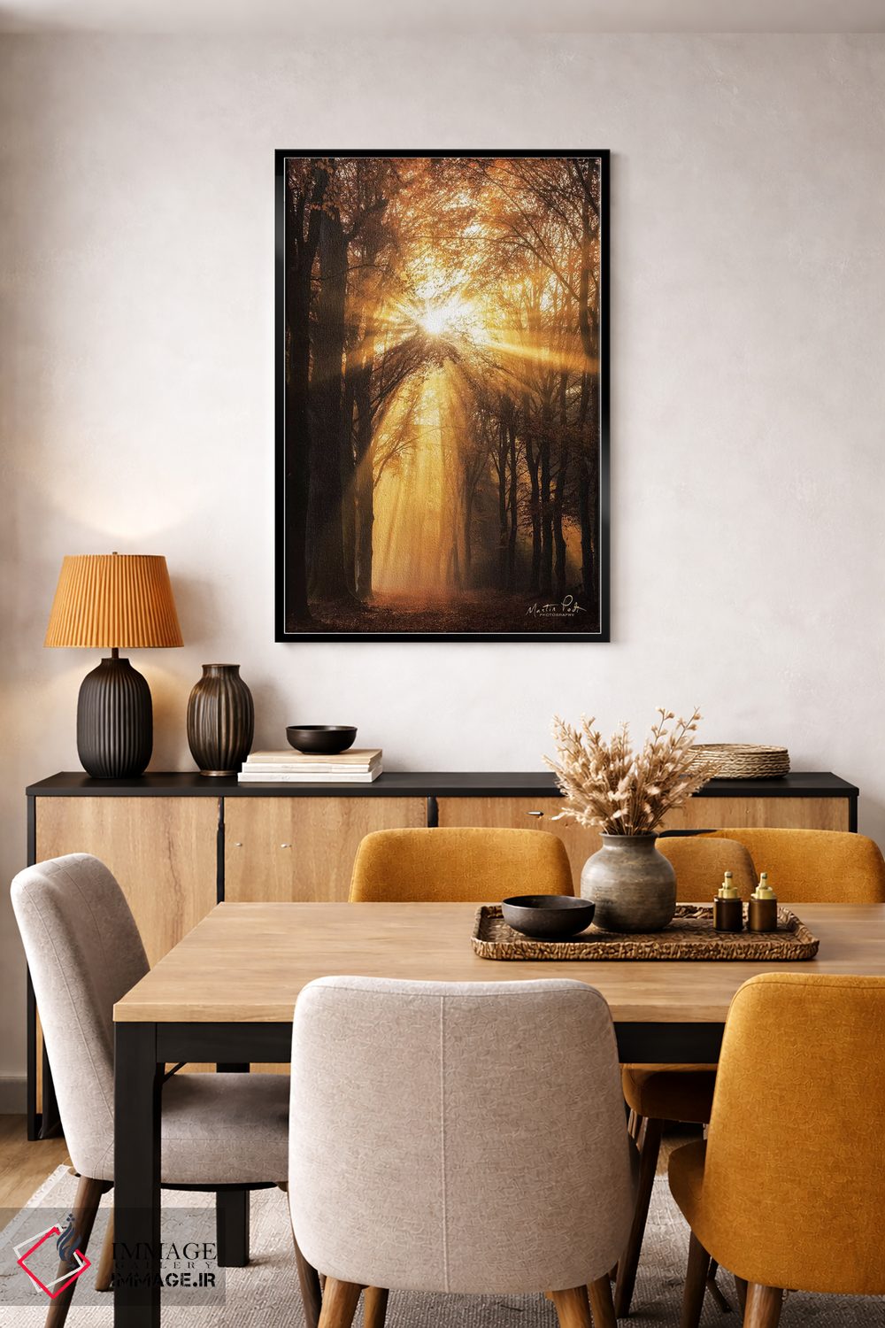 براساس پالت گرم اثر، قاب تیک گرم (چوبی) پیشنهاد اول است و مشکی مات (فریم متوسط) مکمل. برای سفارشهای پروژهای با ابعاد و قابهای اختصاصی با ایماژ در تماس باشید.