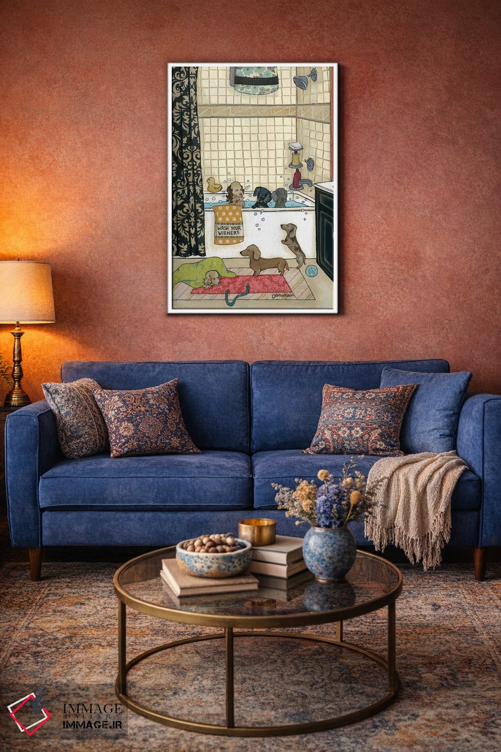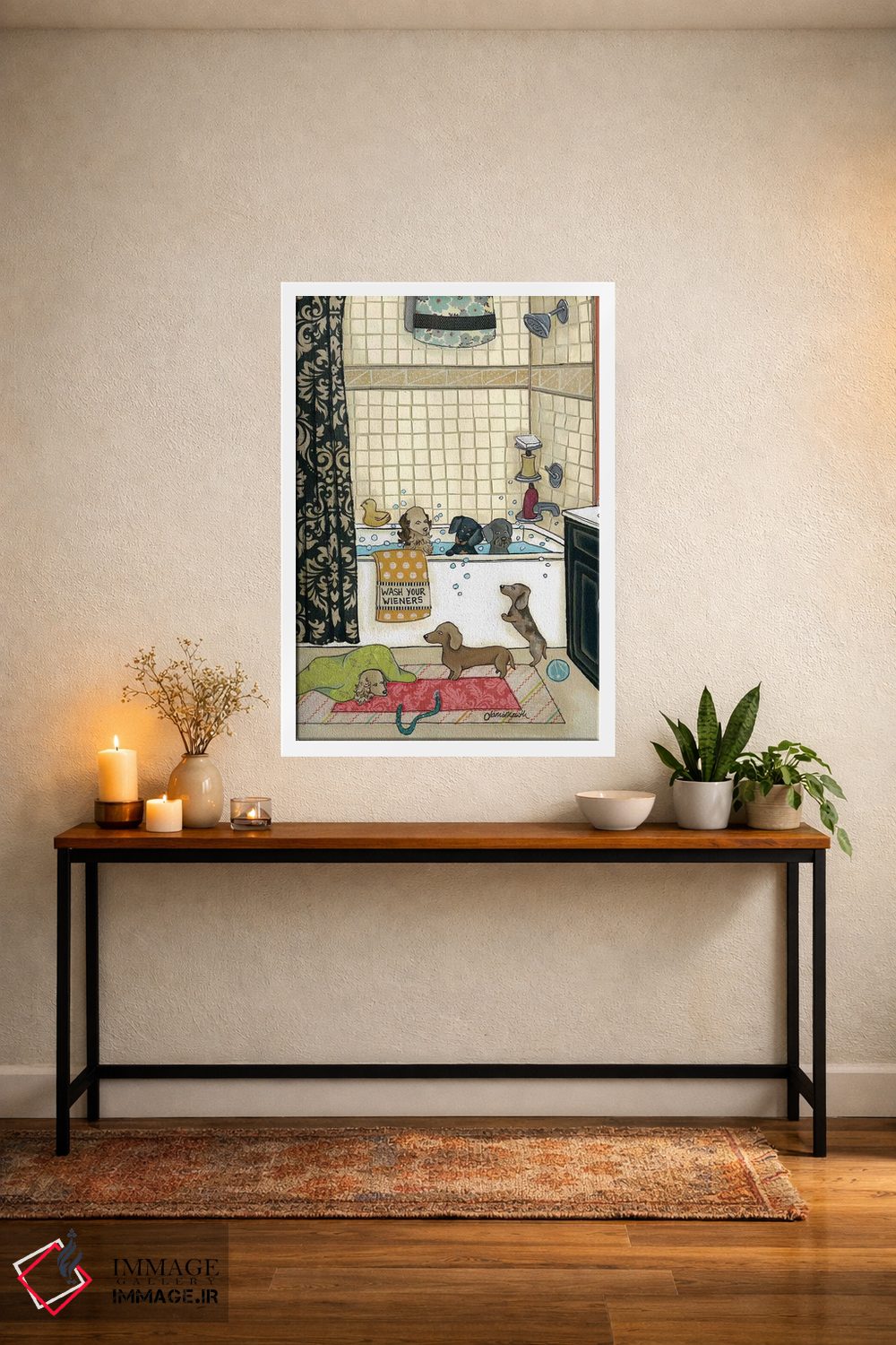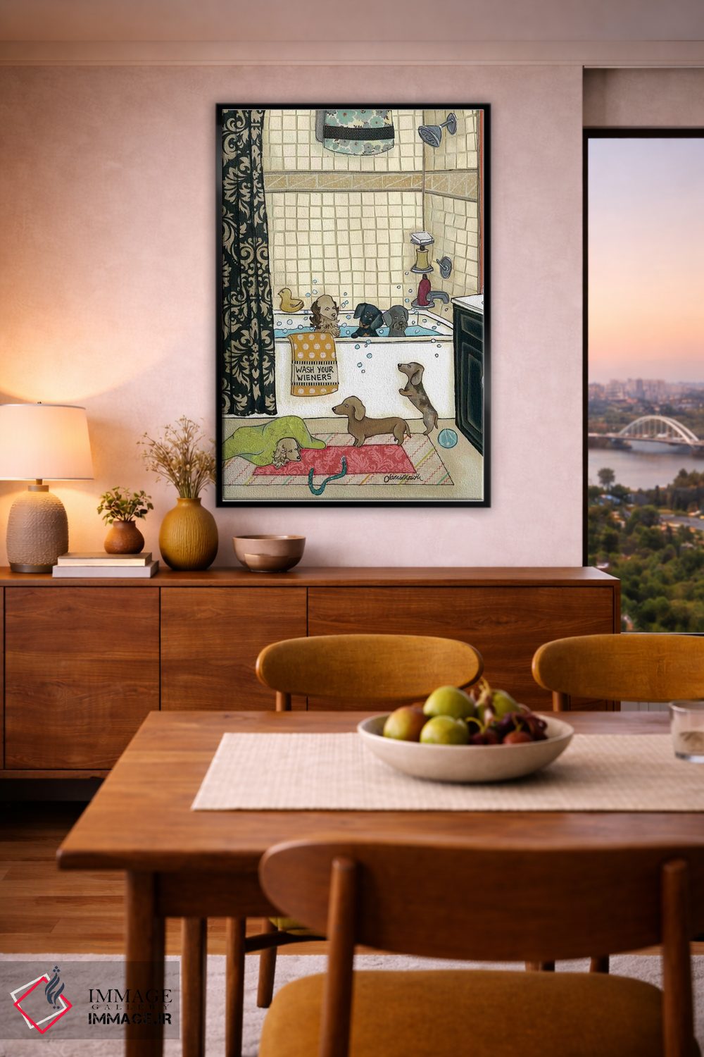 برای دیوارهای ساده، «وینرهایت را بشوی (وینر: سگ سوسیسی)» اثرِ «جیمی موراث» یک لبخند ریز به چیدمان میدهد؛ برای خانههایی با چوب و پارچههای گرم انتخابی خوشسلیقه است. هم فضا را گرم میکند، هم شلوغش نمیکند.