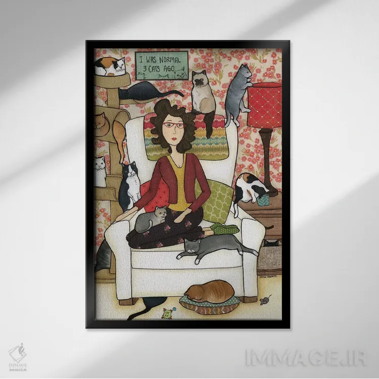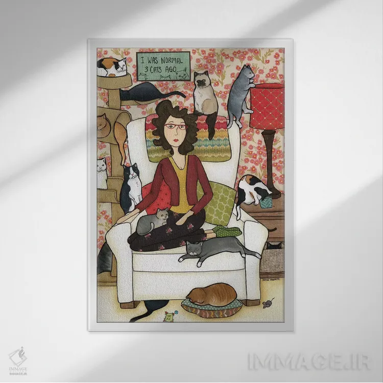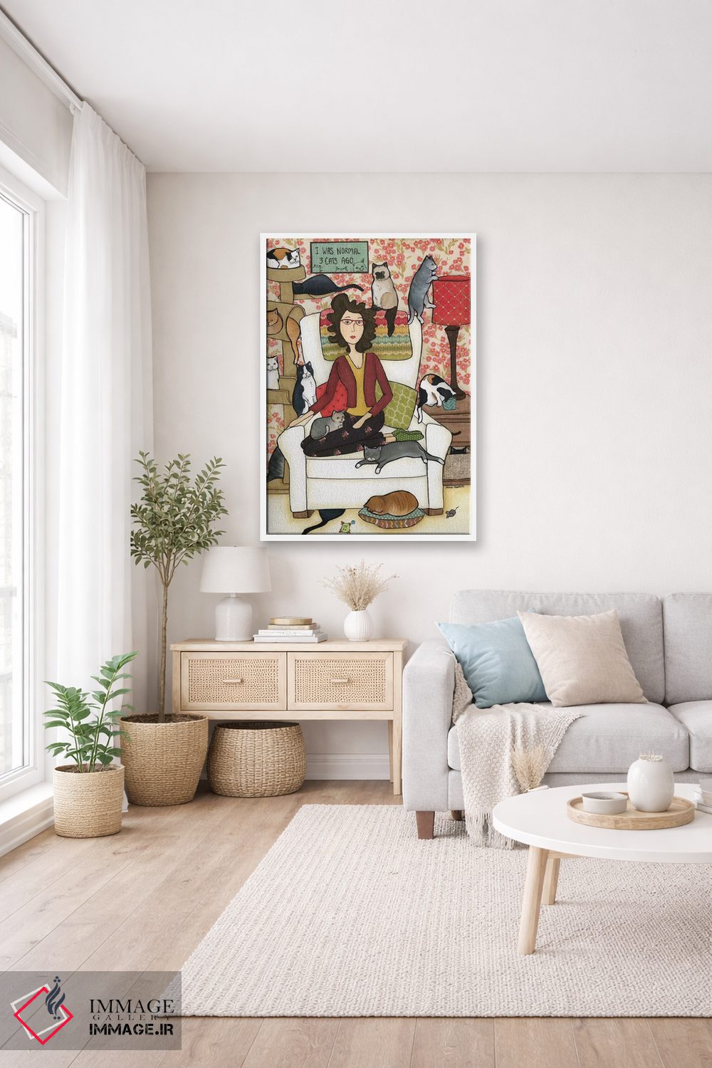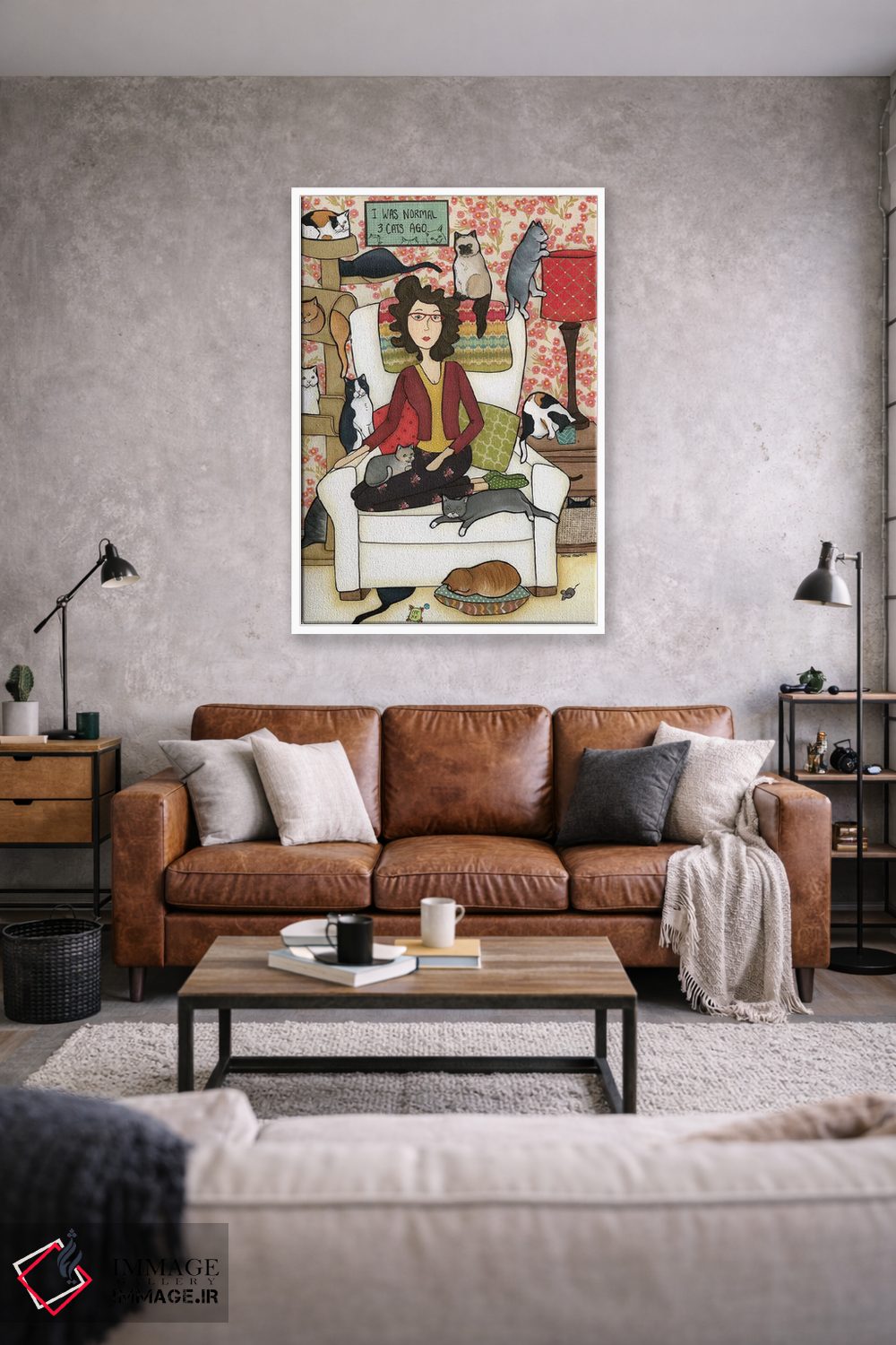 اگر میخواهید دیوار کمی سرزندگیِ محترمانه داشته باشد، «سه گربه پیش از این» اثرِ «جیمی موراث» فضا را صمیمیتر و دعوتکنندهتر نشان میدهد، برای نشیمنهای خانوادگی گزینهٔ مناسبیست. با نورپردازی نقطهای، جذابتر هم میشود.