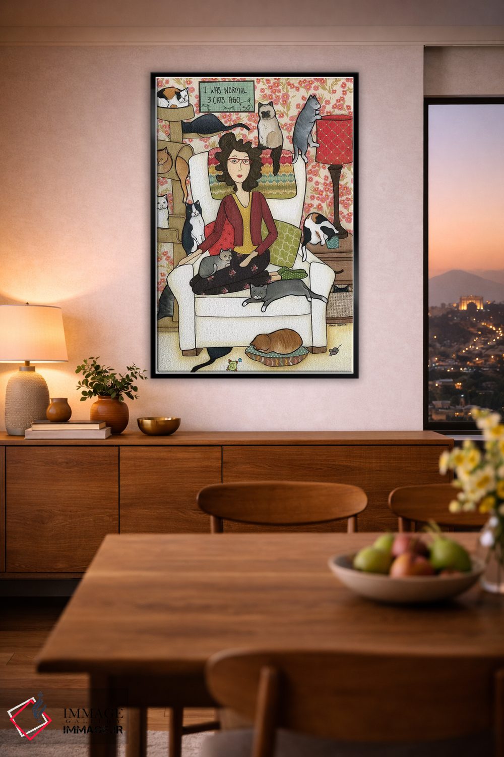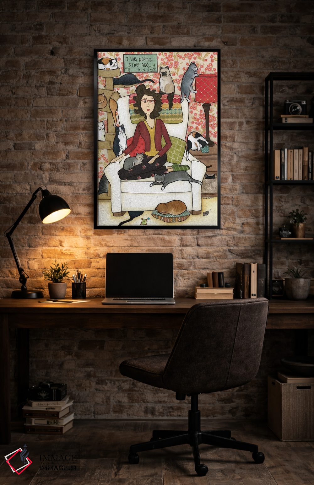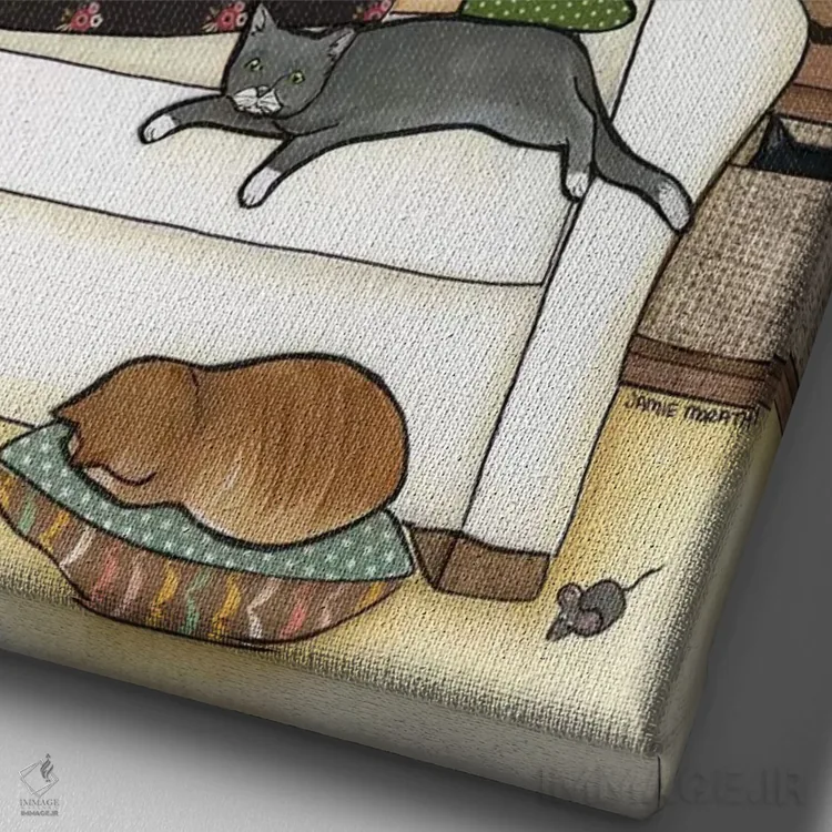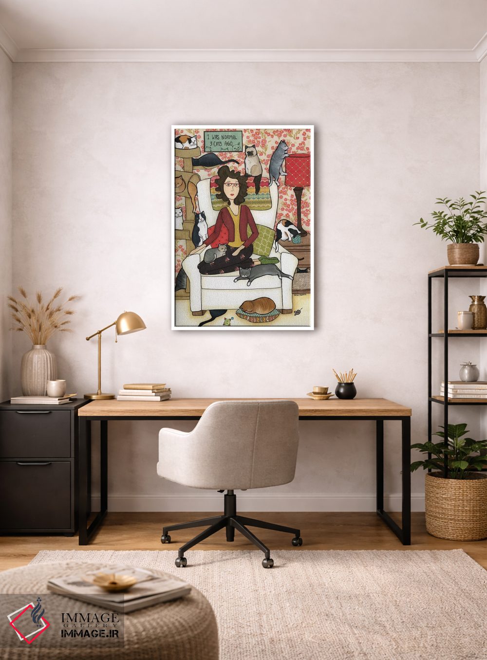 اگر میخواهید دیوار کمی سرزندگیِ محترمانه داشته باشد، «سه گربه پیش از این» اثرِ «جیمی موراث» فضا را صمیمیتر و دعوتکنندهتر نشان میدهد، برای نشیمنهای خانوادگی گزینهٔ مناسبیست. با نورپردازی نقطهای، جذابتر هم میشود.