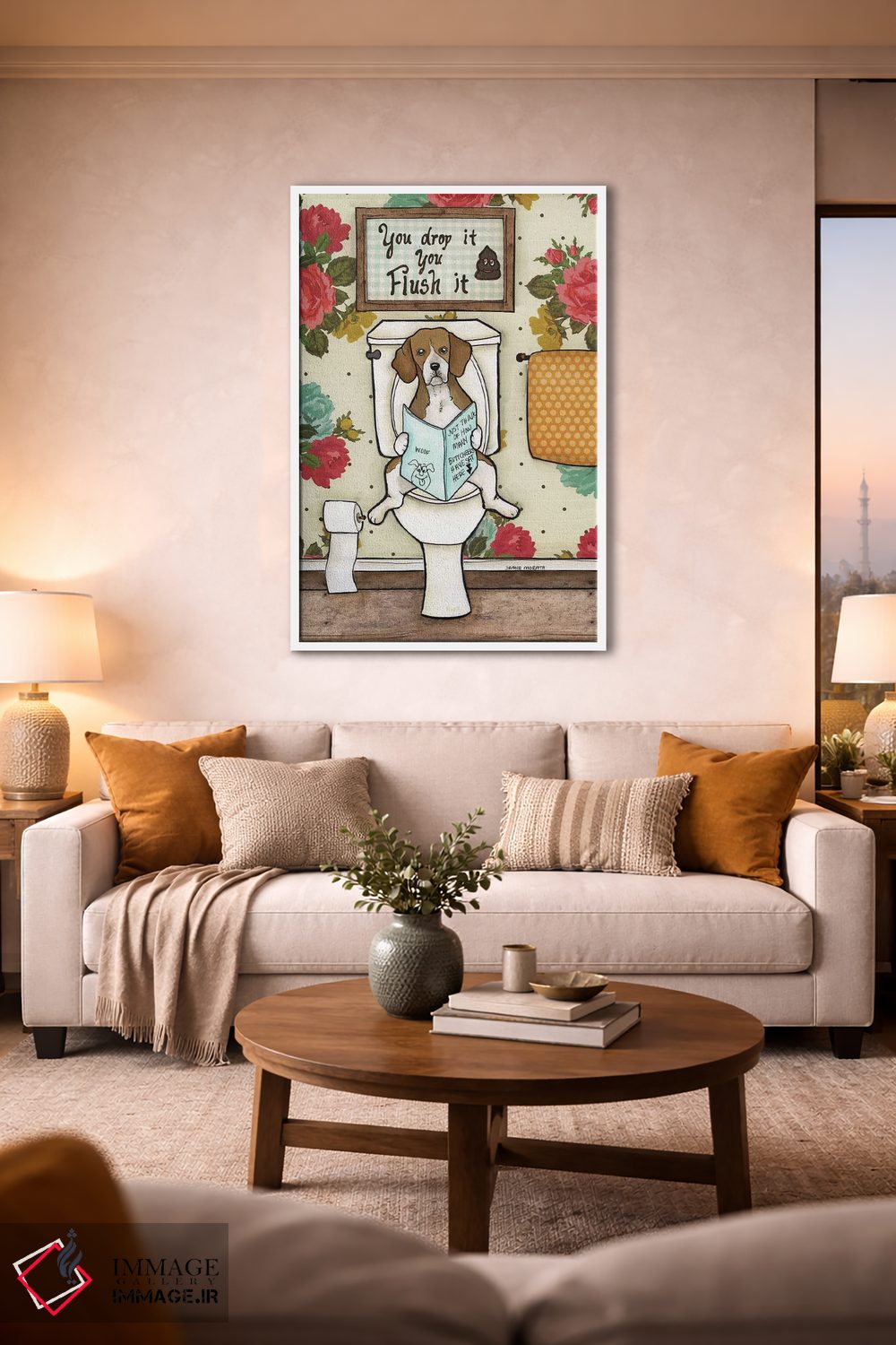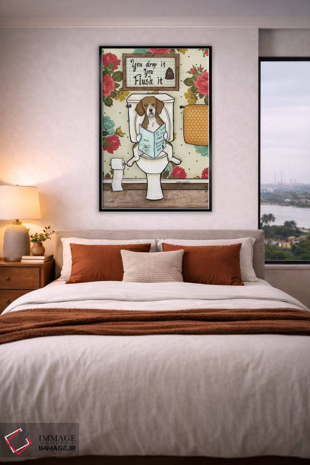 «سیفون رو بکش» اثرِ «جیمی موراث» یک قاب تایپوگرافیک است که ریتم فضا را منظم نگه میدارد؛ برای دیوارهای سفید و چیدمانهای ساده، گزینهی خوبی است.