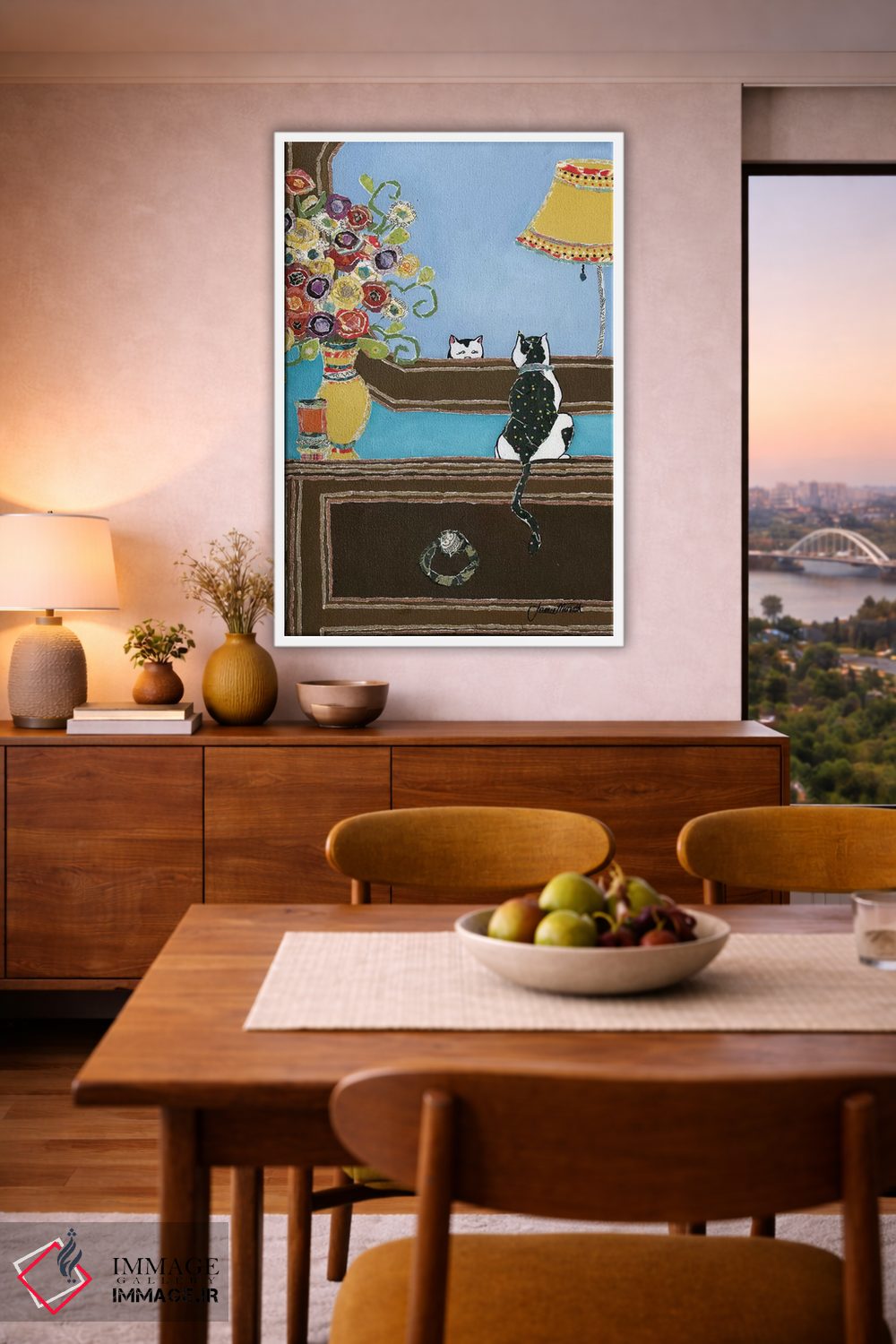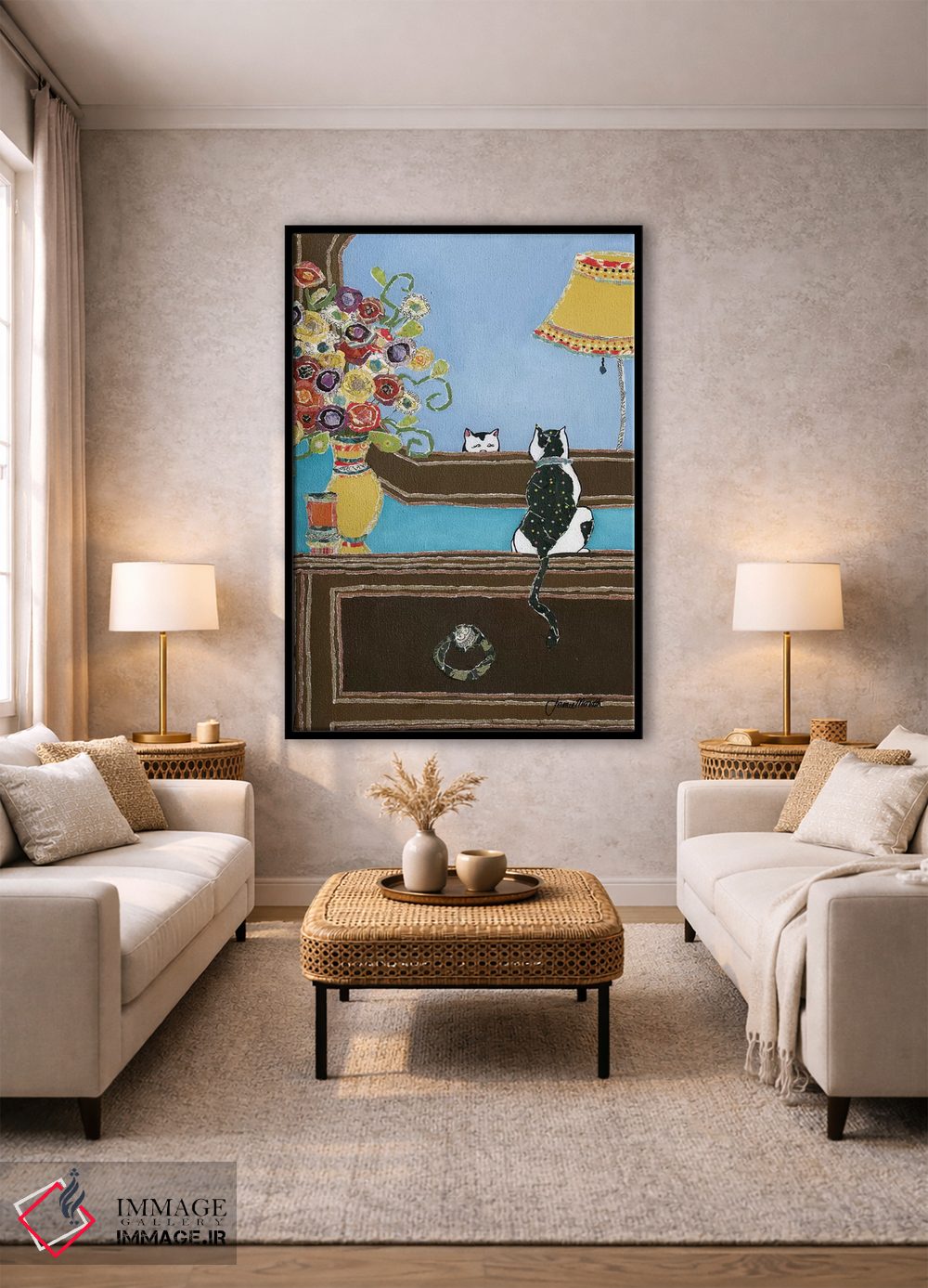 براساس پالت ترکیبی اثر، قاب بلوط روشن (چوبی) پیشنهاد اول است و استخوانی ملایم مکمل. برای سفارشهای پروژهای با ابعاد و قابهای اختصاصی با ایماژ در تماس باشید.