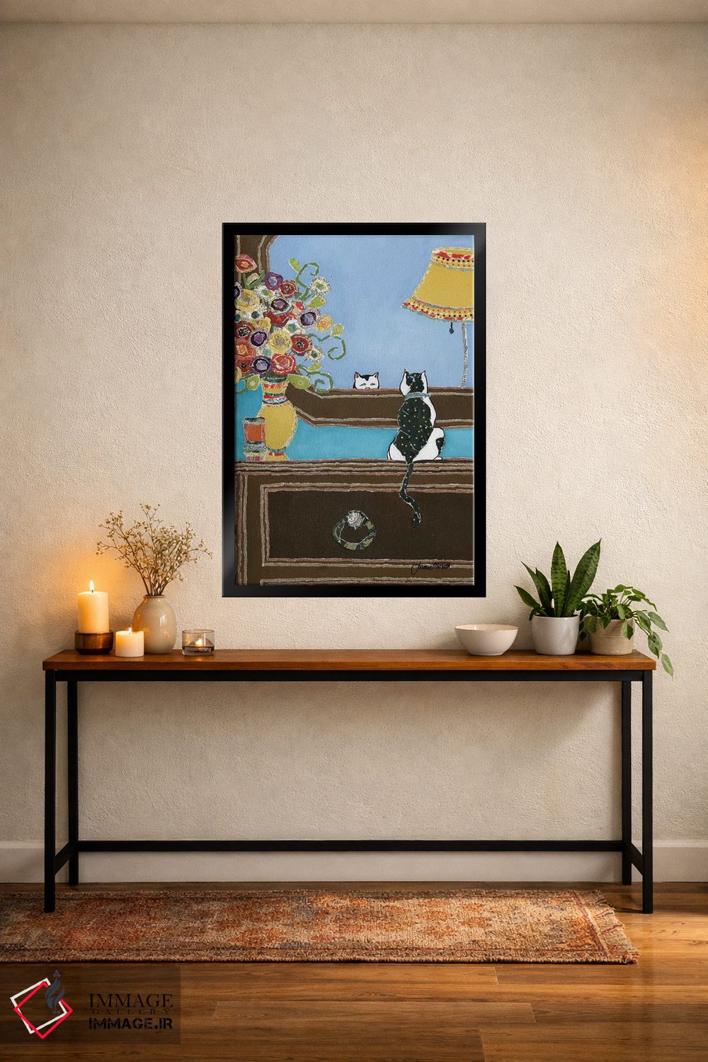 برای دکورهای صمیمی، «من خوشگل» اثرِ «جیمی موراث» به دیوار، انرژیِ نرم و زنده میدهد؛ برای راهروها و ورودیهای گرم انتخابی خوشسلیقه است. هر بار نگاهش میکنید، یک جزئیات تازه به چشم میآید.