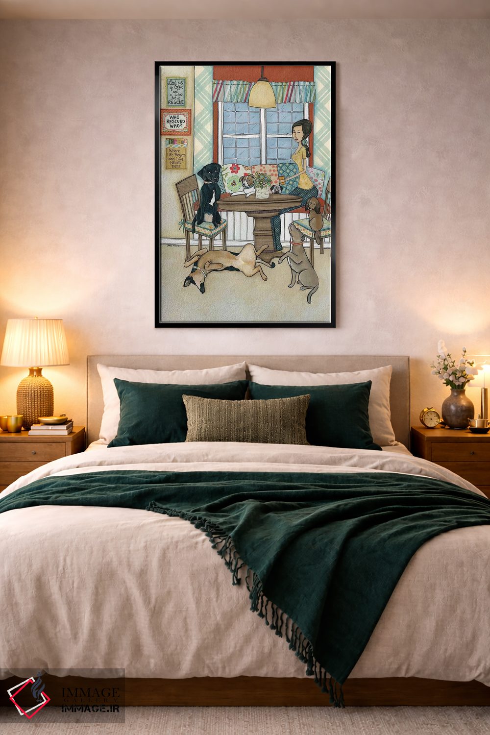 براساس پالت گرم اثر، قاب بلوط روشن (چوبی) پیشنهاد اول است و استخوانی ملایم مکمل. برای سفارشهای پروژهای با ابعاد و قابهای اختصاصی با ایماژ در تماس باشید.