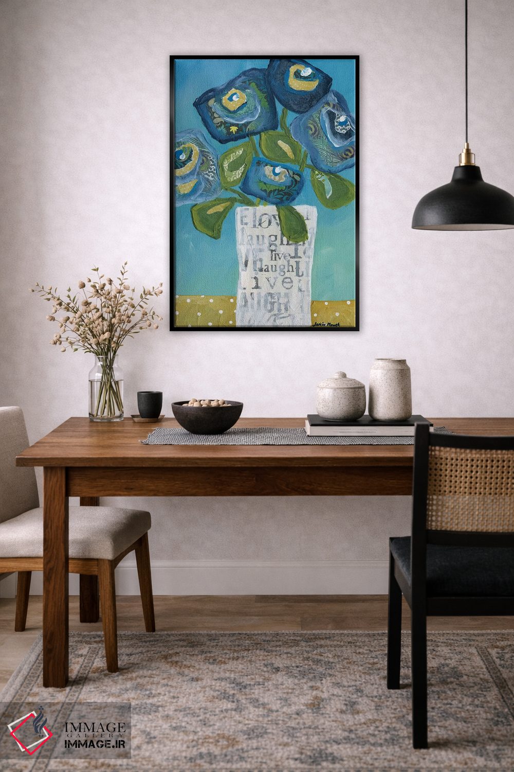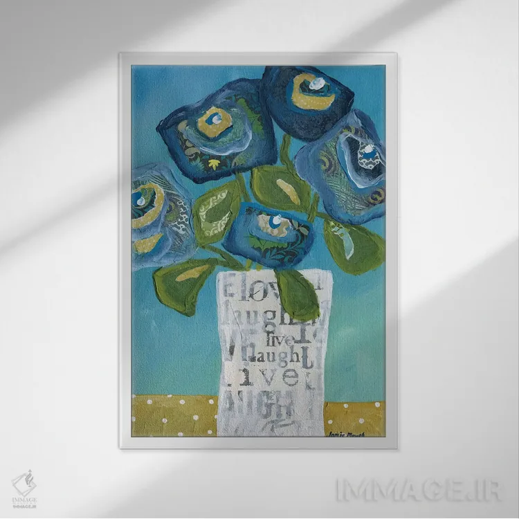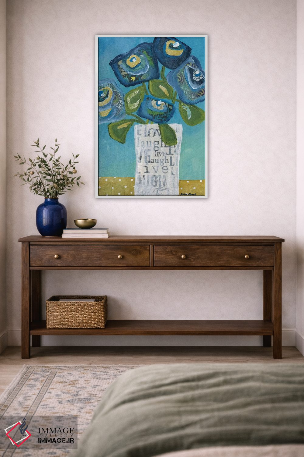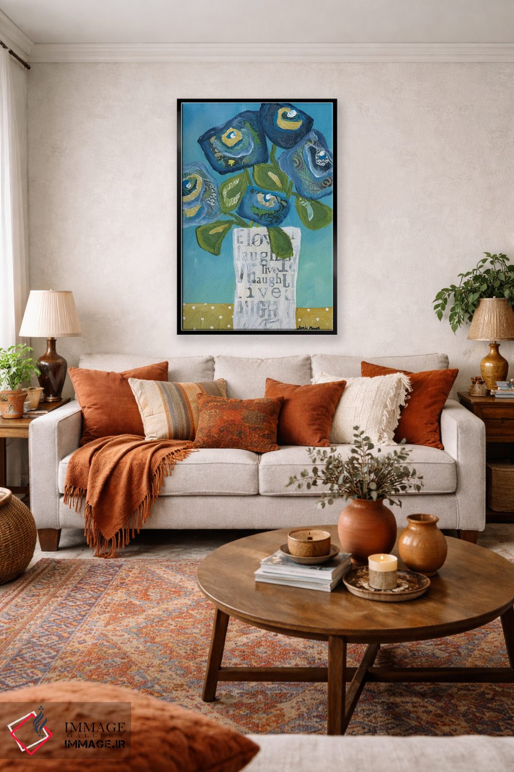 این اثر با عنوان «زندگی، خنده، عشق در یک گلدان» اثرِ «جیمی موراث» در کنار چوب و پارچههای روشن، عالی مینشیند؛ برای کافهها و فضاهای آرام انتخابی خوشسلیقه است. با قاب روشن یا چوبی، حس طبیعیتری پیدا میکند.