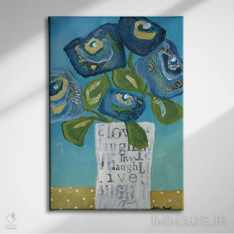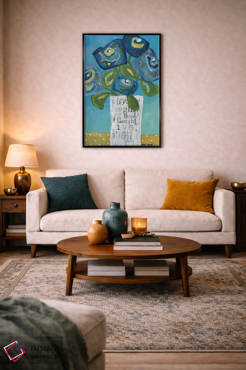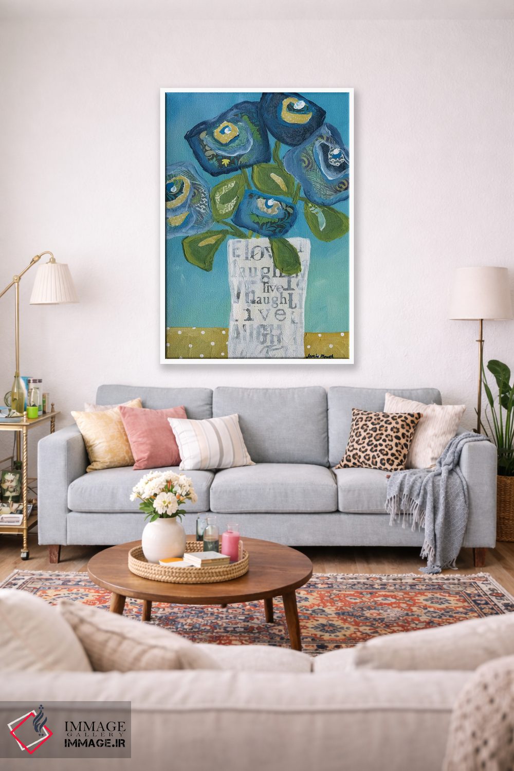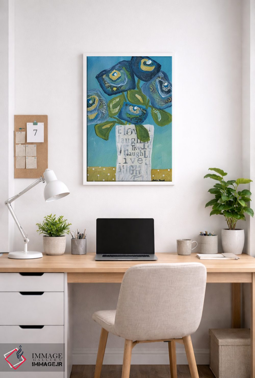 این اثر با عنوان «زندگی، خنده، عشق در یک گلدان» اثرِ «جیمی موراث» در کنار چوب و پارچههای روشن، عالی مینشیند؛ برای کافهها و فضاهای آرام انتخابی خوشسلیقه است. با قاب روشن یا چوبی، حس طبیعیتری پیدا میکند.