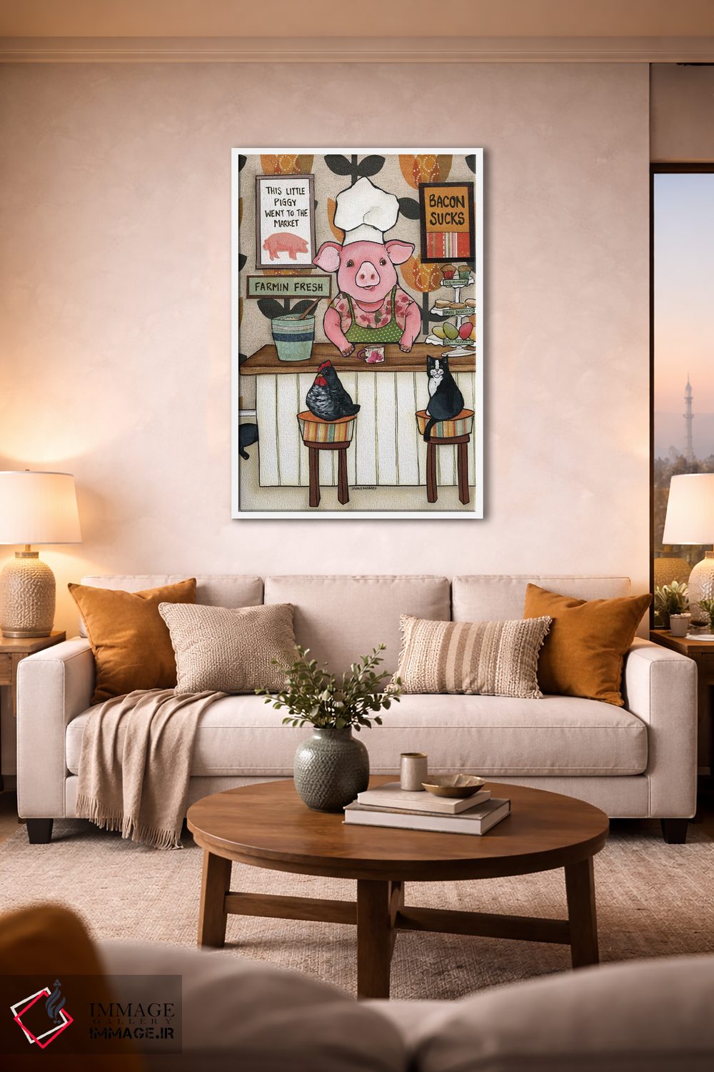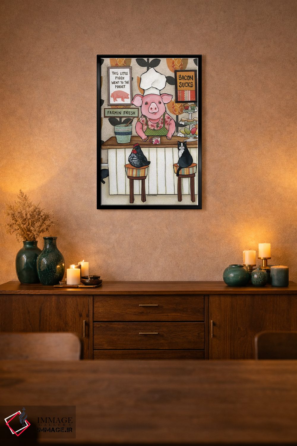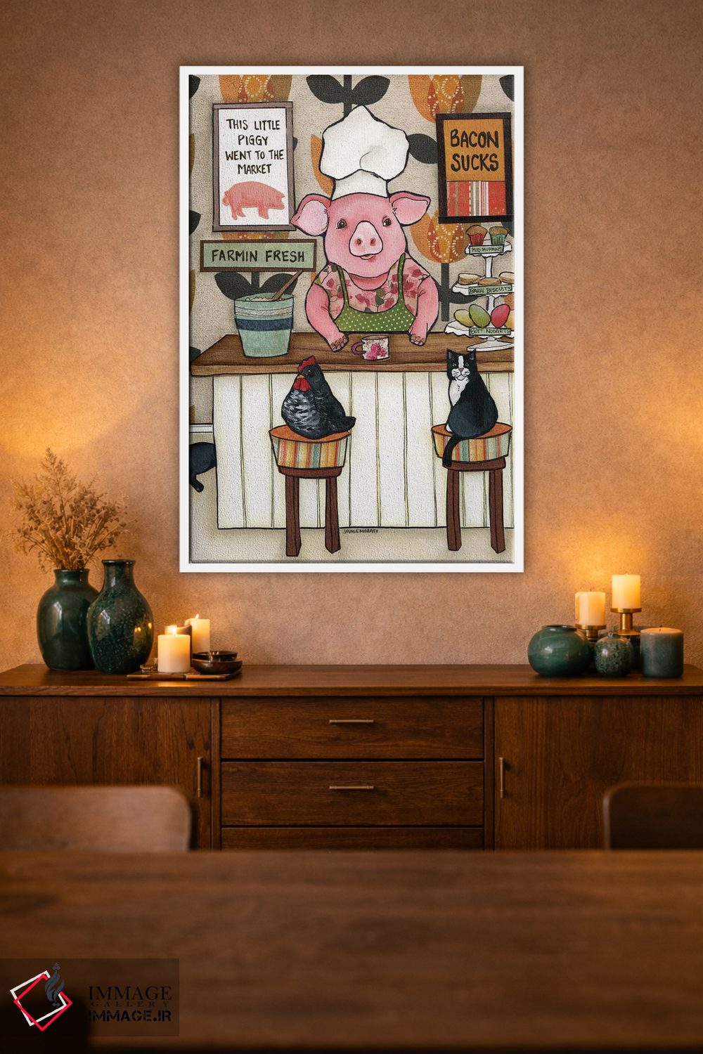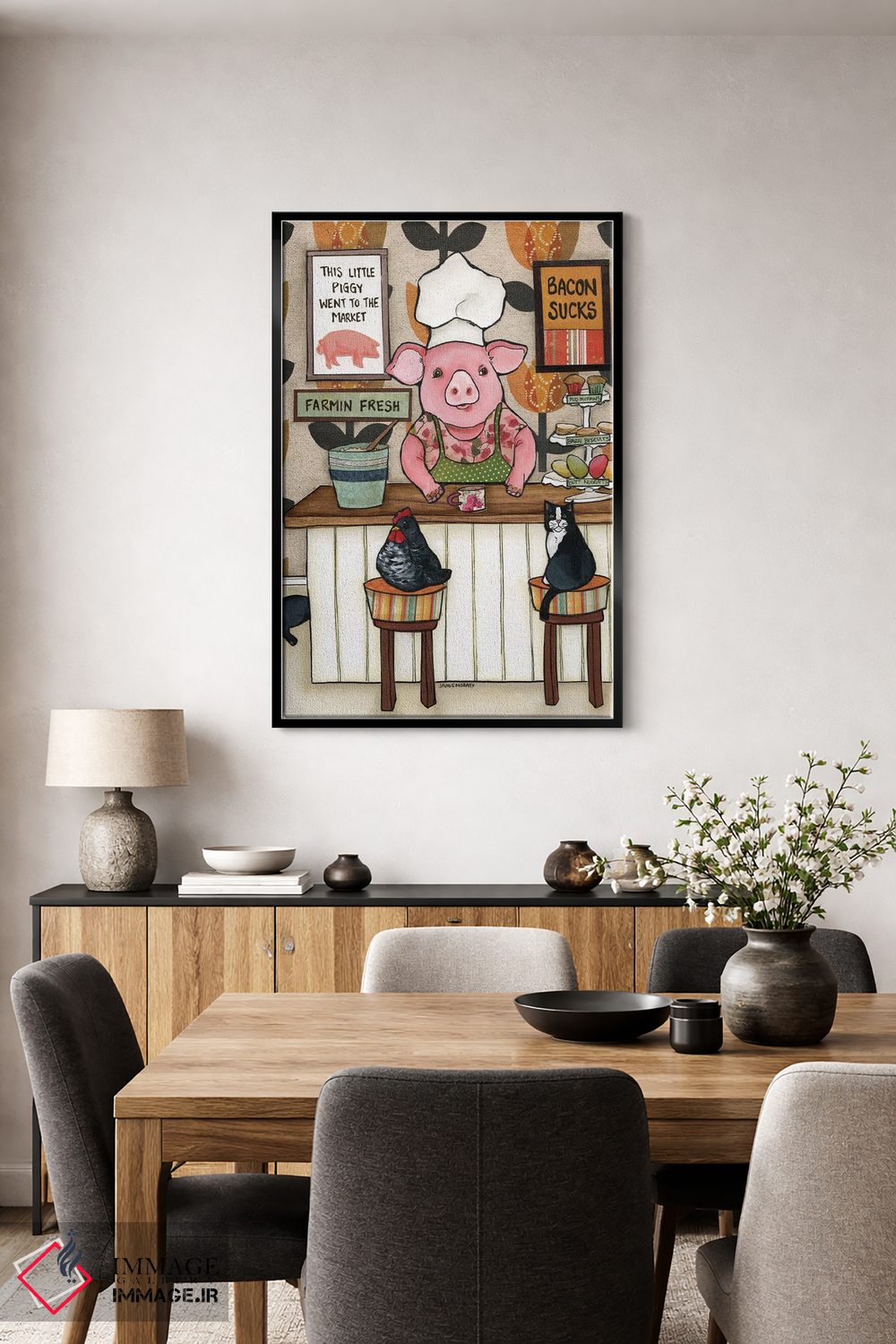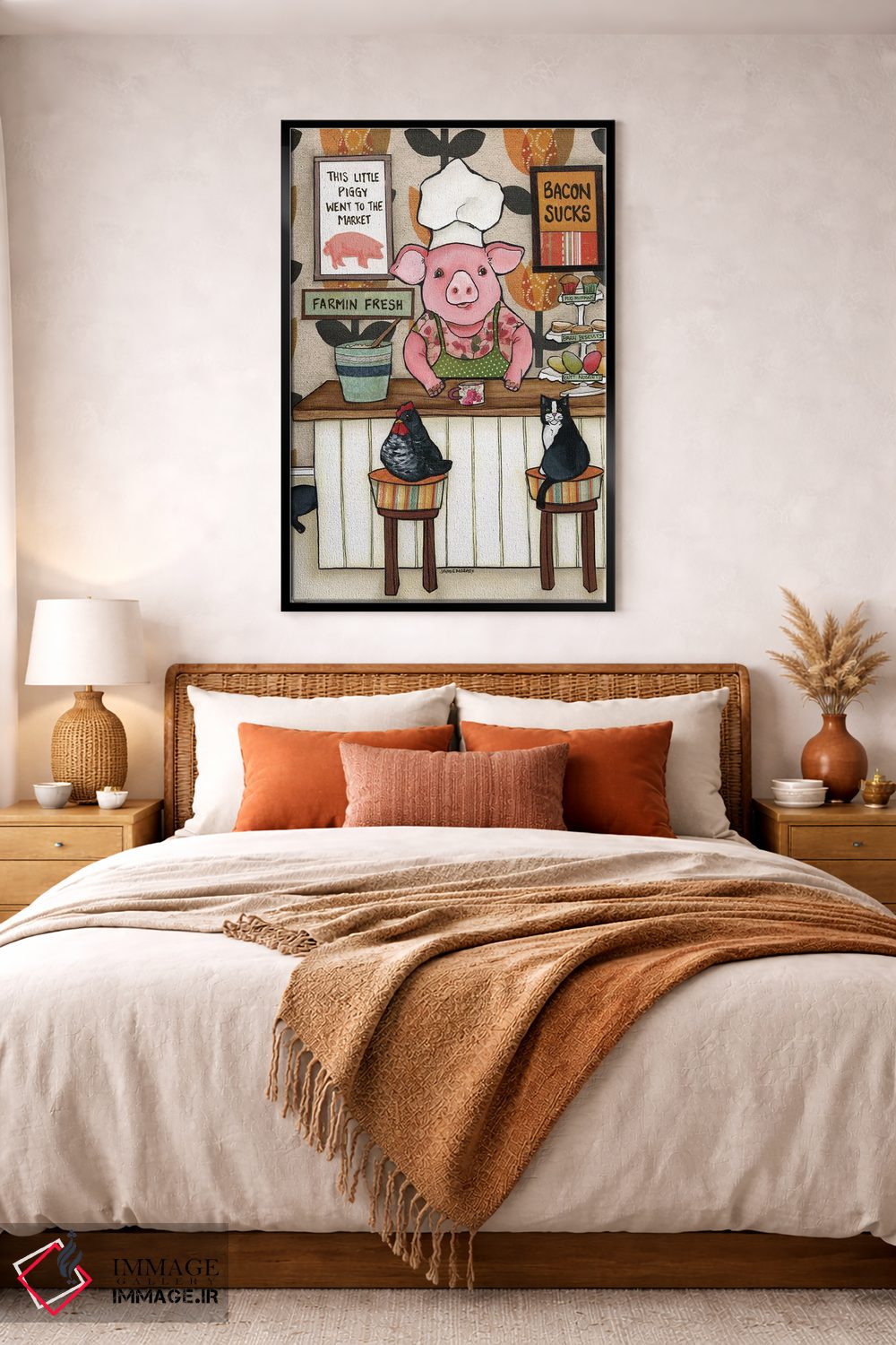 «بیکن افتضاحه» اثرِ «جیمی موراث» از آن کارهاییست که گرما و شخصیت به فضا اضافه میکند؛ برای خانههایی با چوب و پارچههای گرم انتخاب خوبیست. هر بار نگاهش میکنید، یک جزئیات تازه به چشم میآید.