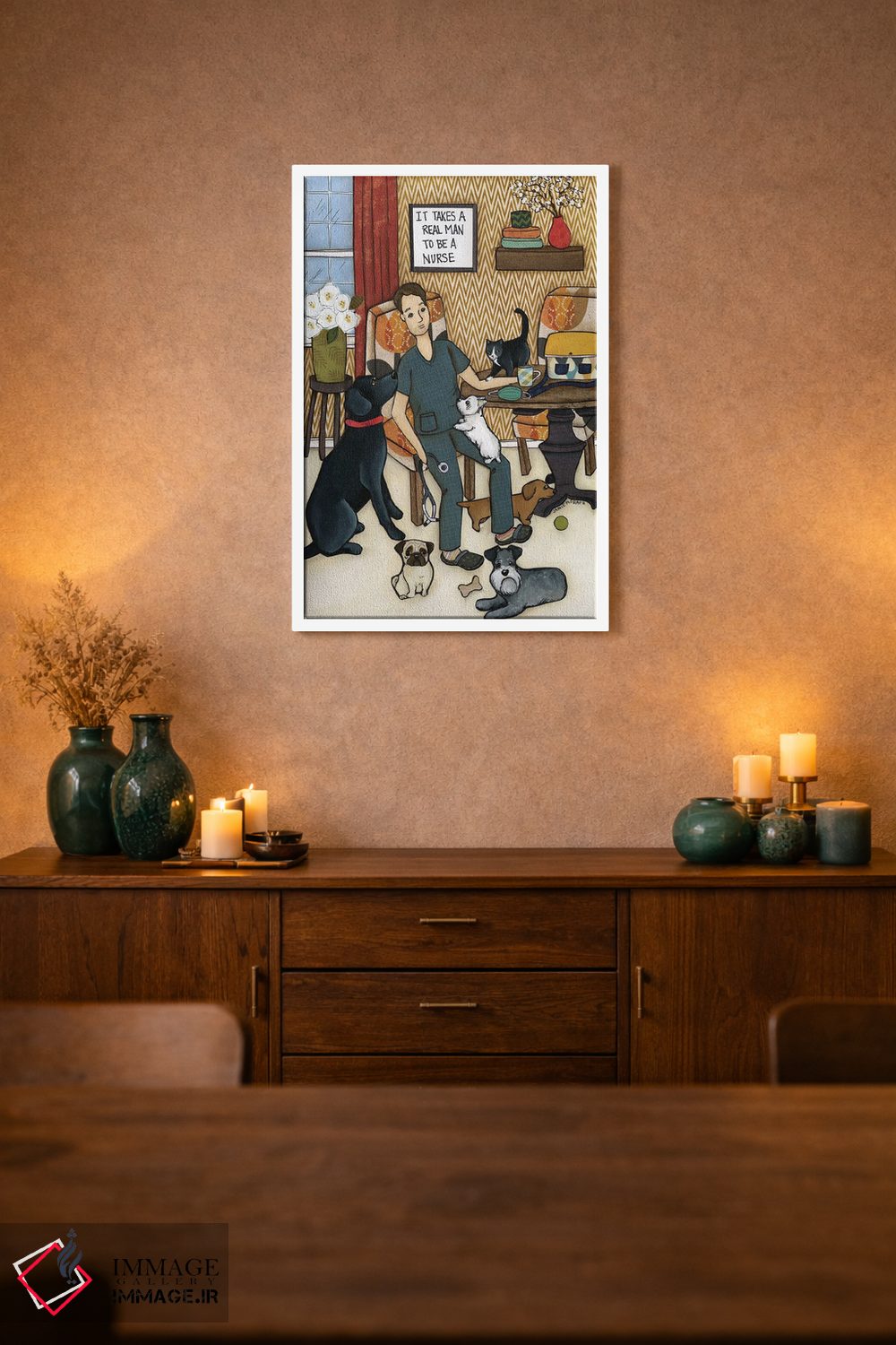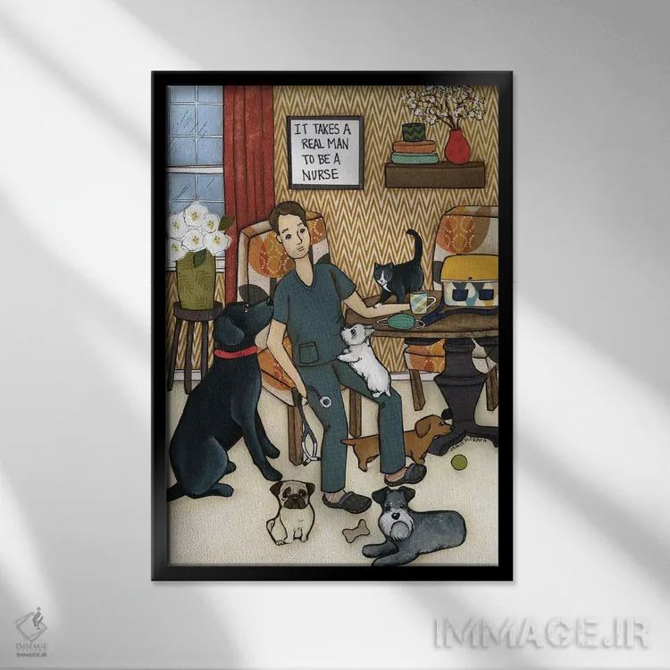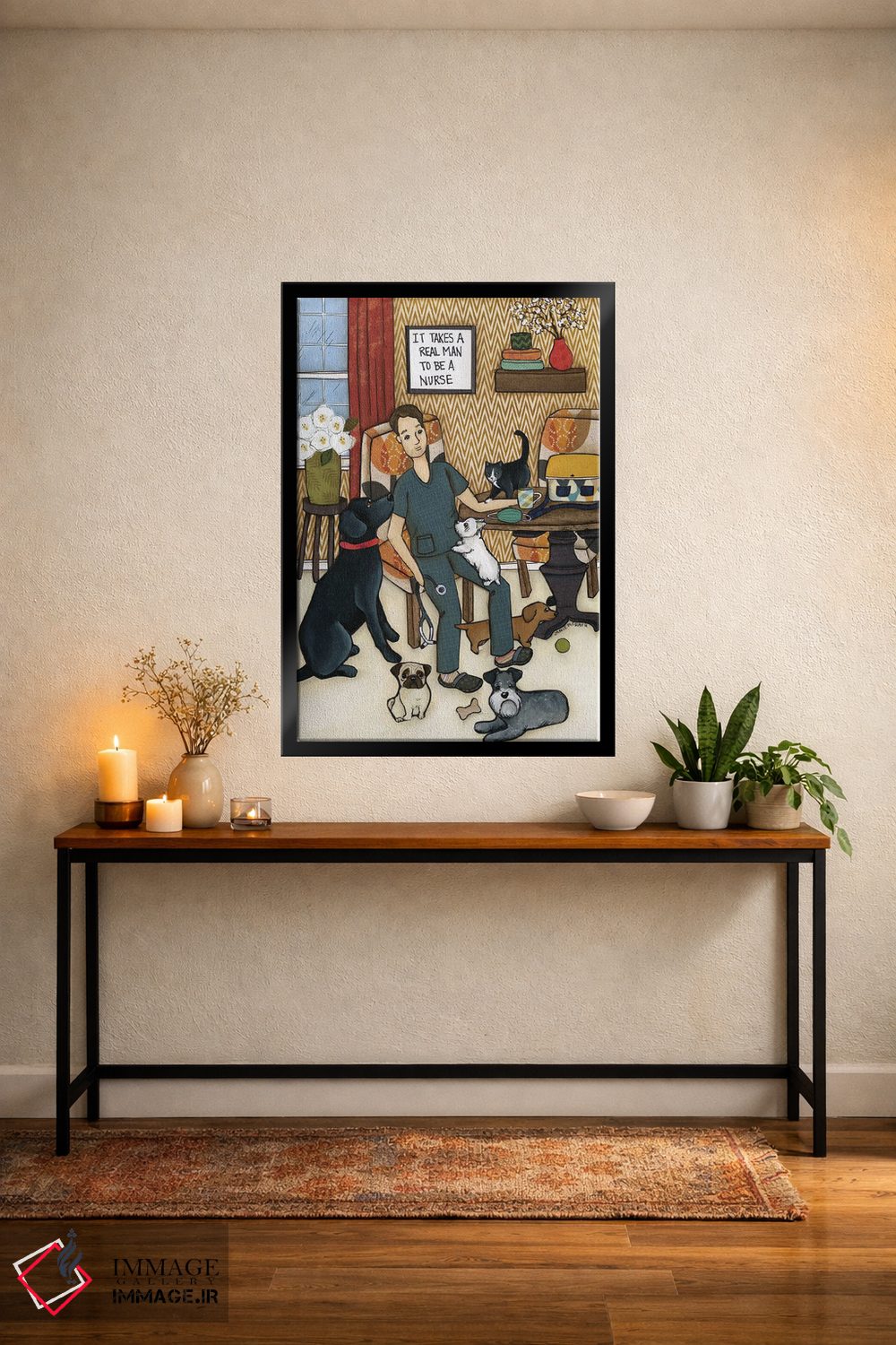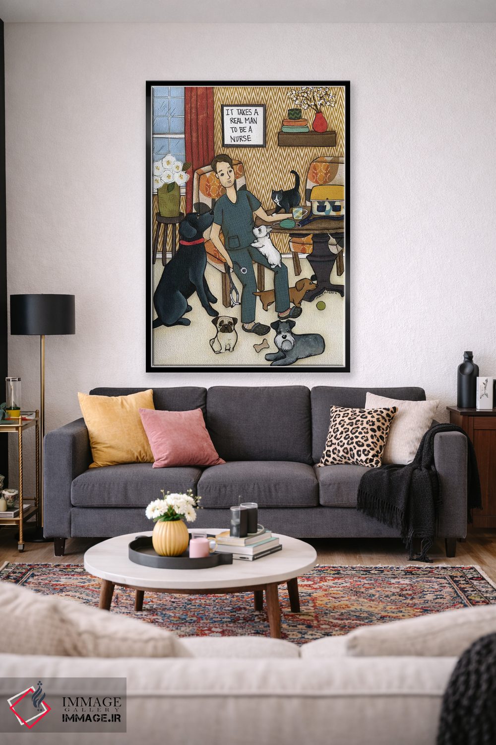 در این اثر، «یک مرد واقعی لازم است» اثرِ «جیمی موراث» تضادهای رنگی را خوشقوارهتر میکند؛ برای فضاهای مدرن با خطوط ساده پیشنهاد میشود. اگر میخواهید مهمانها مکث کنند، این اثر دلیل خوبیست.