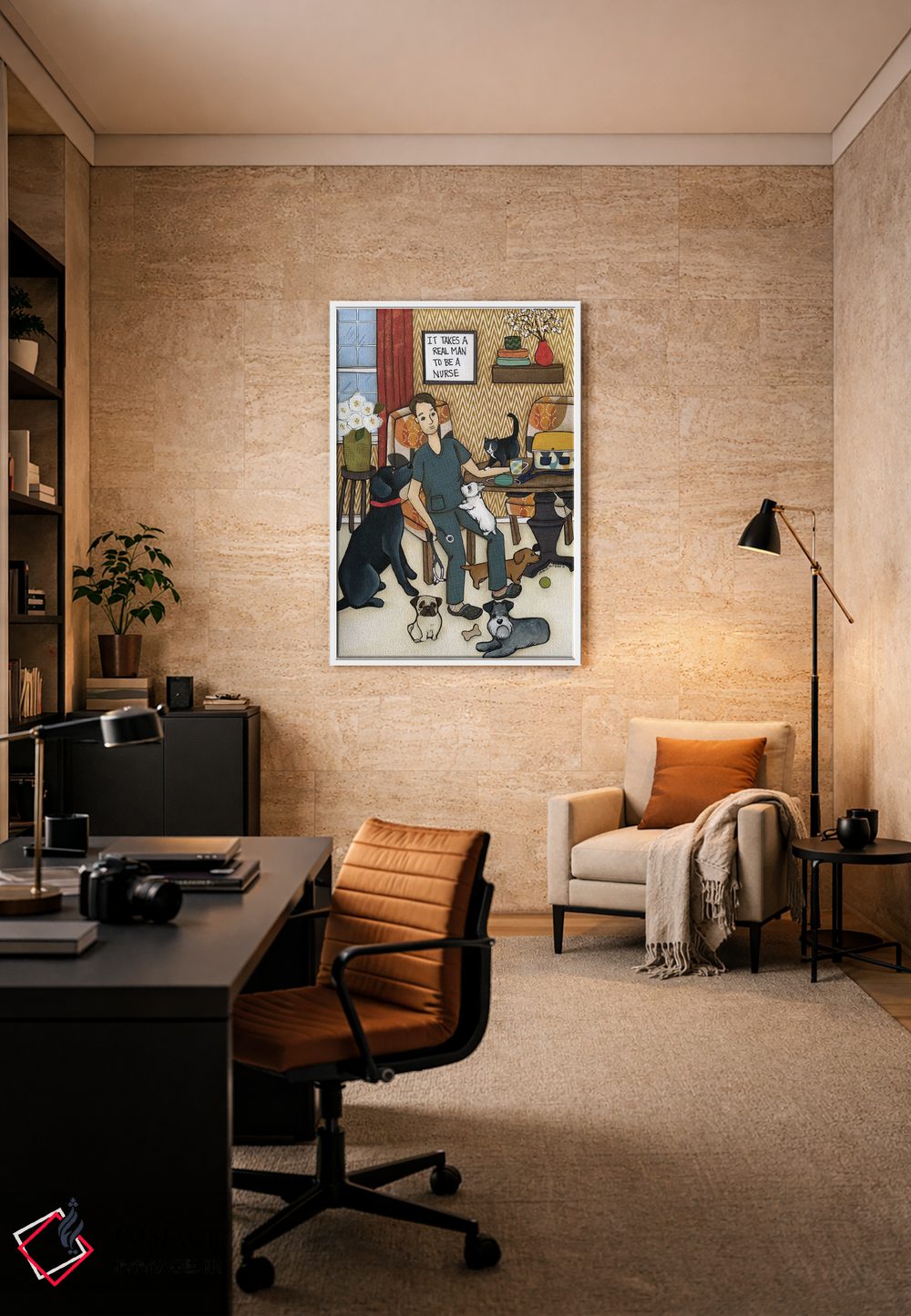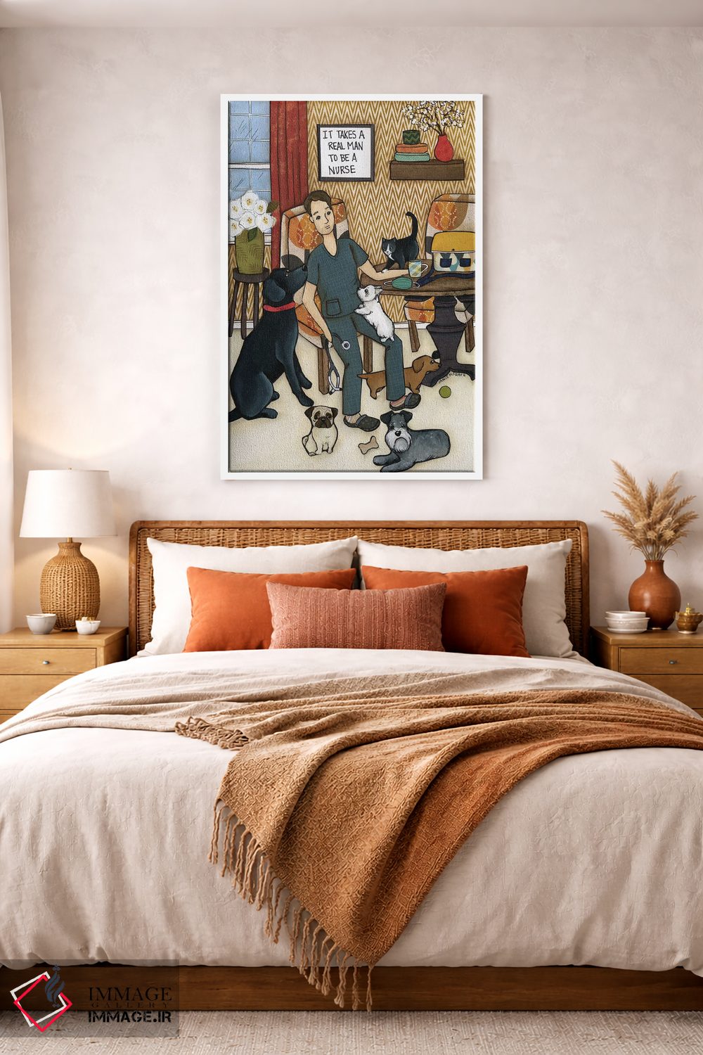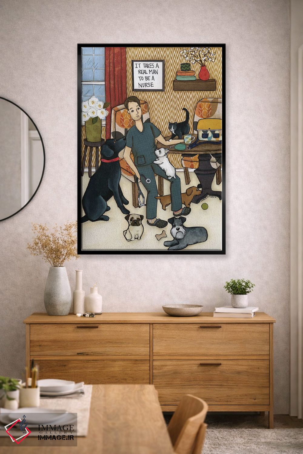 در این اثر، «یک مرد واقعی لازم است» اثرِ «جیمی موراث» تضادهای رنگی را خوشقوارهتر میکند؛ برای فضاهای مدرن با خطوط ساده پیشنهاد میشود. اگر میخواهید مهمانها مکث کنند، این اثر دلیل خوبیست.