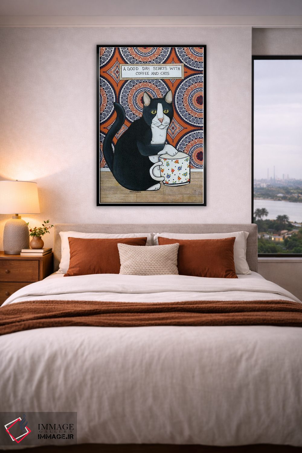 اگر به آثار حیوانات علاقه دارید، «قهوه و گربهها» اثرِ «جیمی موراث» یک لبخند ریز به چیدمان میدهد، برای اتاق کودک (بدون لحن کودکانه) گزینهٔ مناسبیست. در کنار گیاهان و نور طبیعی، جذابتر هم میشود.