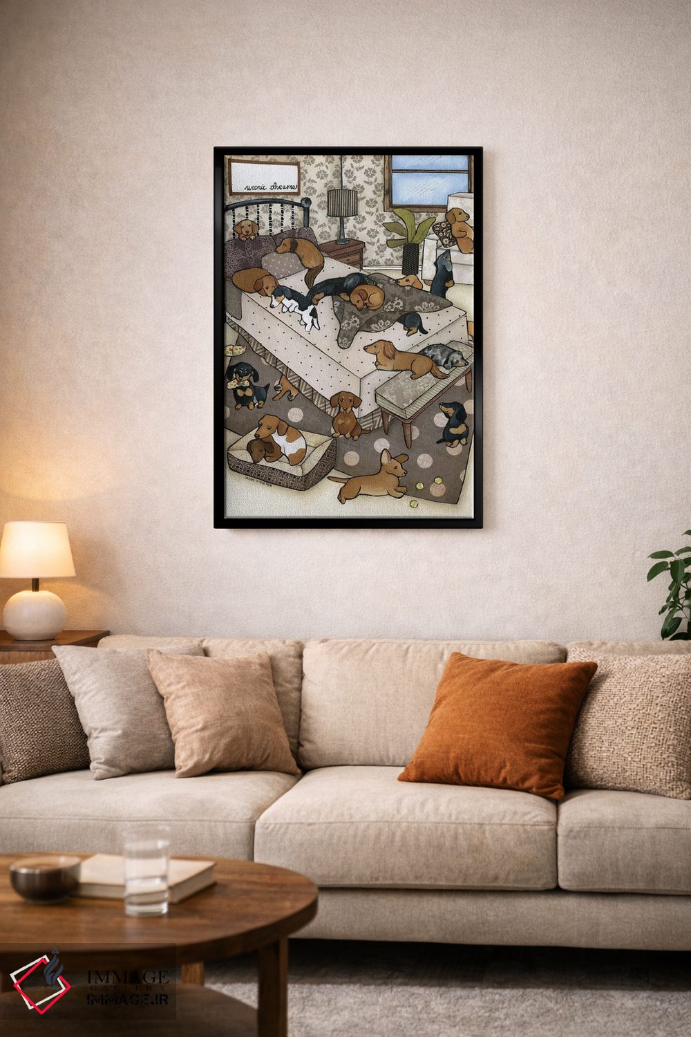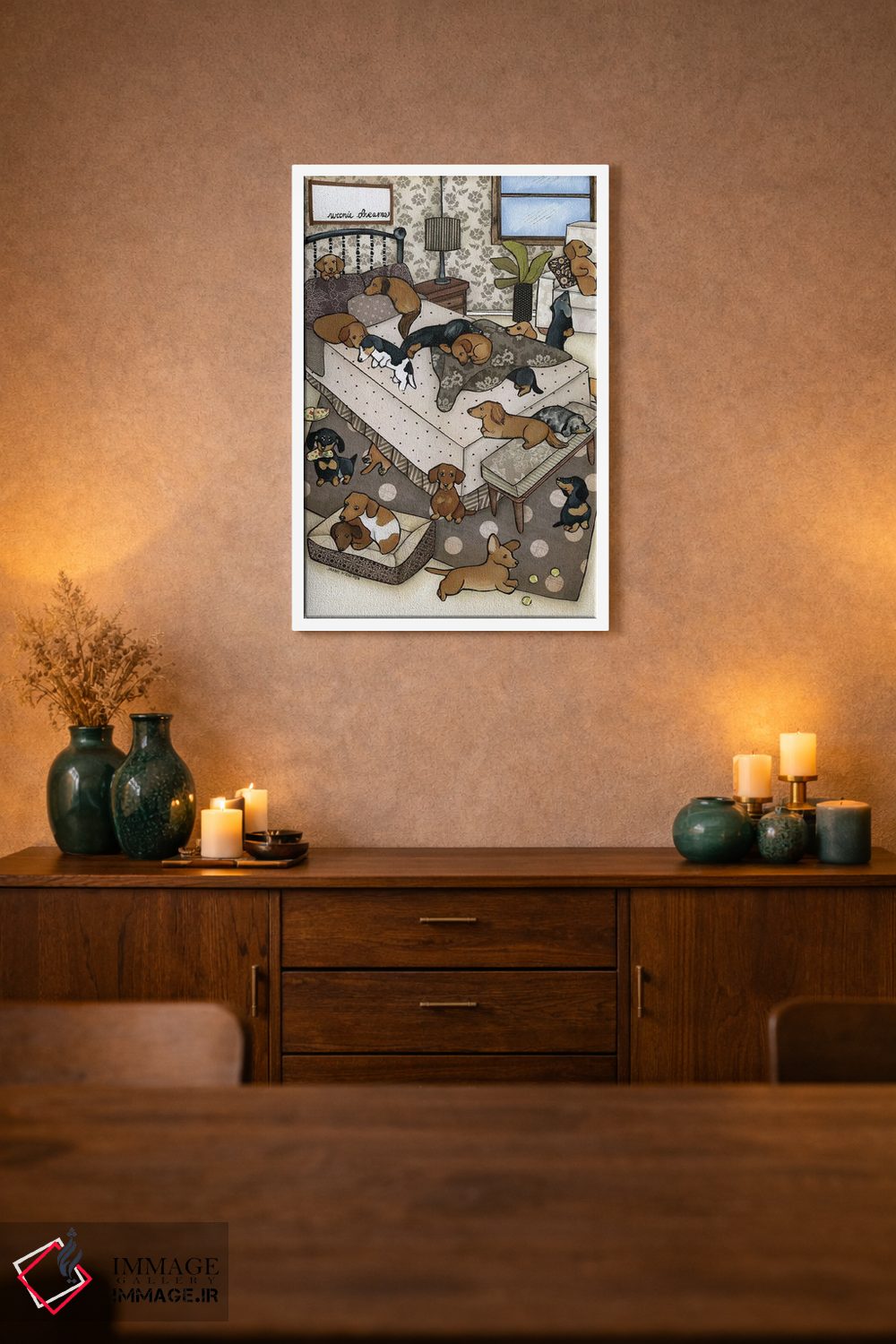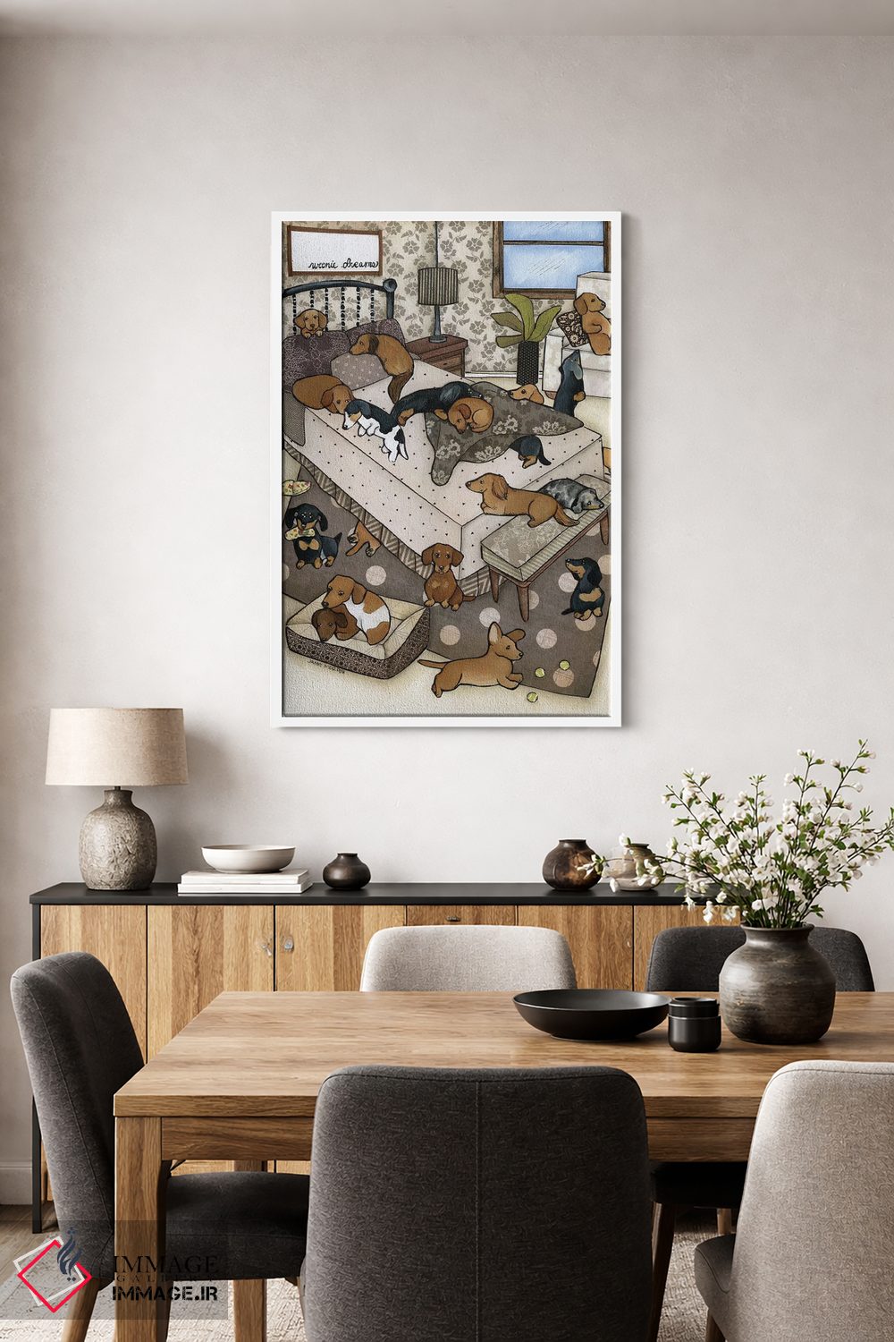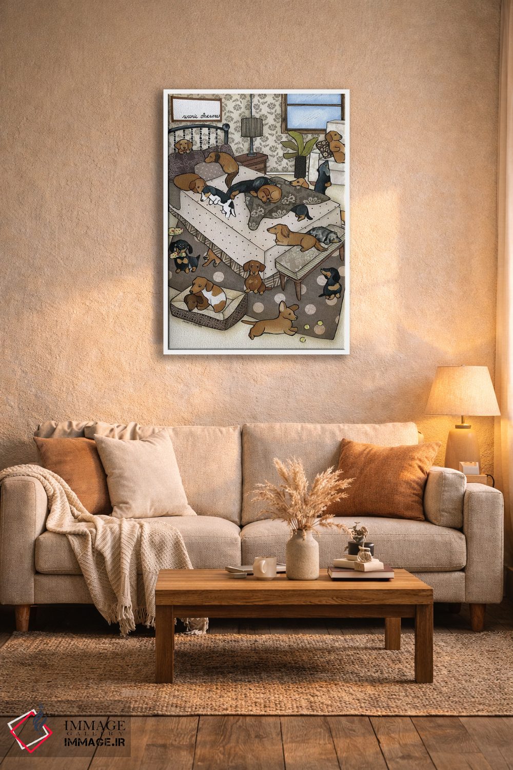 براساس پالت گرم اثر، قاب بلوط روشن (چوبی) پیشنهاد اول است و استخوانی ملایم مکمل. برای سفارشهای پروژهای با ابعاد و قابهای اختصاصی با ایماژ در تماس باشید.