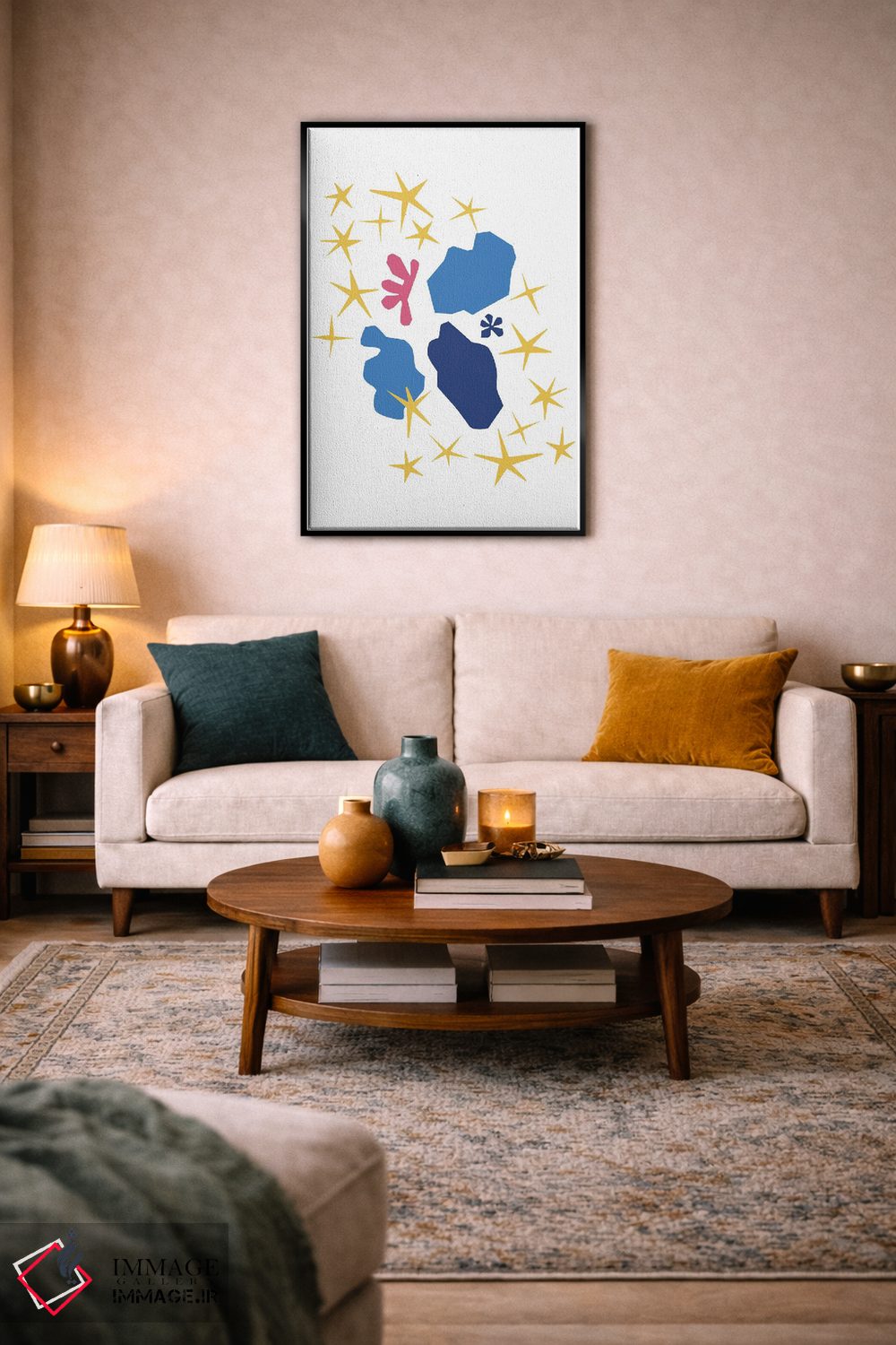«ستارههای بُرش خورده» اثرِ «مامبو آرت استودیو (استودیوی هنری)» از آن قابهایی است که کنار رنگهای خاکی و کرم، زیباتر دیده میشود؛ موضوعِ این اثر هم حسِ بهاری میدهد.