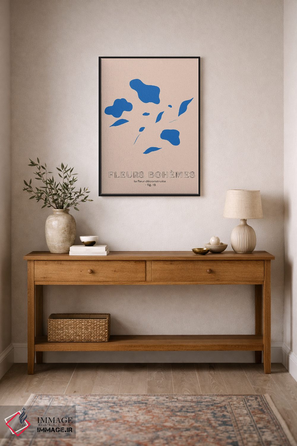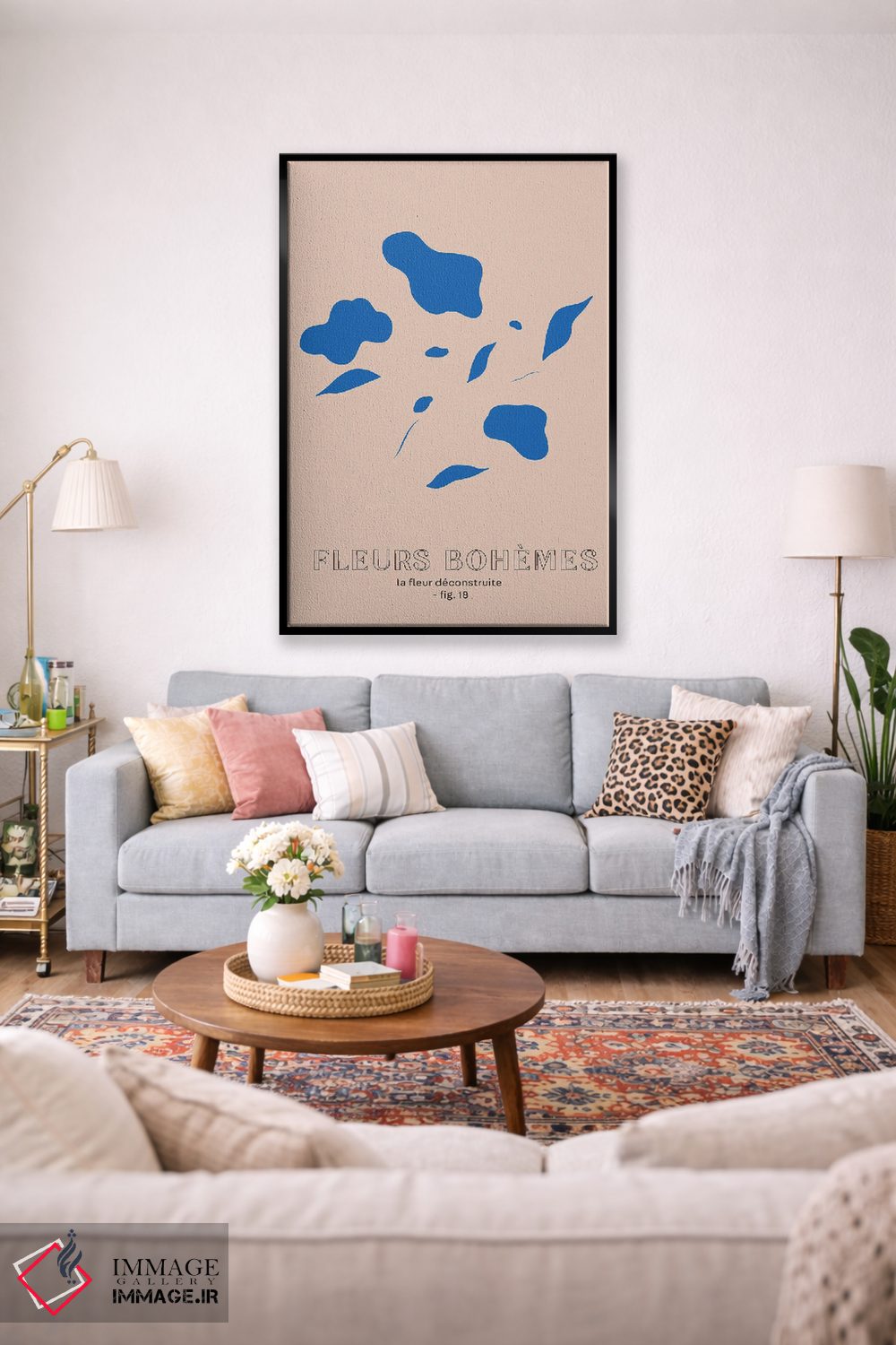 «گلهای بوهمی؛ آبی (Fleur Bohemes)» اثرِ «مامبو آرت استودیو (استودیوی هنری)» در فضای بوهمی، با کوسنها و فرشهای طرحدار خوب ست میشود؛ موضوعِ این اثر هم شخصیت میدهد.