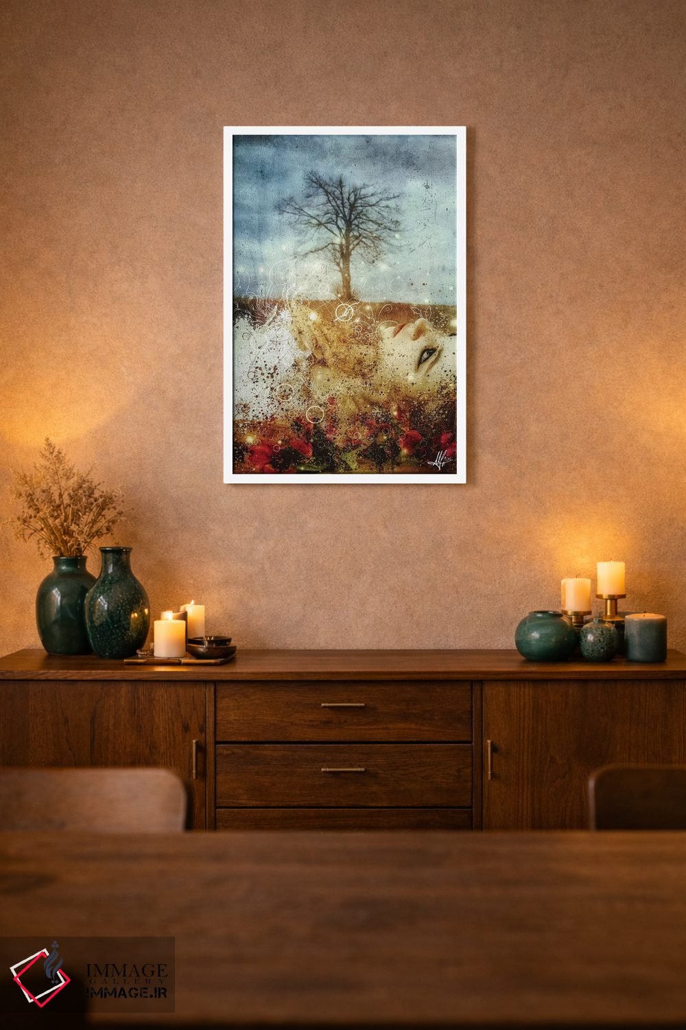 براساس پالت گرم اثر، قاب تیک گرم (چوبی) پیشنهاد اول است و مشکی مات (فریم متوسط) مکمل. برای سفارشهای پروژهای با ابعاد و قابهای اختصاصی با ایماژ در تماس باشید.