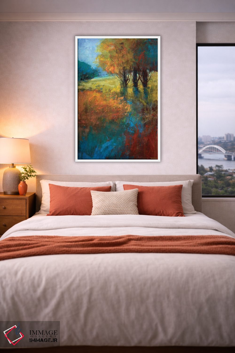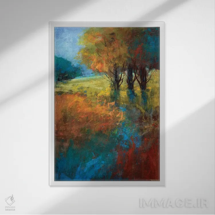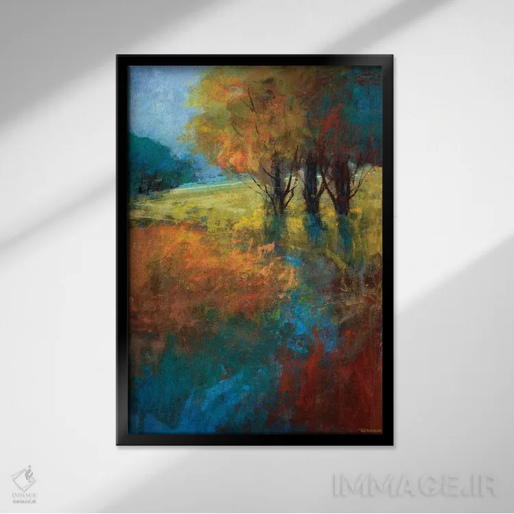 براساس پالت ترکیبی اثر، قاب تیک گرم (چوبی) پیشنهاد اول است و مشکی مات (فریم متوسط) مکمل. برای سفارشهای پروژهای با ابعاد و قابهای اختصاصی با ایماژ در تماس باشید.