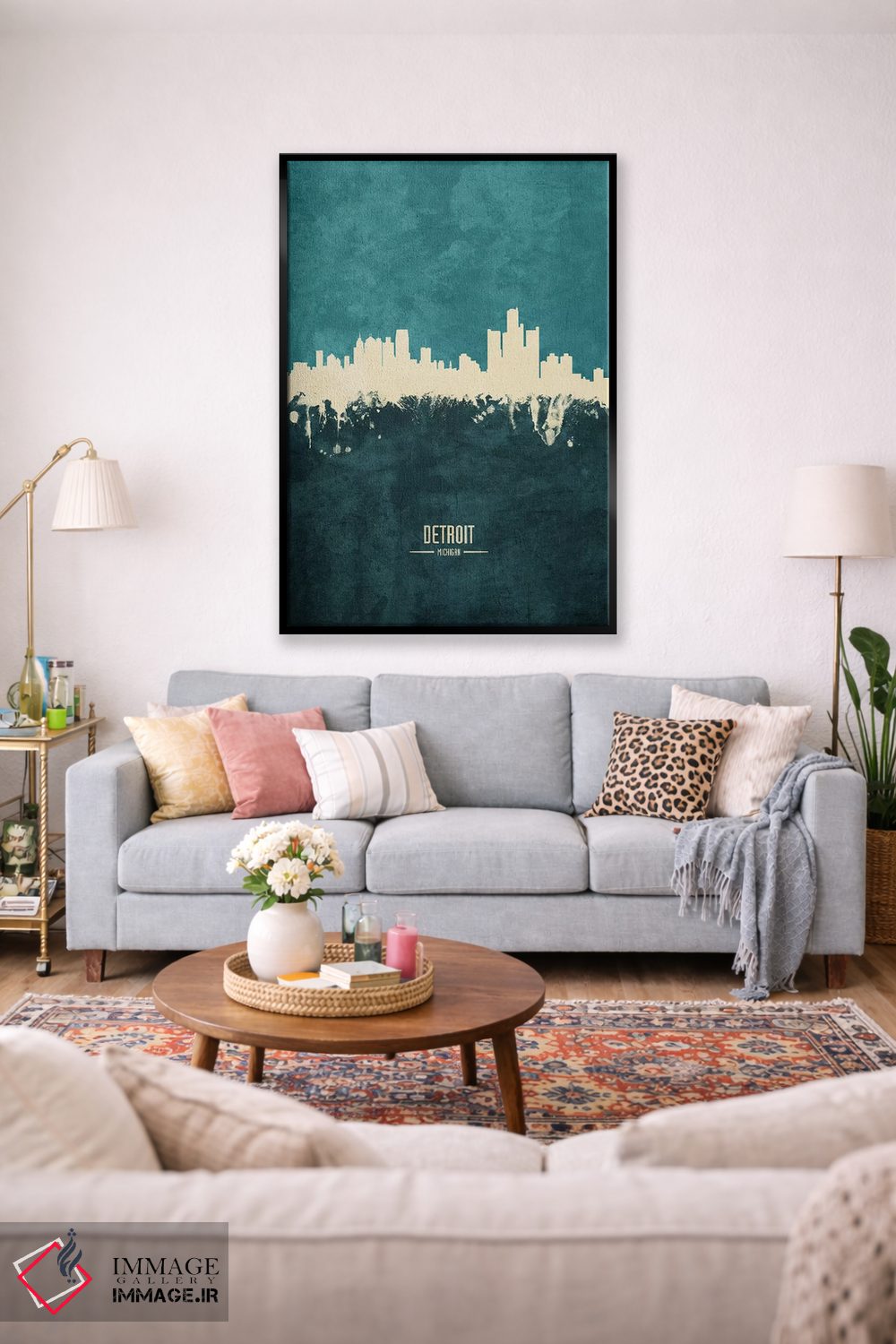 در «منظرهٔ خط افق دیترویت، میشیگان»، اثرِ «مایکل تامپست» موضوعِ این اثر را با اجرای پرداختِ هنری مطرح میکند؛ برای فضاهای زنانه، لطیف یا حتی مینیمال، کاملاًً قابل چیدمان است.