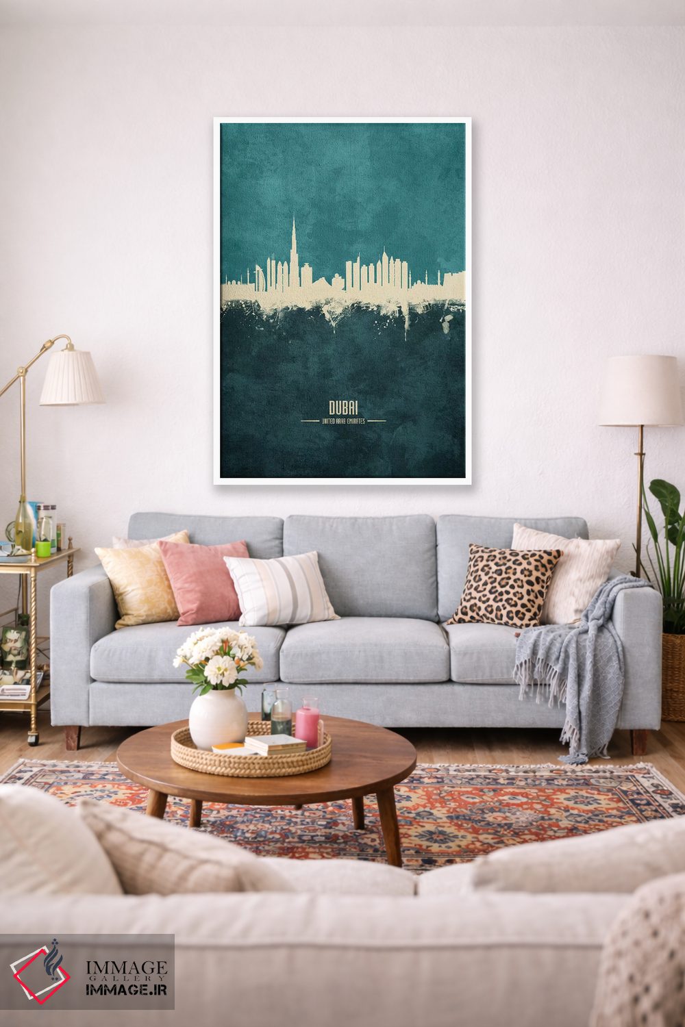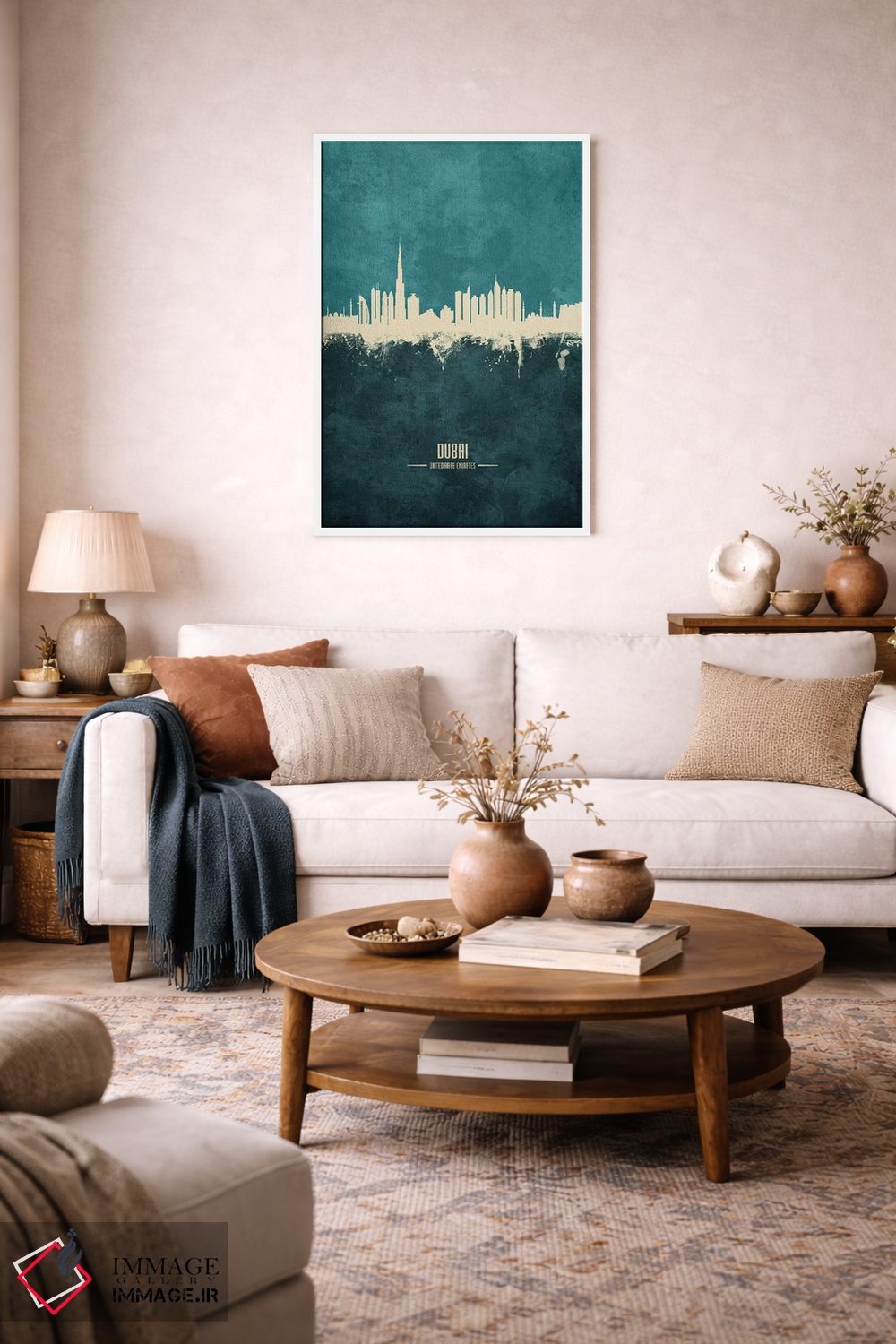 برای نشیمنهای روشن و دیوارهای سفید/طوسی، «منظرهٔ خط افق دبی، امارات متحده عربی» اثرِ «مایکل تامپست» با موضوعِ این اثر انتخابی تمیز و چشمنواز است.