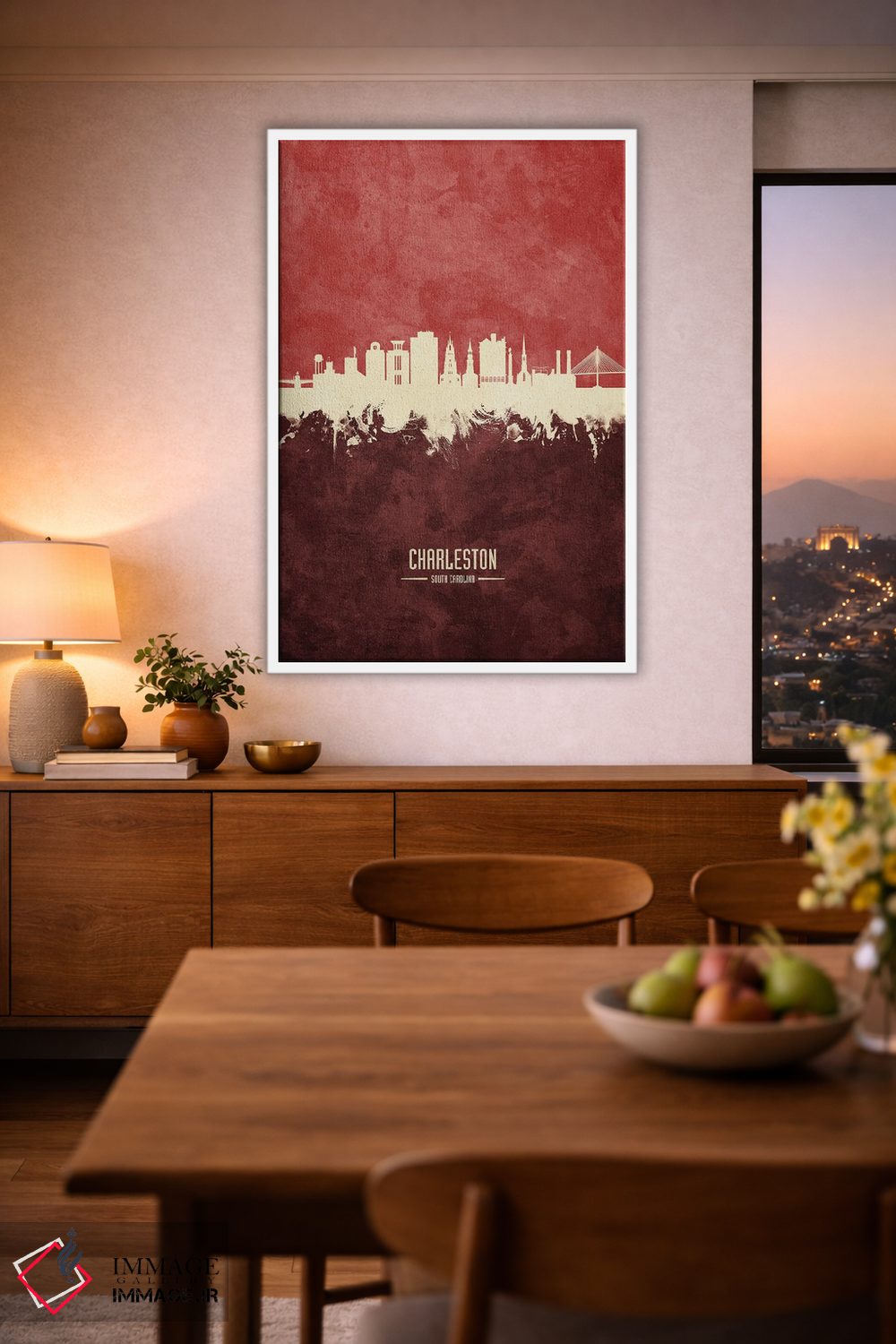 یک انتخاب مدرن، با روایتی مینیمال و مرتب—«نمای افق چارلستون با رنگ زرشکی» اثرِ «مایکل تامپست».