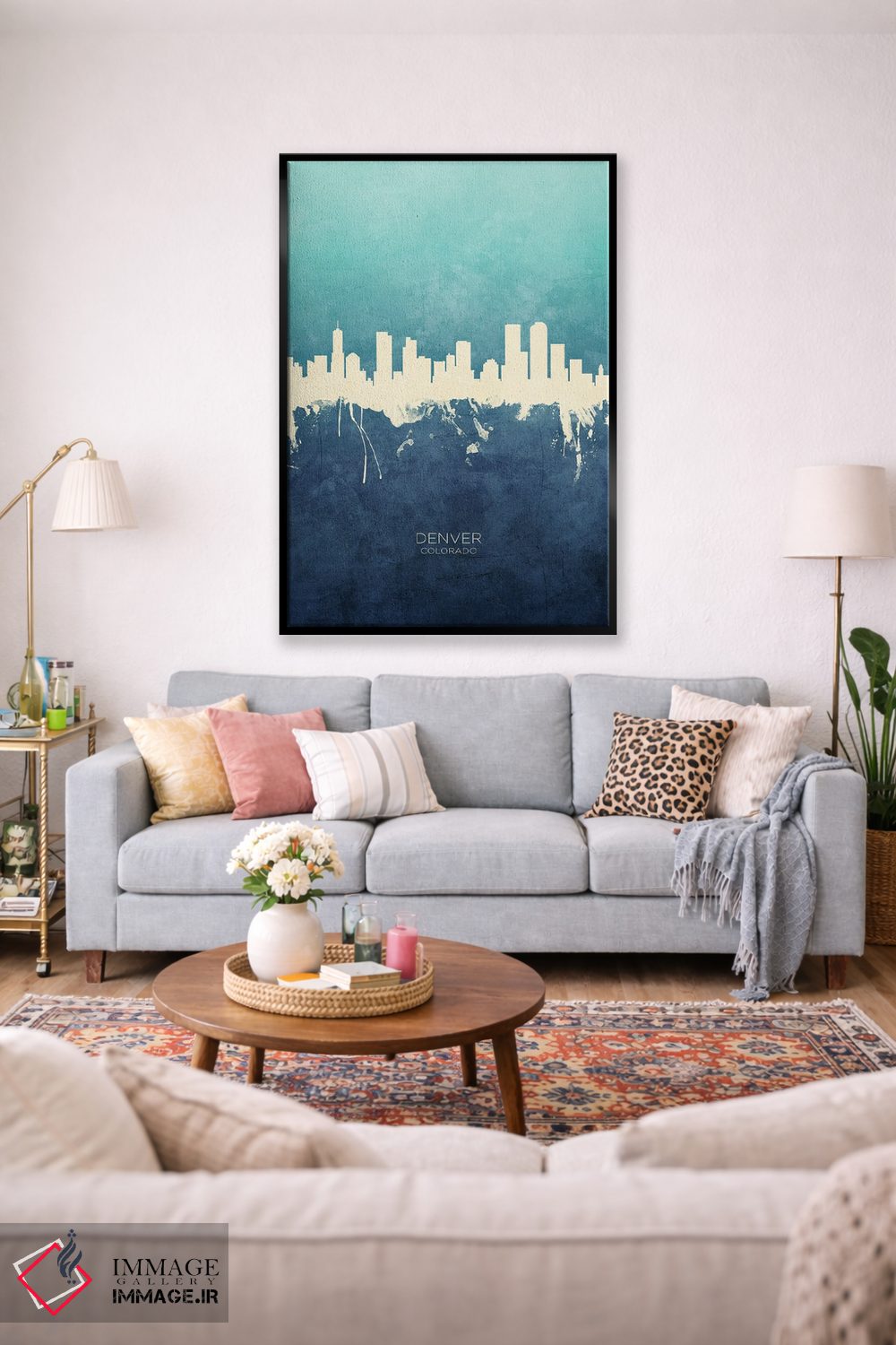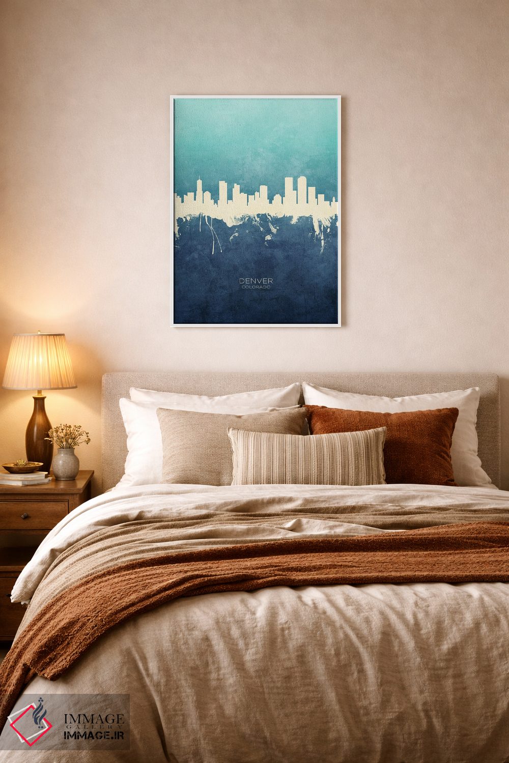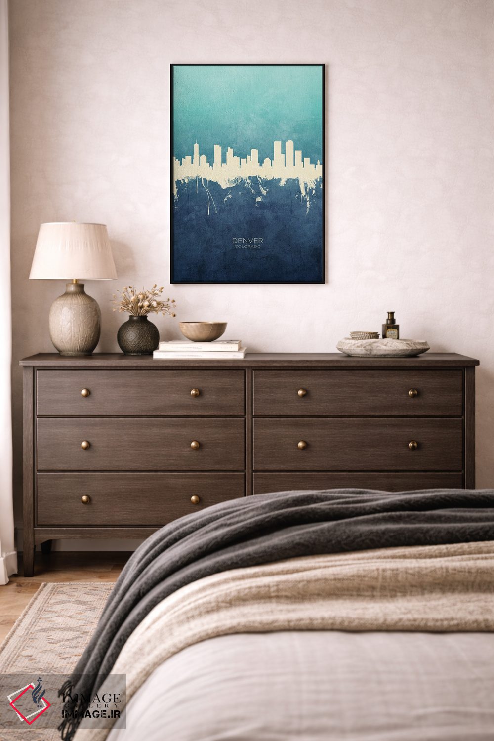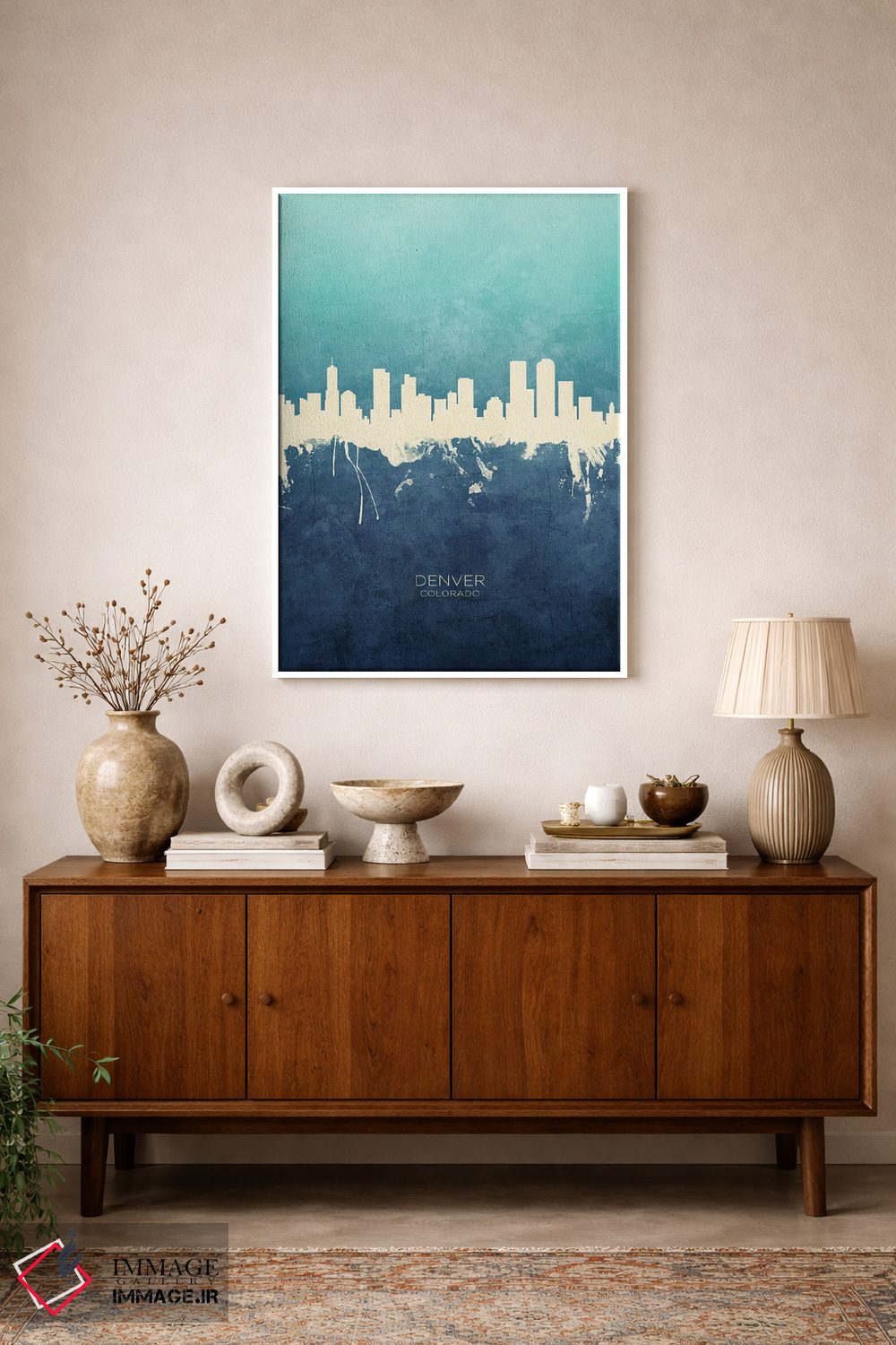 ترکیب این اثر با سبک پرداختِ هنری یعنی طراوتِ کنترلشده؛ دقیقاًً چیزی که یک دیوار شیک لازم دارد—«نمای افق دنور، کلرادو با رنگ سرمهای و فیروزهای» اثرِ «مایکل تامپست».