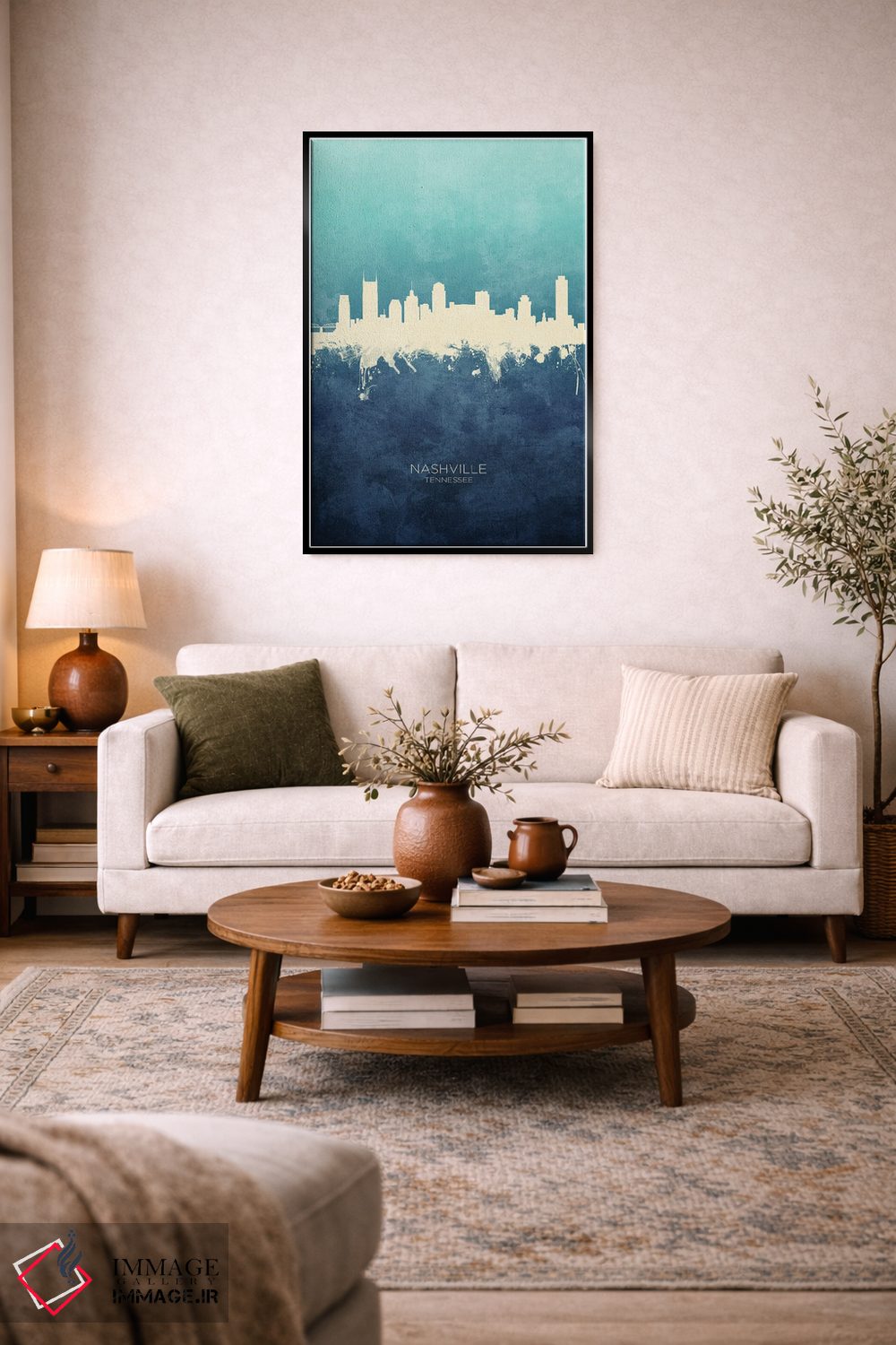 تابلو دکوراتیو نمای افق نشویل، تنسی با رنگ سرمه ای و فیروزه ای اثر مایکل تامپست - نمای روبه‌رو روی دیوار