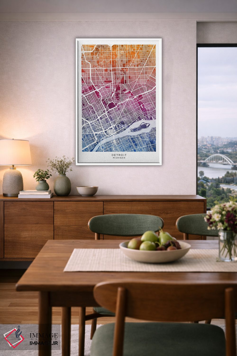 «نقشه دیترویت آبی—صورتی» اثرِ «مایکل تامپست» با حس هنری، این اثر را به دیوار میآورد؛ برای فضاهای کمجزئیات و رنگهای خنثی، عالی است.