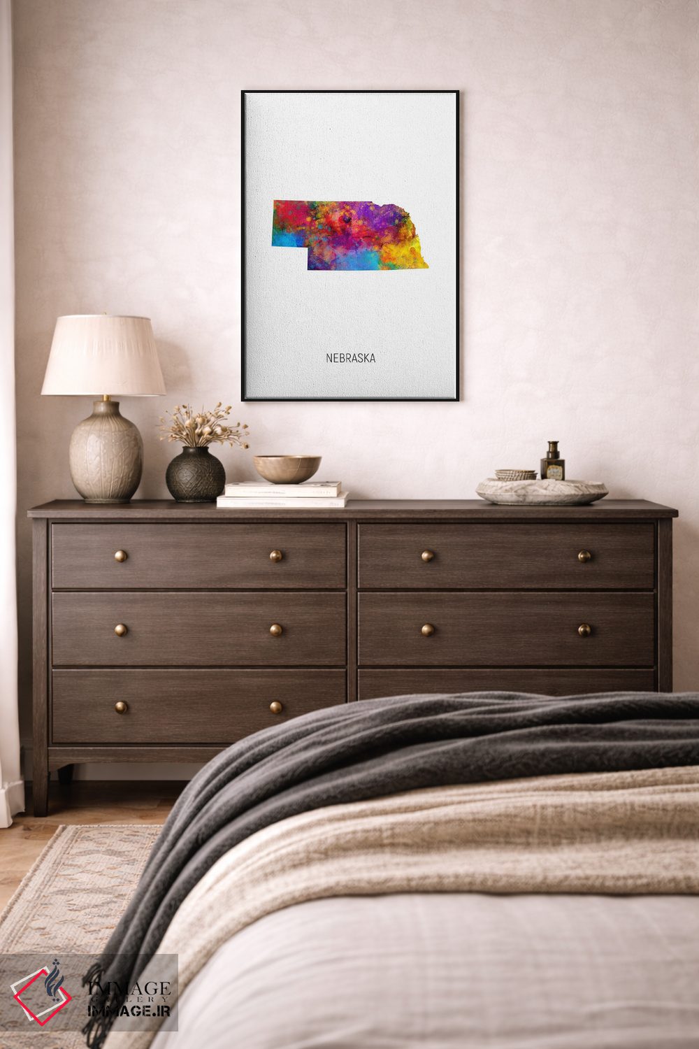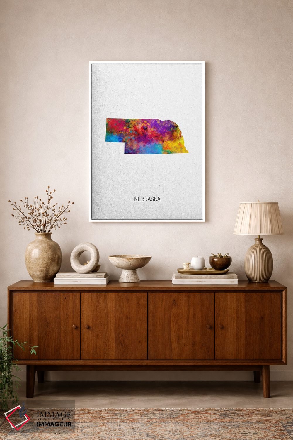 «نقشهٔ نبراسکا» اثرِ «مایکل تامپست» ترکیب خوبی برای کنار قابهای ساده و خطوط تمیزِ دکوراسیون است.