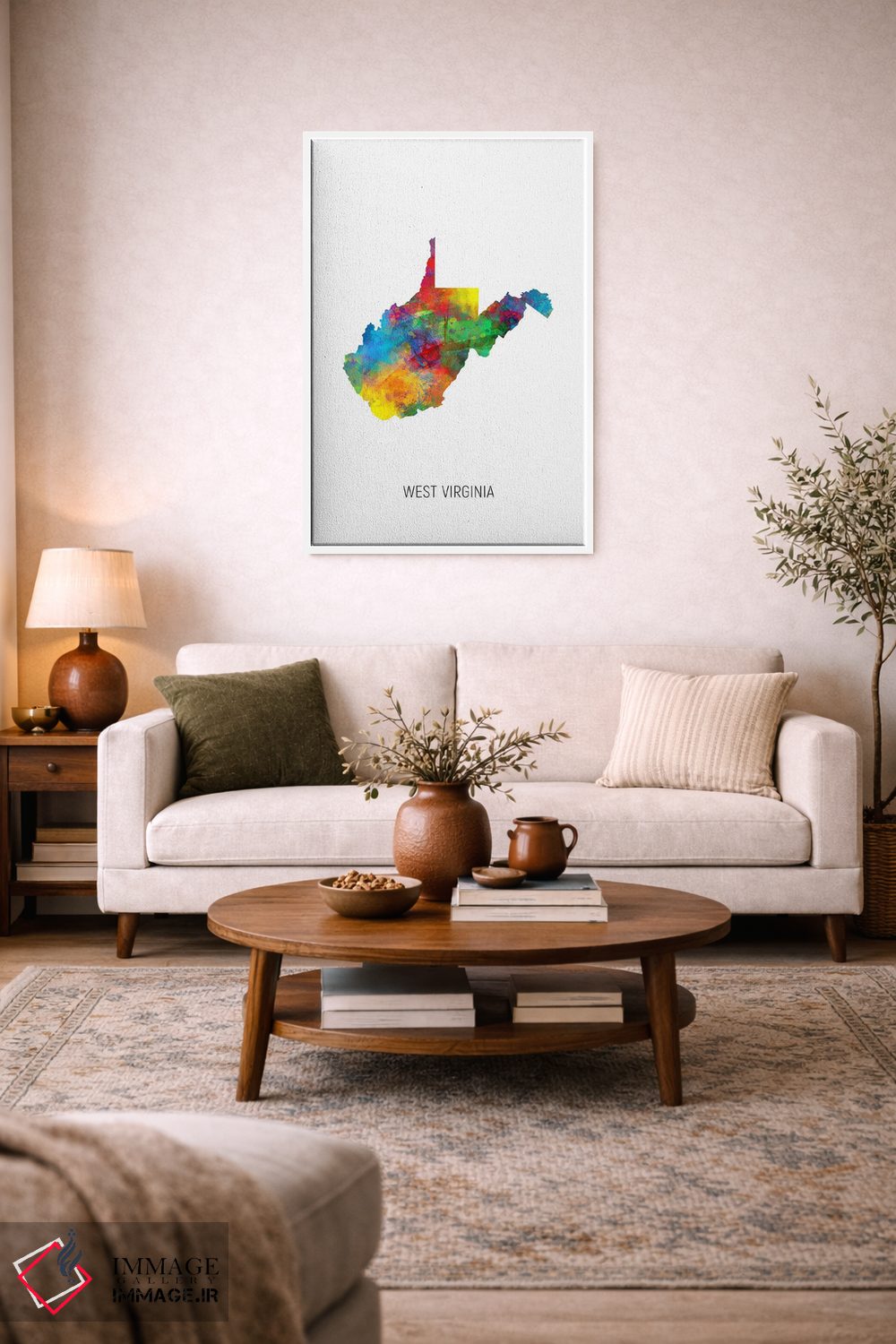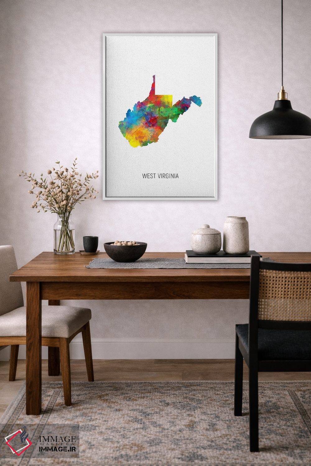اگر دوست دارید هماهنگی کاملتر شود، رنگِ سفید را در گلدان یا آباژور هوشمندانه استفاده کنید تا نگاه به سمت اثر هدایت شود.