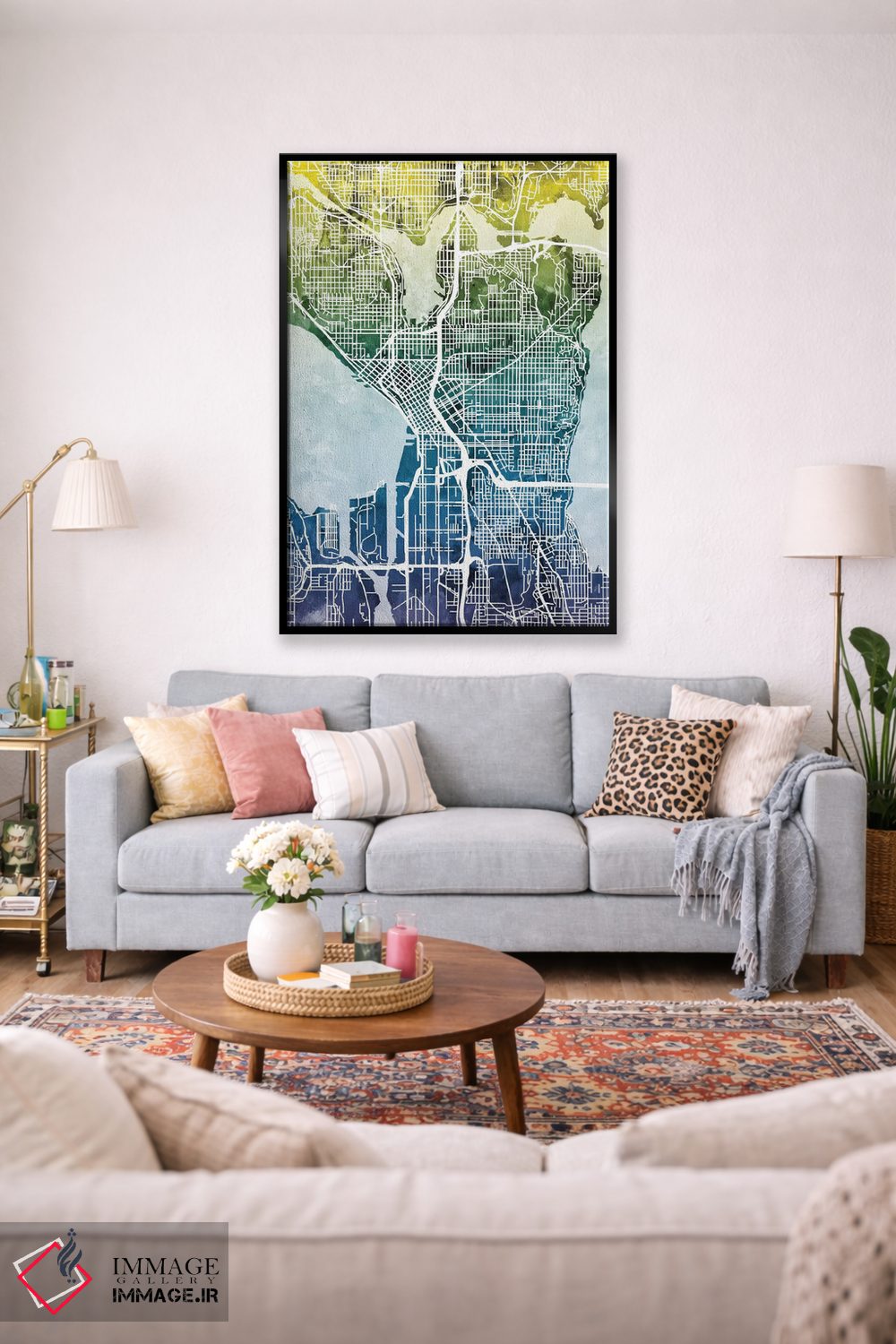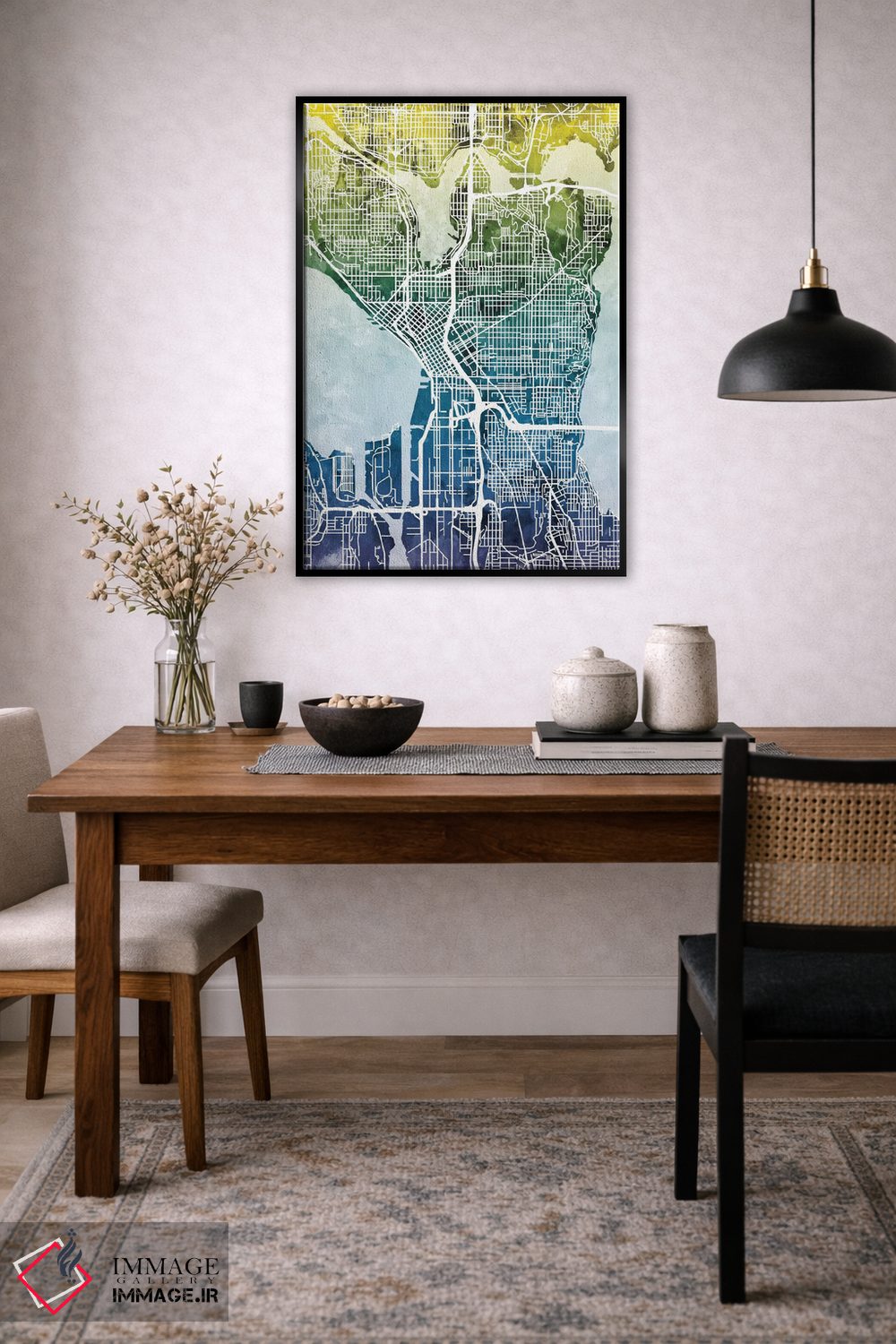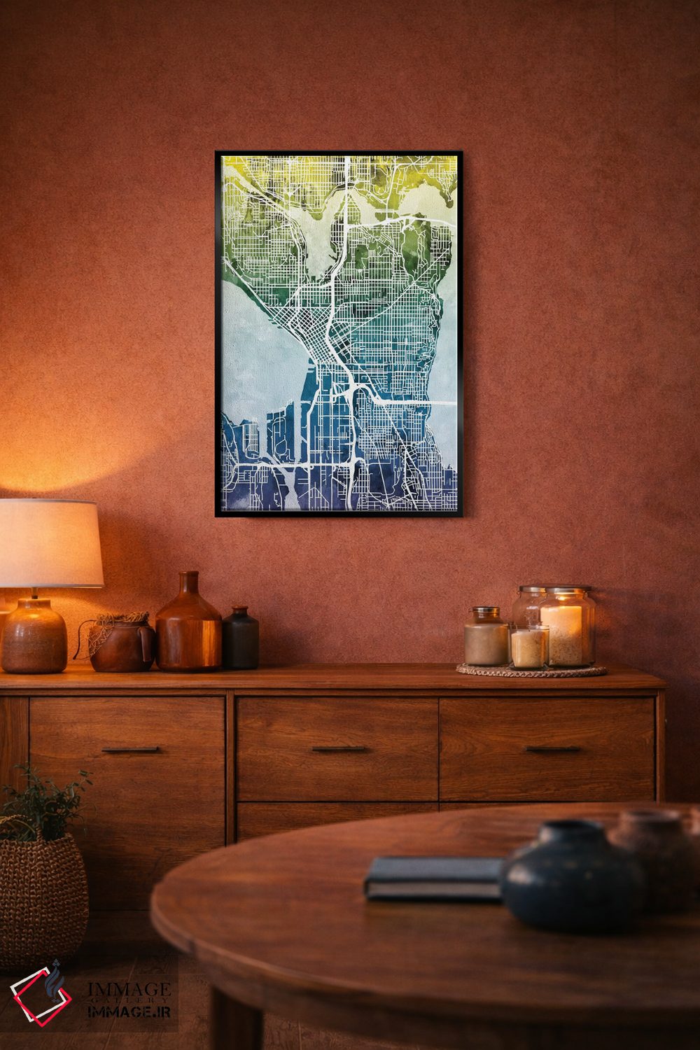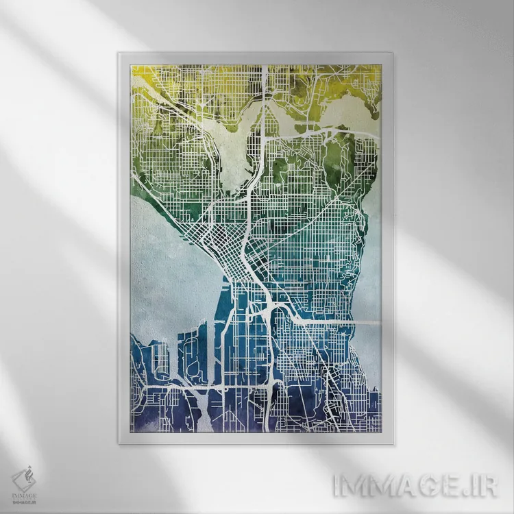 «Washington، USA، نقشه گرباورها سیاتل، واشینگتن، آمریکا» اثرِ «مایکل تامپست» در قالب هنری، به فضا عمق و ریتم میدهد؛ برای کنار مبلمان ساده و نورپردازی گرم عالی است.