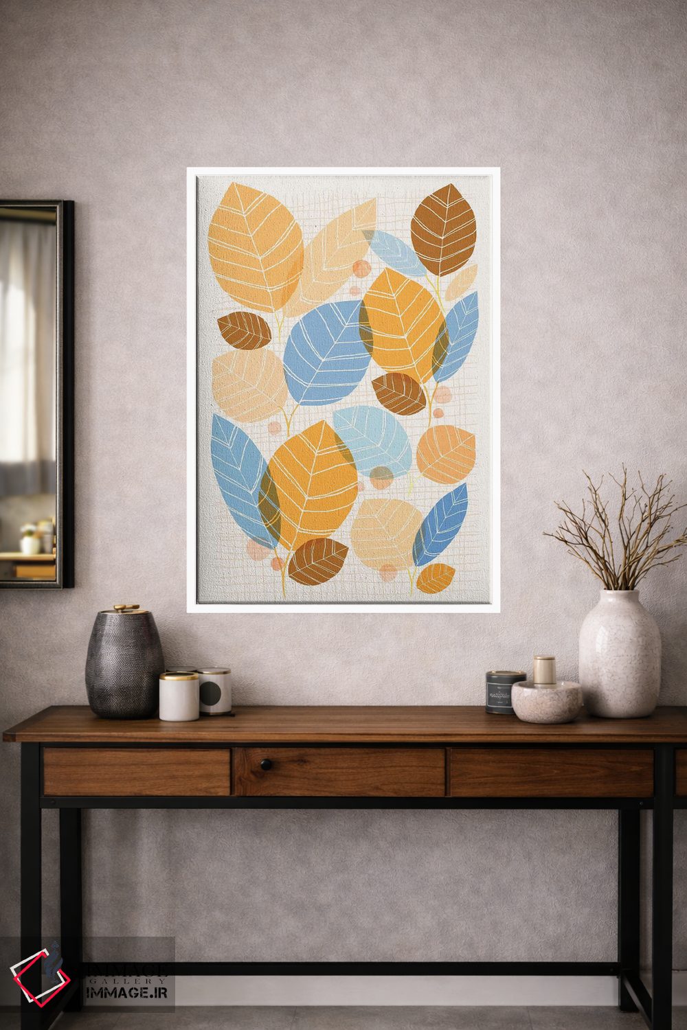 براساس پالت ترکیبی اثر، قاب بلوط روشن (چوبی) پیشنهاد اول است و استخوانی ملایم مکمل. برای سفارشهای پروژهای با ابعاد و قابهای اختصاصی با ایماژ در تماس باشید.
