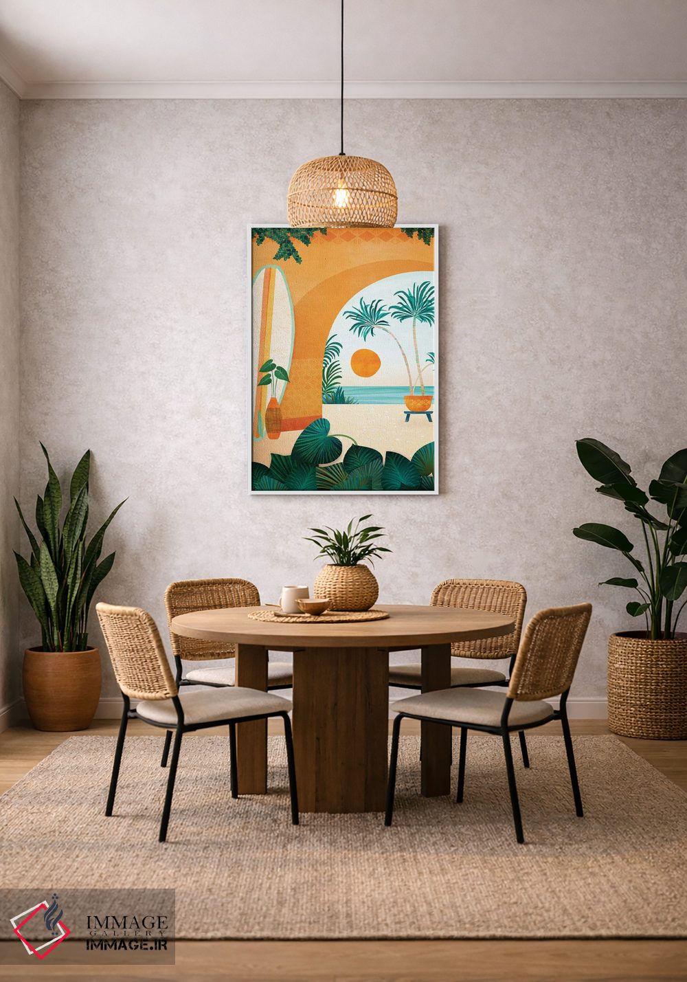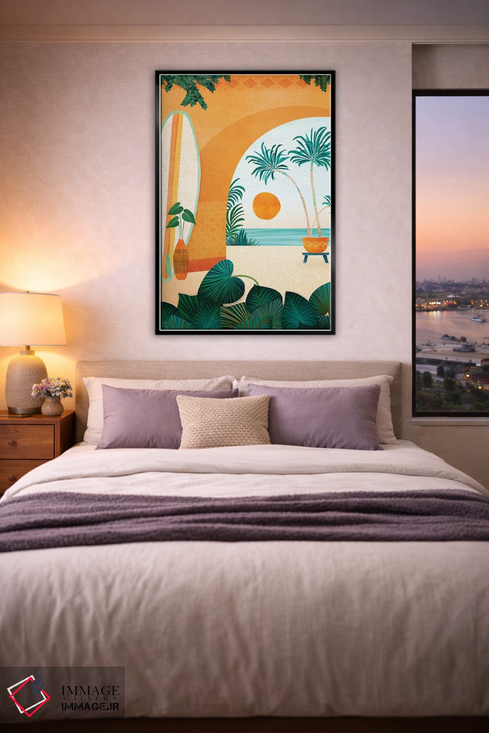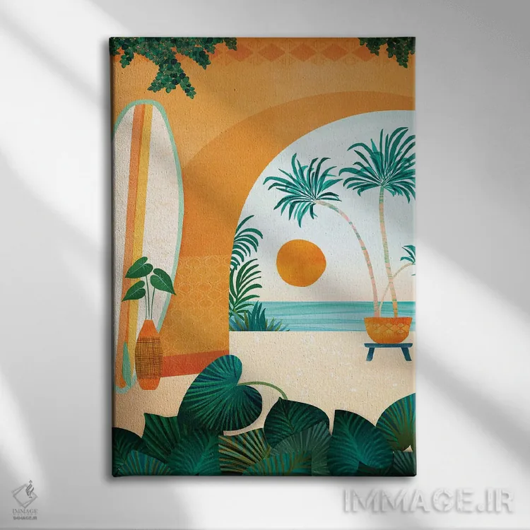 اگر به دکورهای طبیعی علاقه دارید، «اقامتگاه موجسواری کنار دریا» اثرِ «مدرن تروپیکال (برند/استودیوی هنری)» جزئیات نزدیک را چشمنواز نشان میدهد، برای اتاق خواب گزینهٔ مناسبیست. با قاب روشن یا چوبی، حس طبیعیتری پیدا میکند.