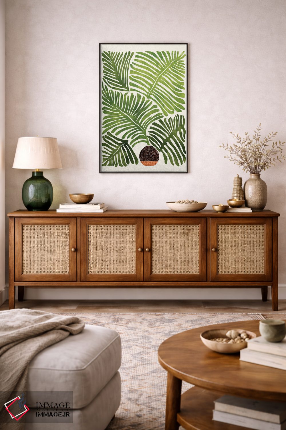 برای ستکردن هوشمندانه، یک رگه از سبز را در یک گلدان کمینهگرا جا بدهید تا تعادل بین گرم و سرد بهتر برقرار شود. انتخاب قاب هم میتواند این اکسنت را تقویت کند.